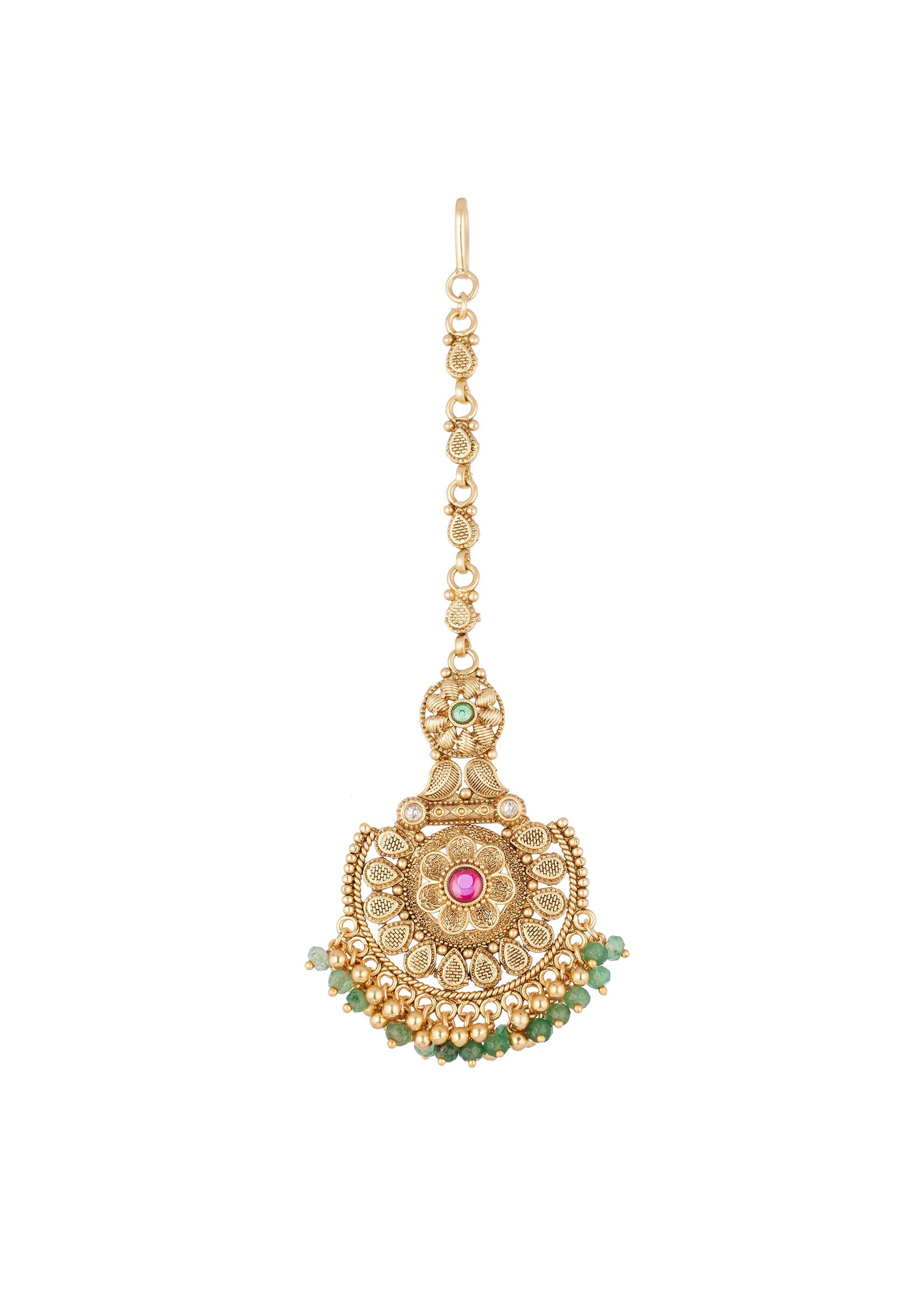 Gold Finish Maangtikka In Mix Metal With Traditional Style And Pink And Green Simulated Stones