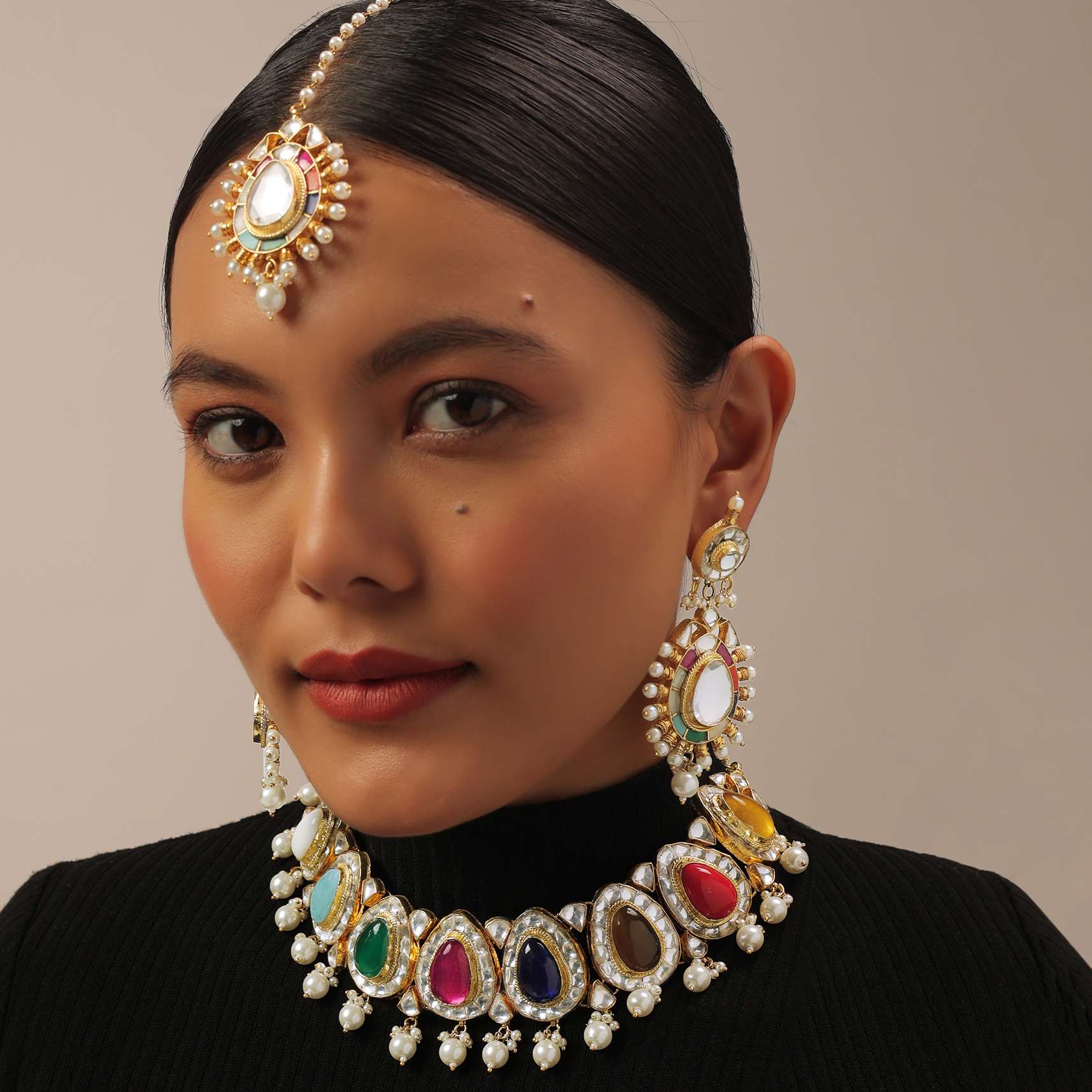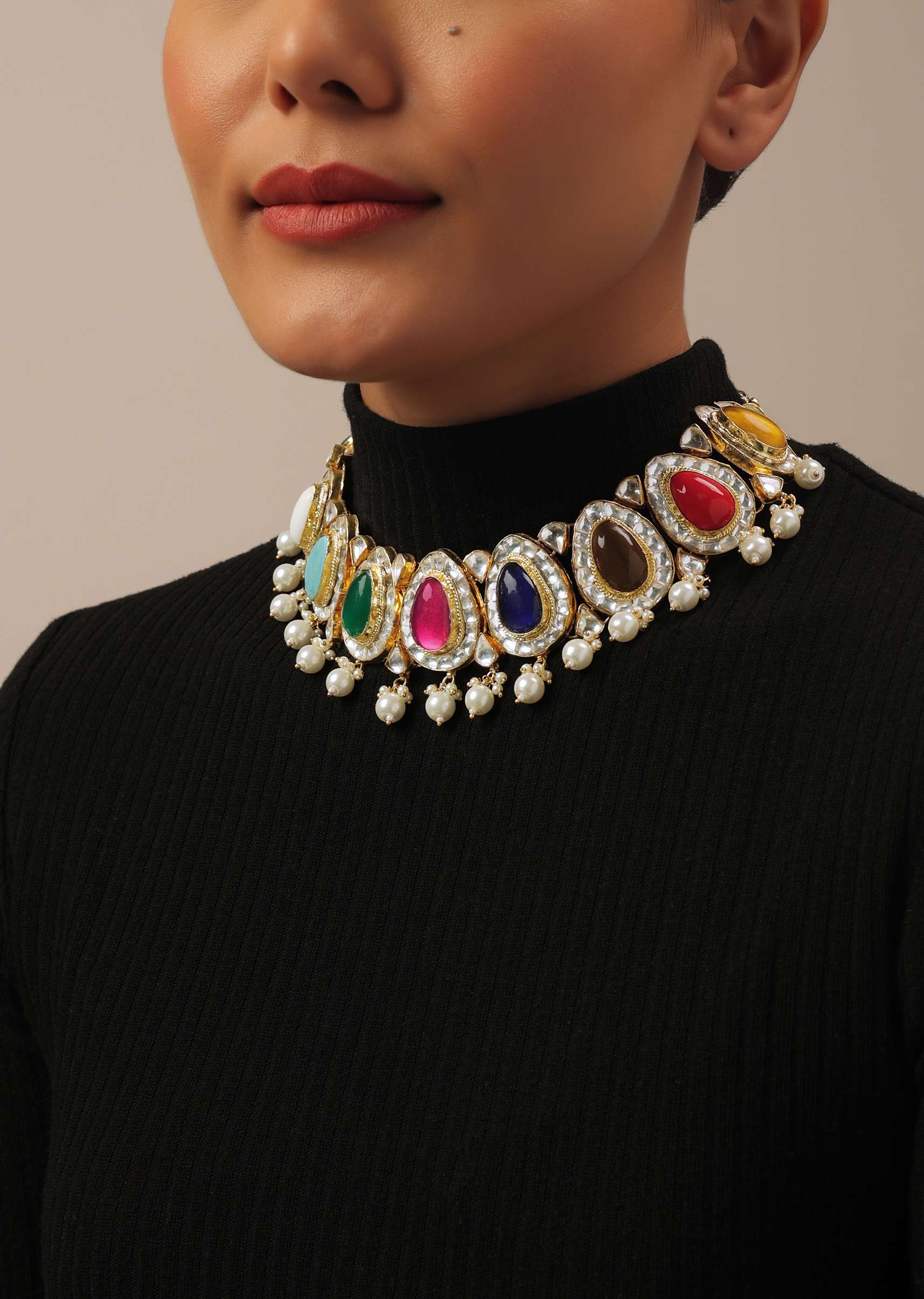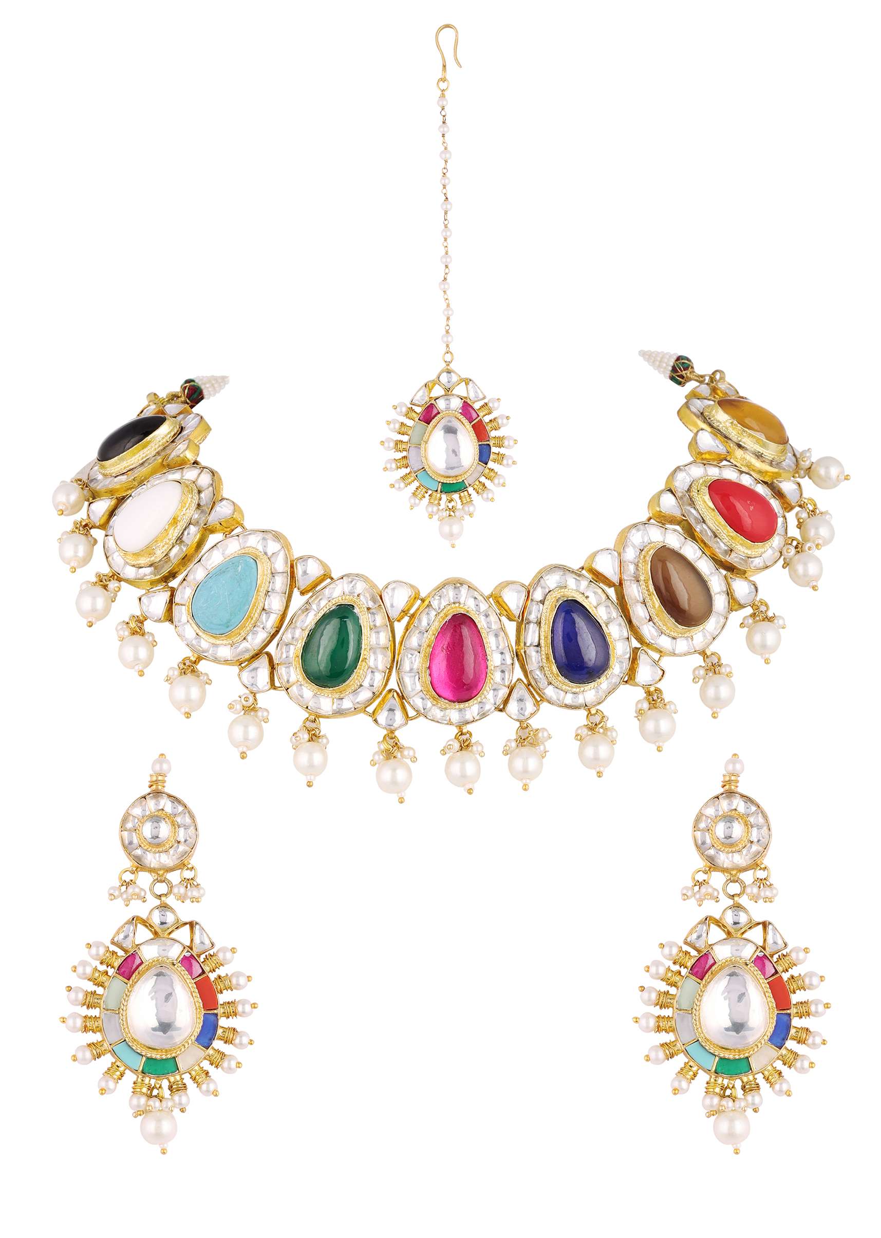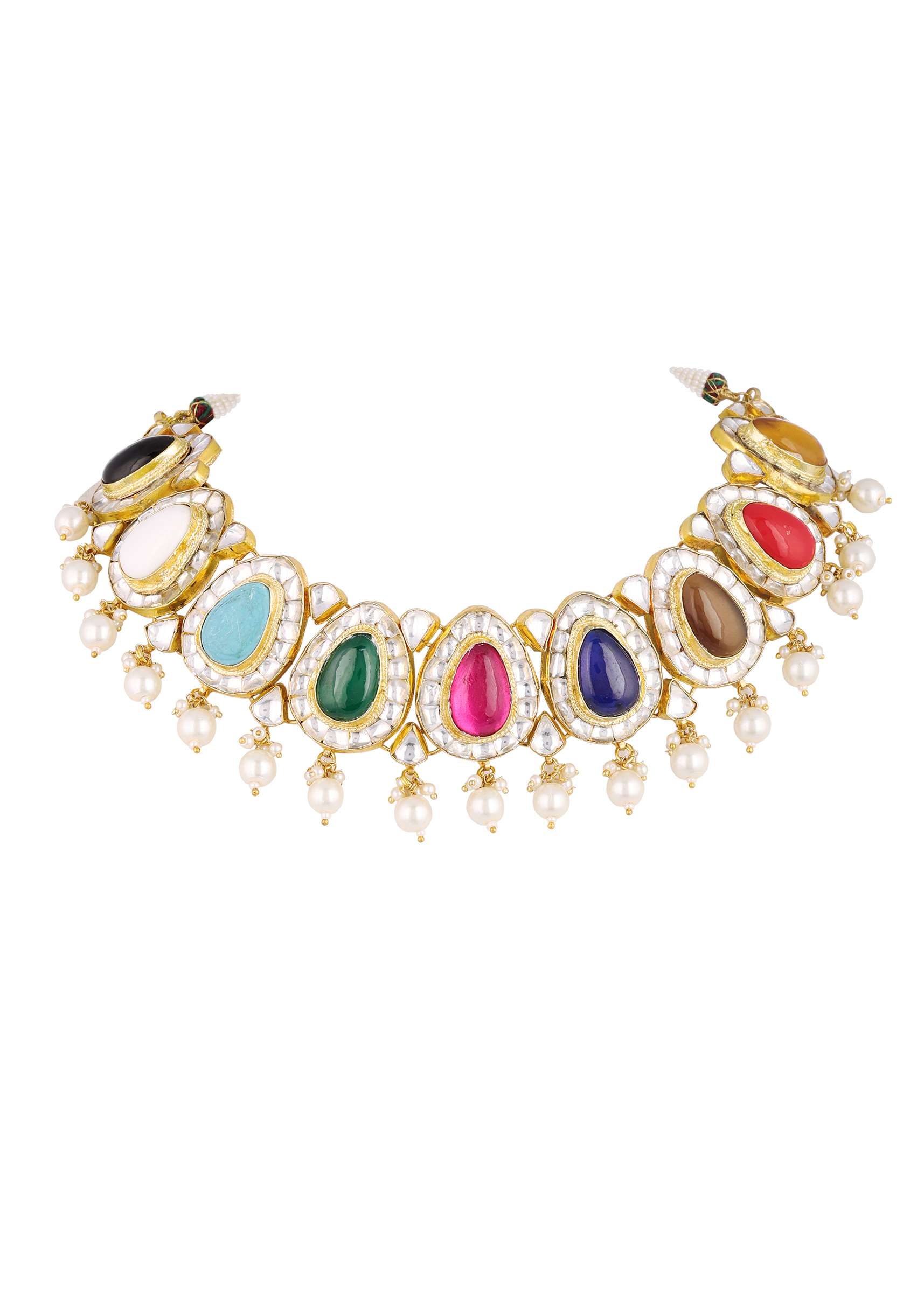 - Introducing this gold finish navratna kundan polki choker set, a stunning bridal jewellery set that exudes elegance and grace.