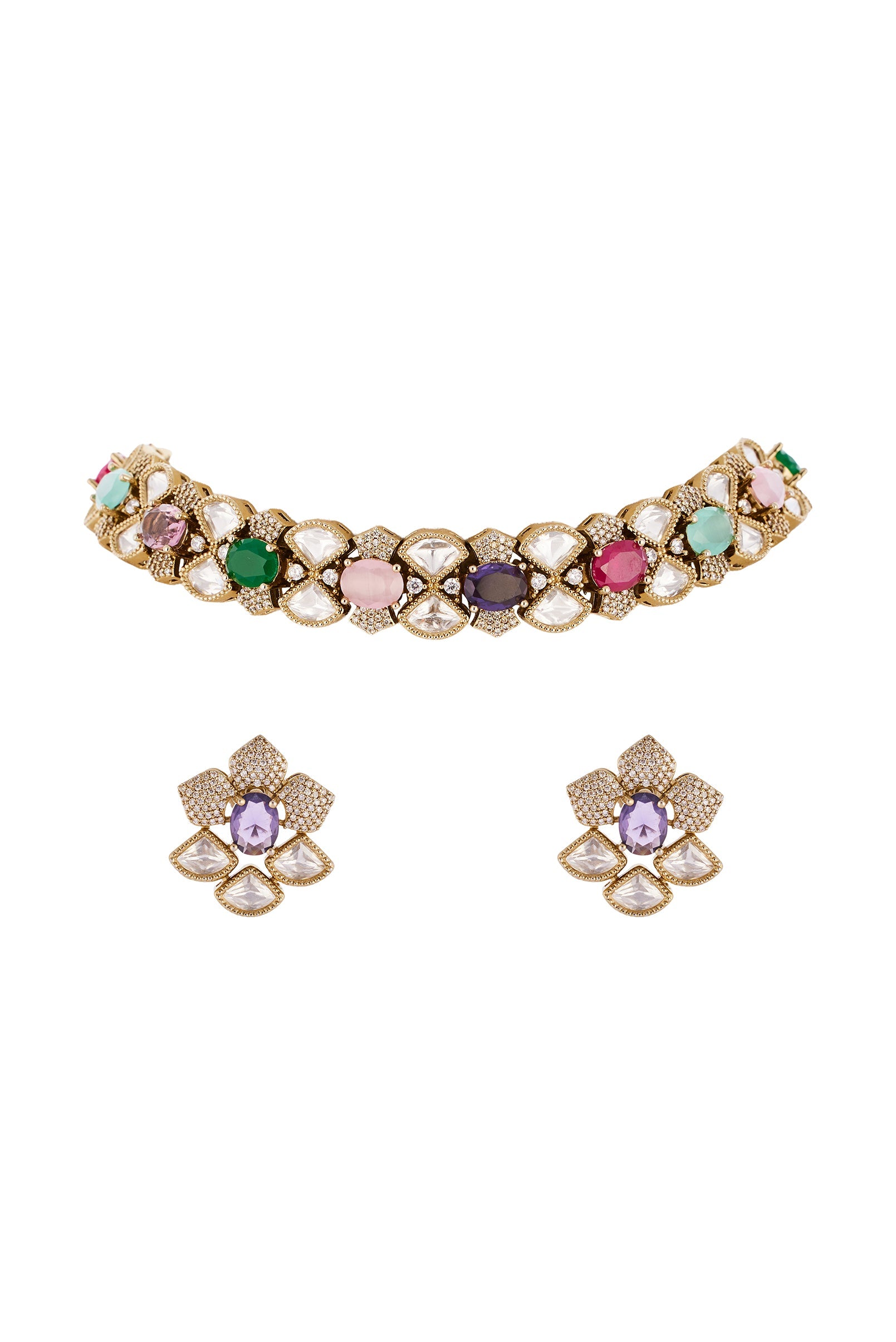 Gold Finish Necklace Set in Polki with Tanzanite Accents