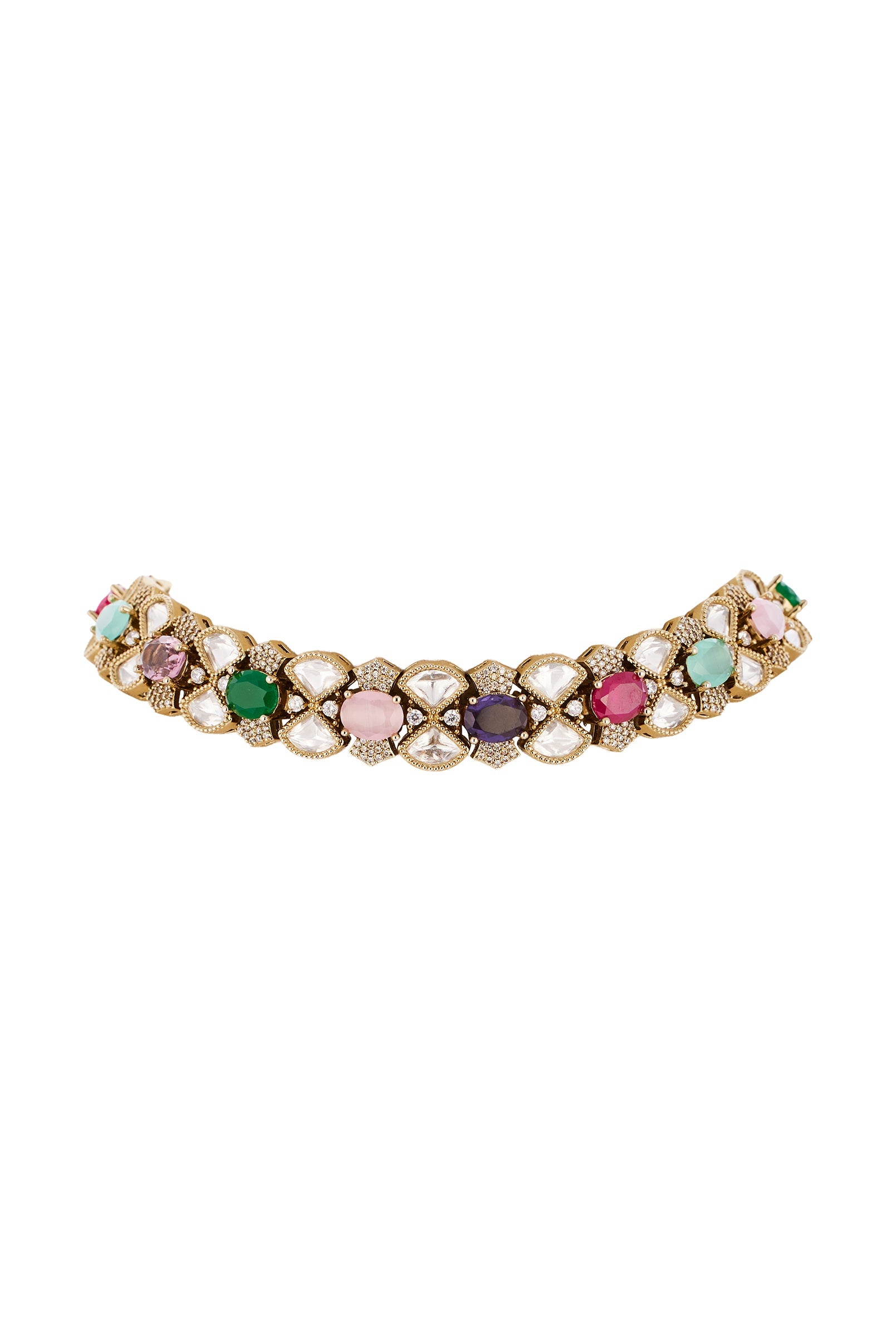 An exquisite blend of regal hues, this gold finish necklace set features uncut Polki set in the traditional Kundan Jadau technique. Handcrafted by skilled artisans, the necklace highlights striking tanzanite accents that bring a refined purple glow to the design. The harmony of warm gold tones, radiant Polki, and rich tanzanite creates a luxurious statement that beautifully complements festive and wedding ensembles. Coordinating earrings complete the set for an elegant, cohesive look. Awarded as the Most Trusted Brand, we're delivering styles you love, just as promised.