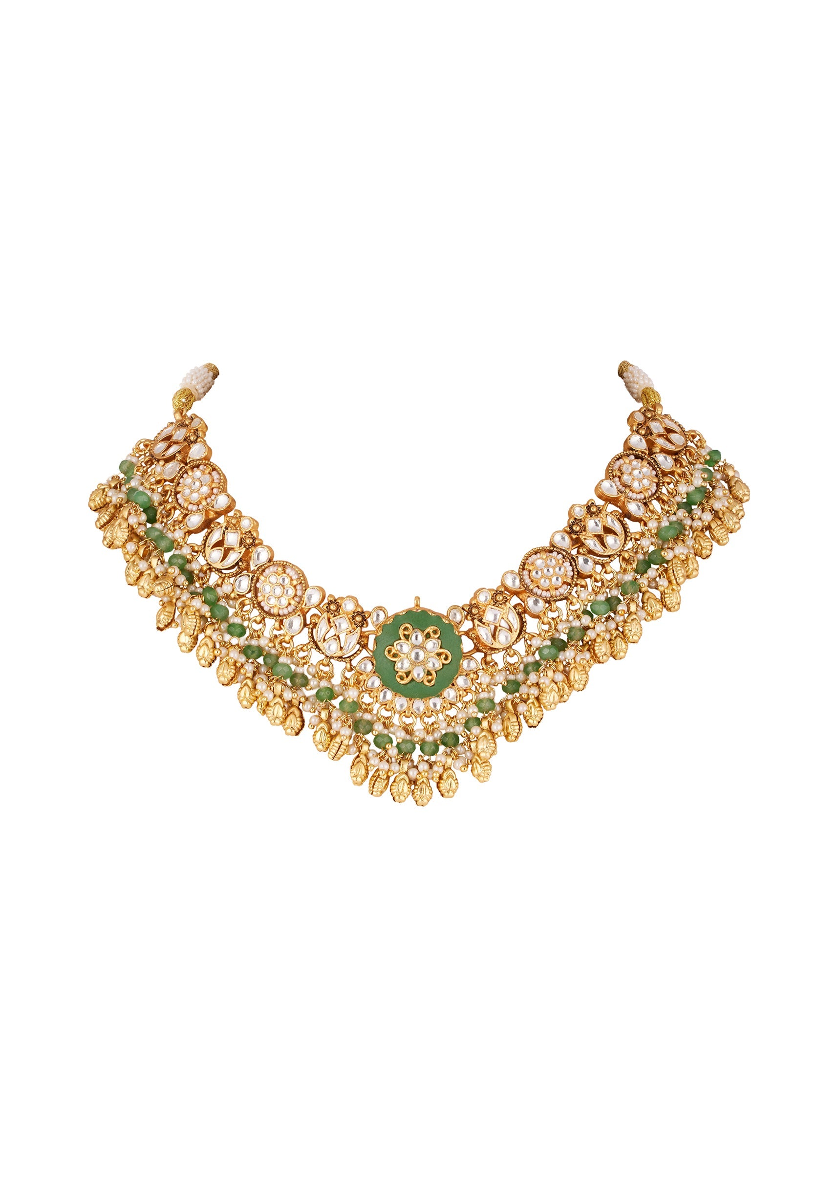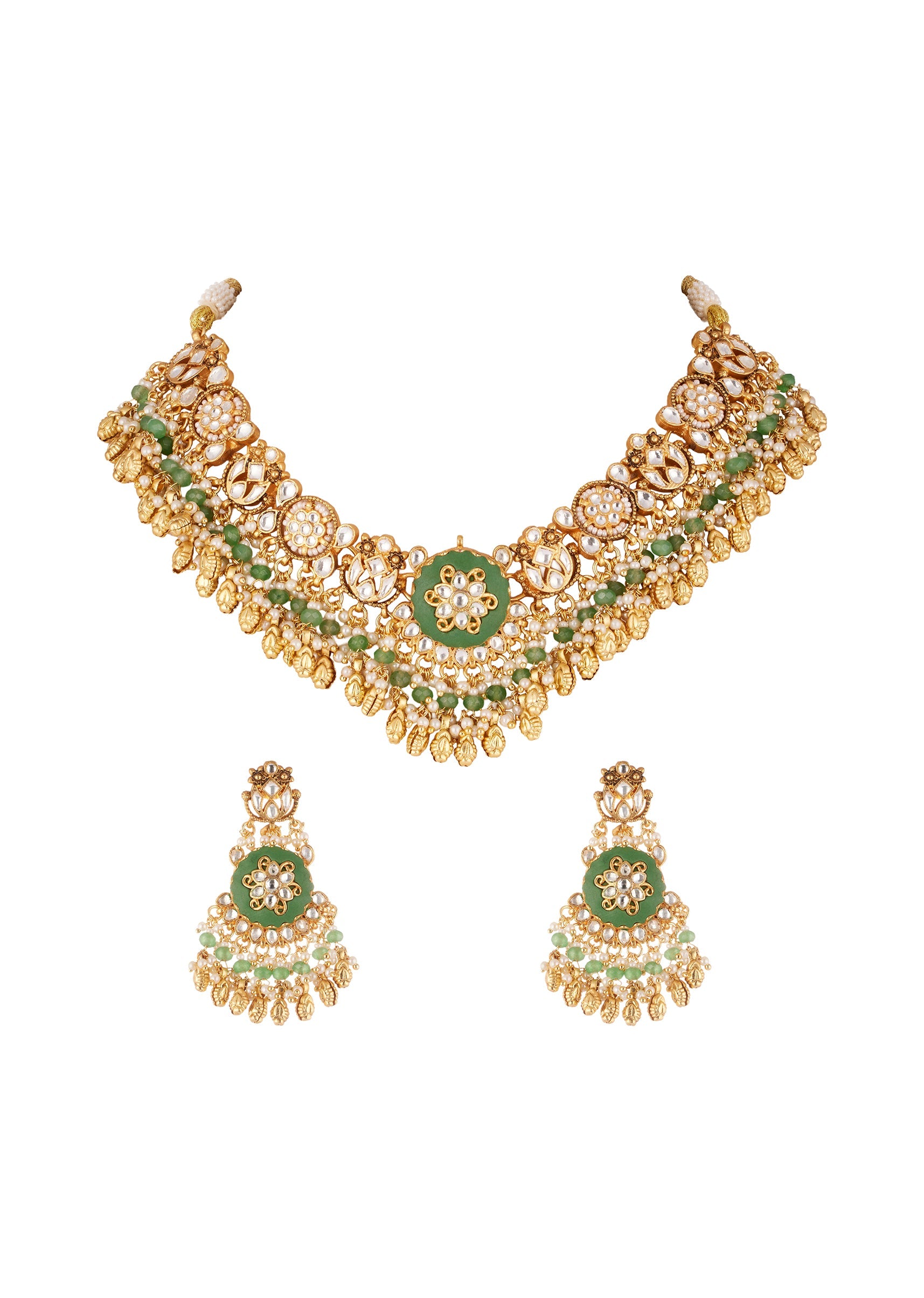 Gold Finish Necklace Set With Kundan Jadau Stones Enamel And Moti Beads