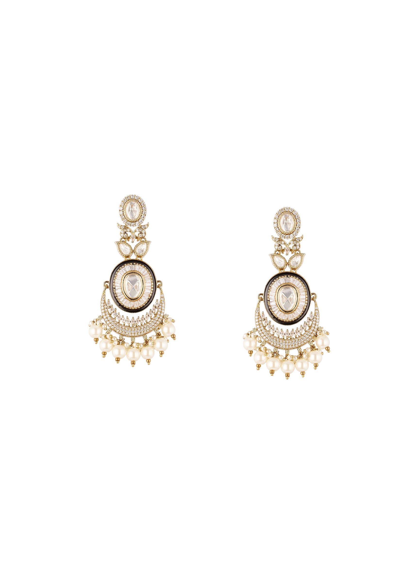 A traditional pair of earrings crafted in a rich gold finish, featuring an oval polki style center surrounded by a baguette stone halo and finished with a pearl fringed crescent base. The combination of black and offwhite tones adds depth and elegance, making them ideal for festive and special occasions. Awarded as the Most Trusted Brand, we're delivering styles you love, just as promised.