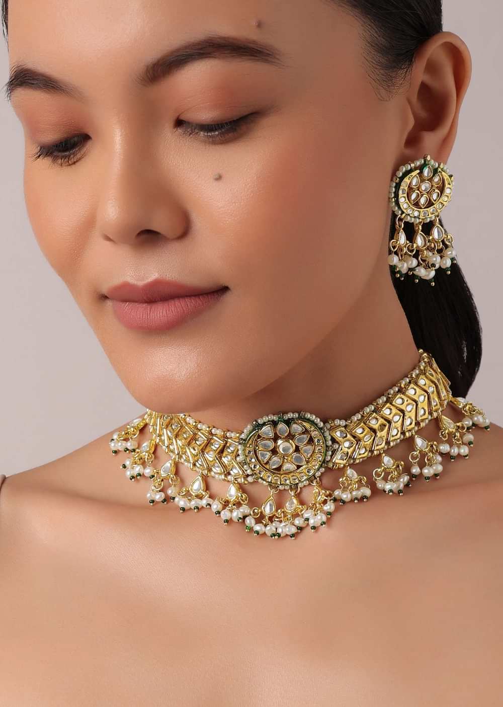 - Studded with delicately cut kundan the choker flaunts a stunning pendant and cluster bead drops.