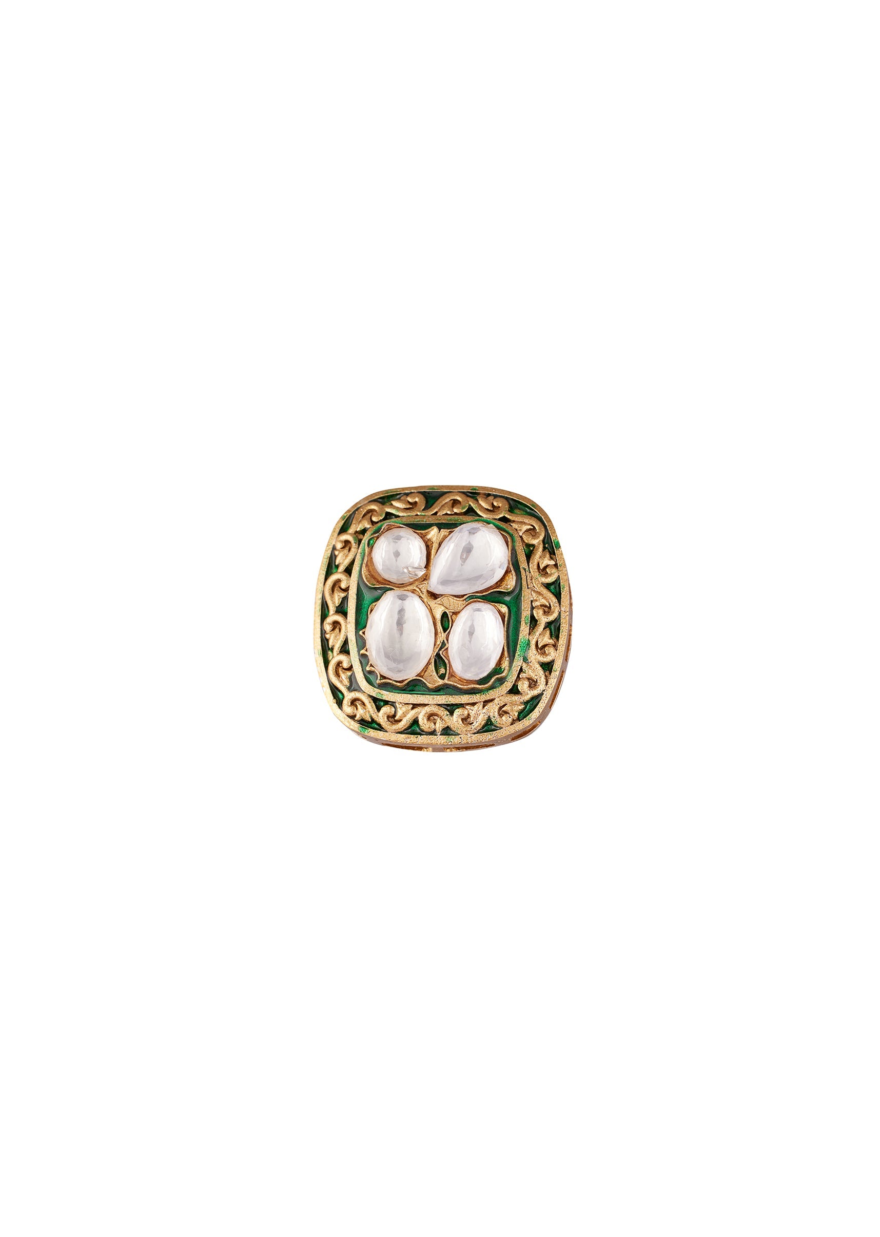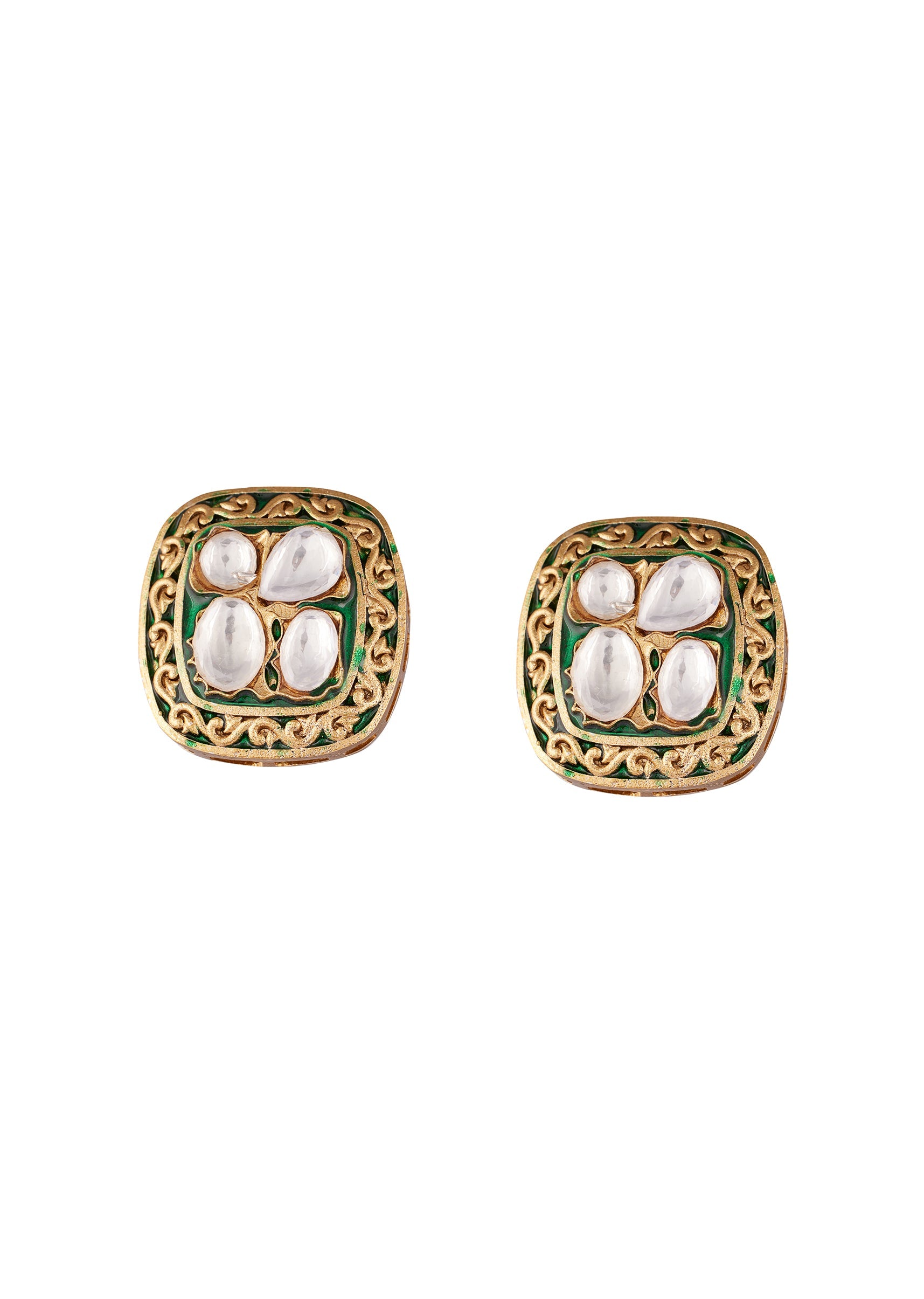 A festive ready pair crafted to add instant charm to mehendi and pooja celebrations. The gold toned square stud is detailed with rich green enamel and bordered with ornate craftsmanship... More Product Details