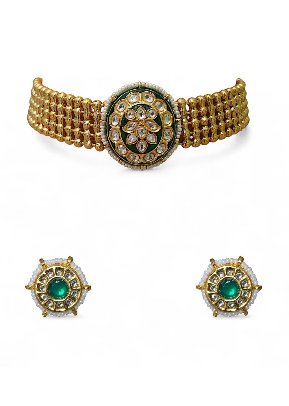 A gold fusion enamelled pendant necklace set featuring intricate enamel work and detailed craftsmanship, exuding artistic elegance with a modern twist. Perfect for adding a refined and luxurious touch to... More Product Details