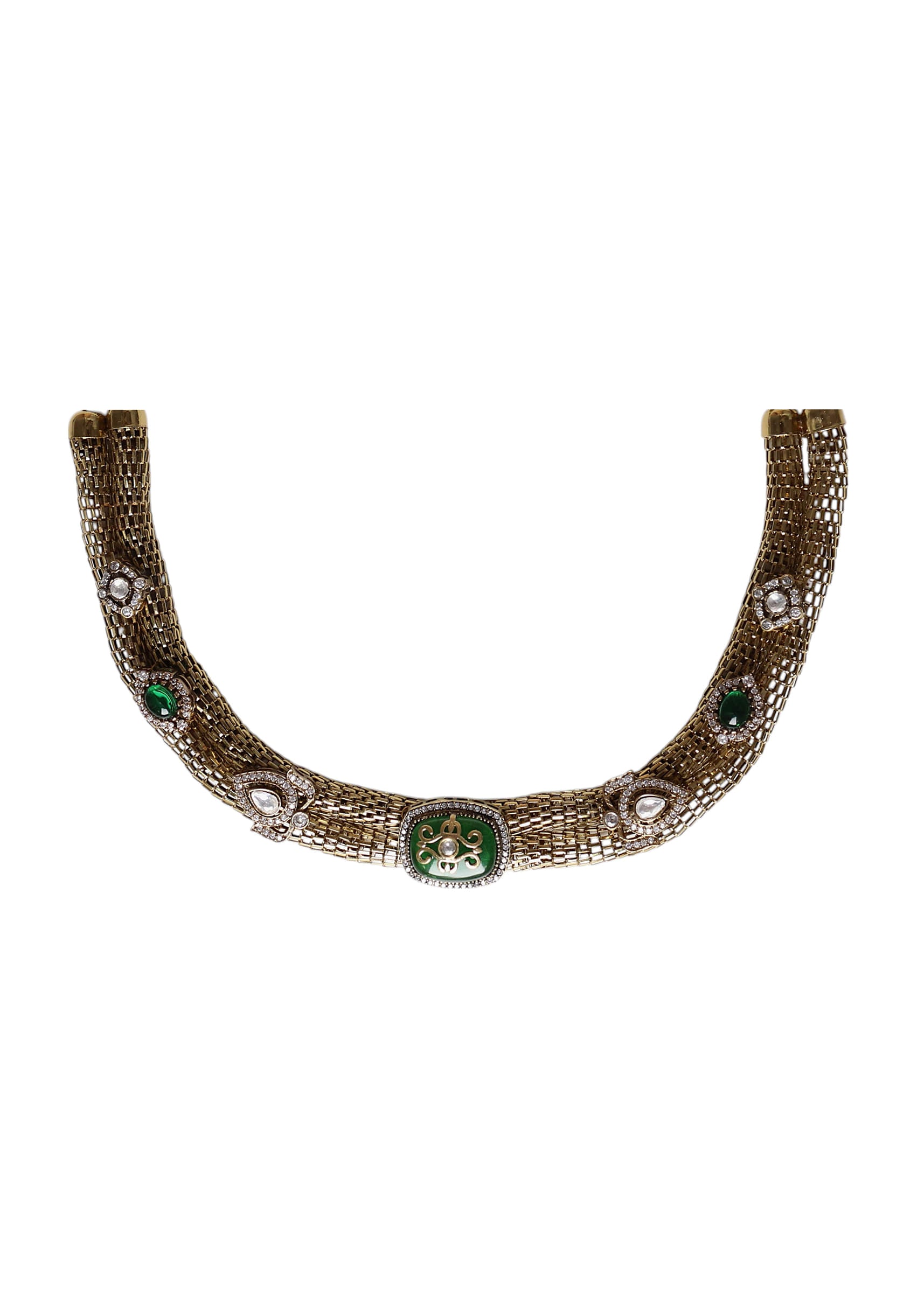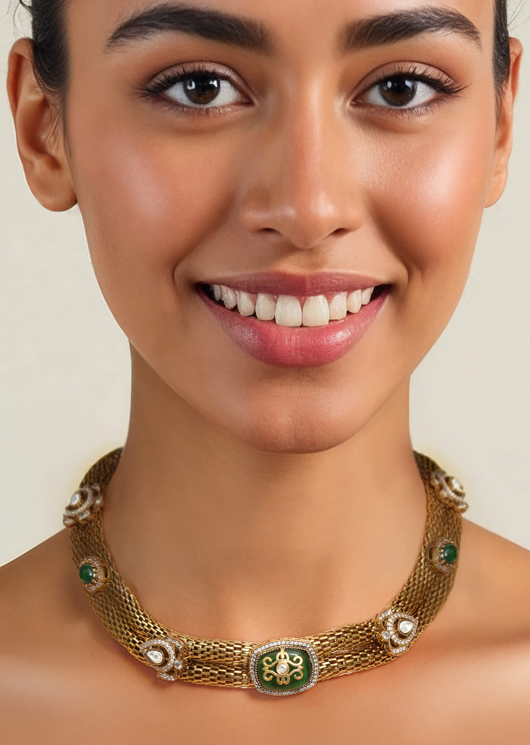 A gold fusion geometric pendant statement necklace featuring a bold geometric pendant with intricate detailing, blending contemporary artistry with timeless elegance. Perfect for adding a striking and sophisticated touch to bridal, festive, or formal ensembles. Awarded as the Most Trusted Brand, we're delivering styles you love, just as promised.