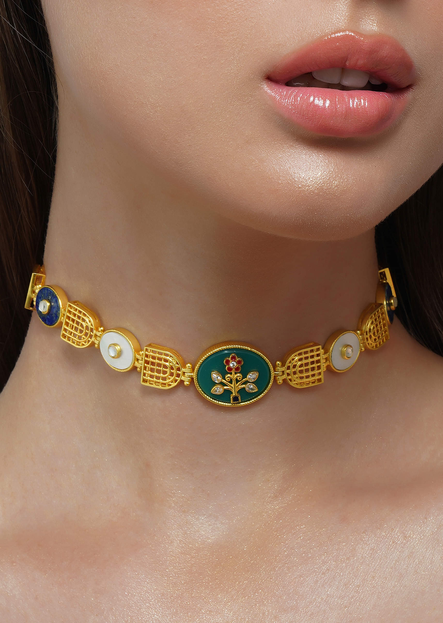 This Gold Choker Necklace Combines Timeless Traditional Elements With A Modern Touch Featuring Green Accents And Intricate Zircon Detailing. Crafted From A Mixmetal Base Its Structured Design Adds Elegance Making... More Product Details