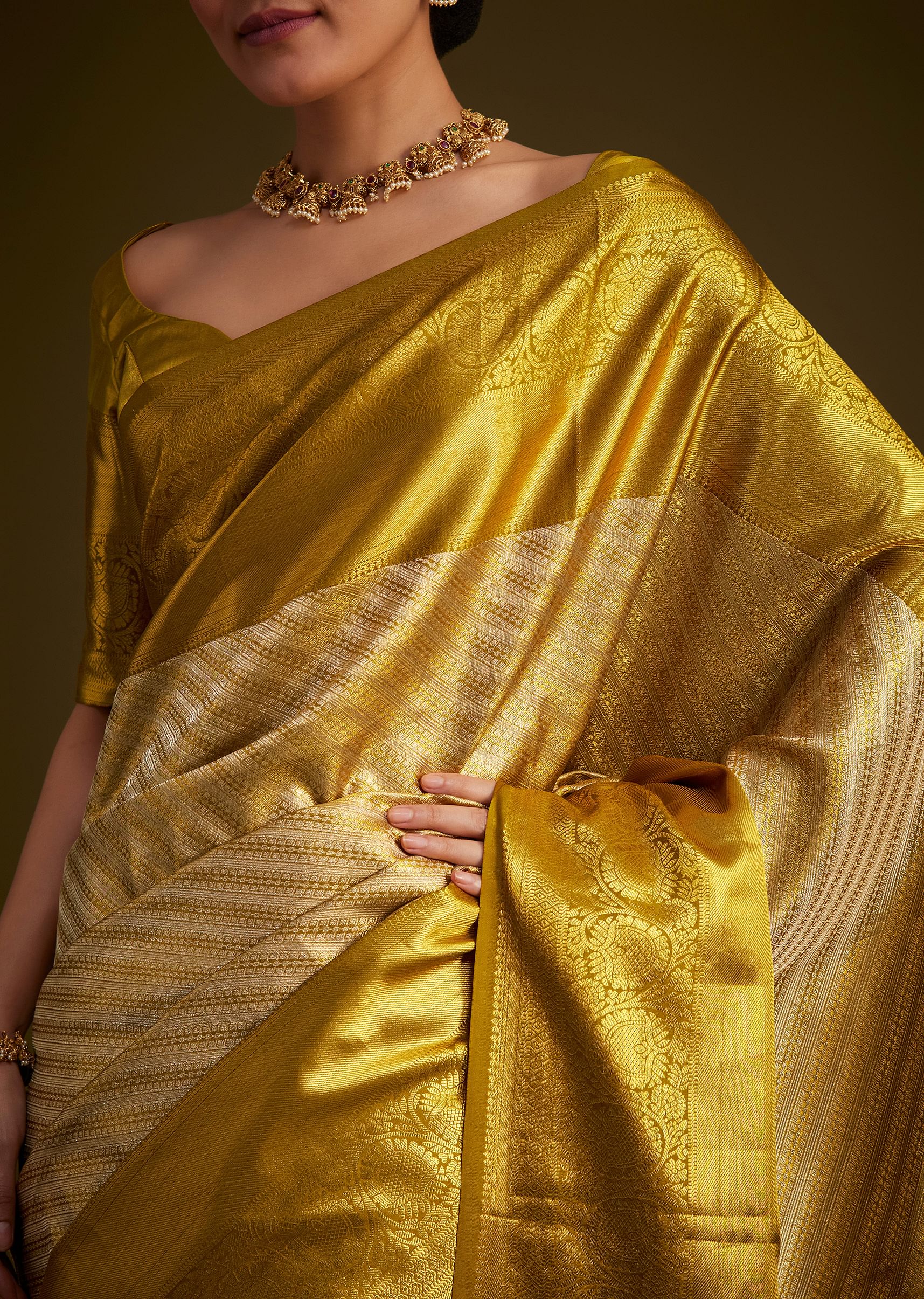 Drape Yourself In Timeless Elegance With This Gold Kanjivaram Silk Saree Featuring A Lustrous Zariwoven Border. The Rich Silk Fabric And Refined Zari Detailing Celebrate Traditional Artistry While Offering A Sophisticated Appeal For Weddings And Festive Occasions. This Saree Embodies The Beauty Of Heritage Craftsmanship Creating A Perfect Harmony Between Cultural Pride And Modern Finesse. Ideal For Cherishing Special Moments With Poise And Grace.Awarded as the Most Trusted Brand, we're delivering styles you love, just as promised.
