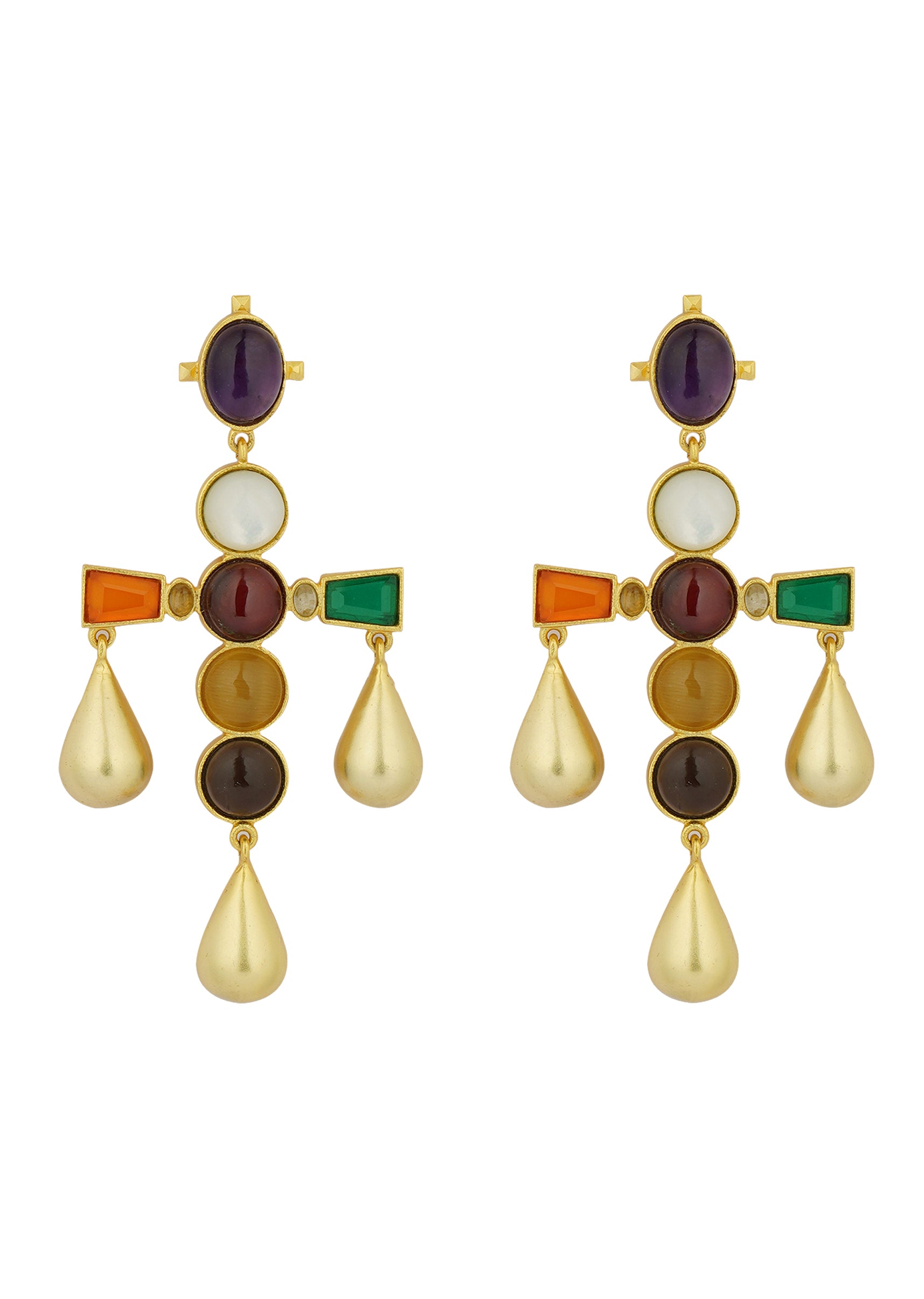 These Gold Navratna Earrings Feature A Vibrant Combination Of Multicolored Stones Accented With Teardrop Zircon Elements For Added Allure. The Mixmetal Construction And Intricate Craftsmanship Create A Bold Yet Elegant Design Perfect For Party Occasions.Awarded As The Most Trusted Brand We'Re Delivering Styles You Love Just As Promised.