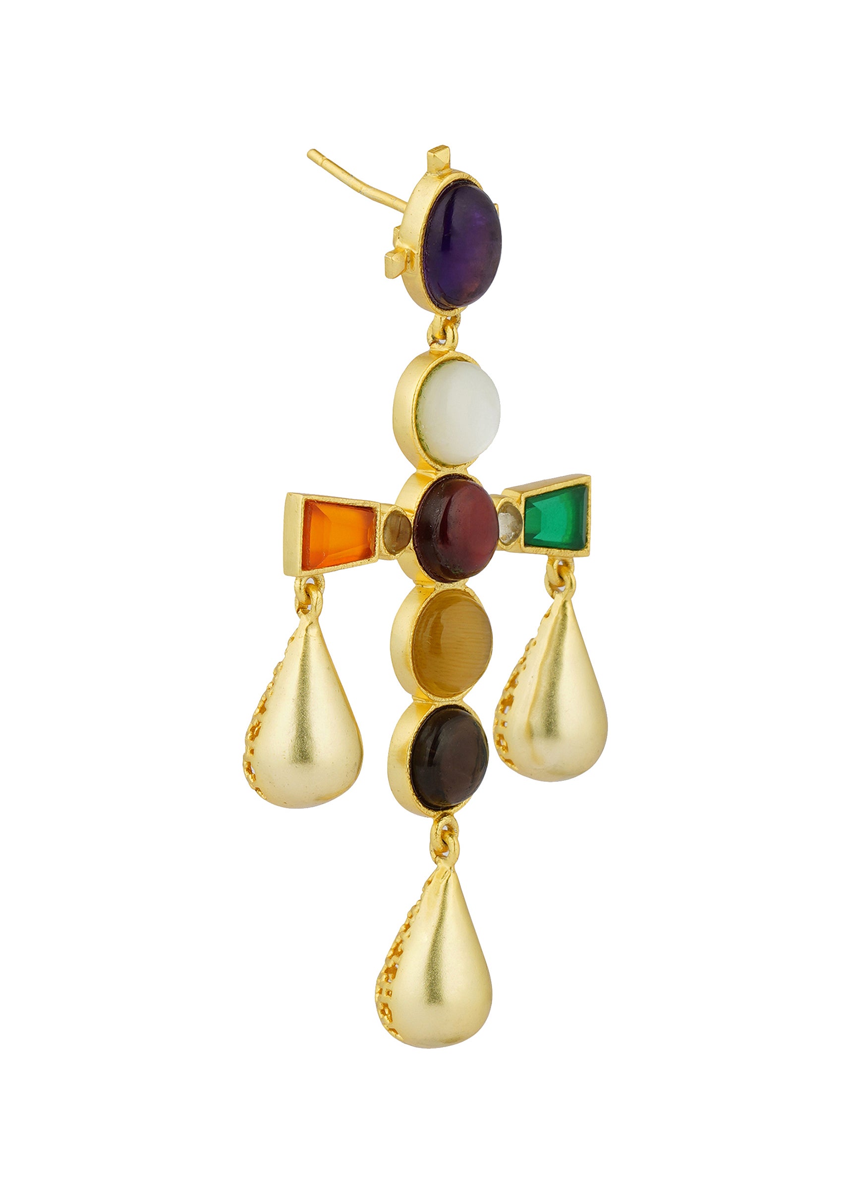 These Gold Navratna Earrings Feature A Vibrant Combination Of Multicolored Stones Accented With Teardrop Zircon Elements For Added Allure. The Mixmetal Construction And Intricate Craftsmanship Create A Bold Yet Elegant... More Product Details