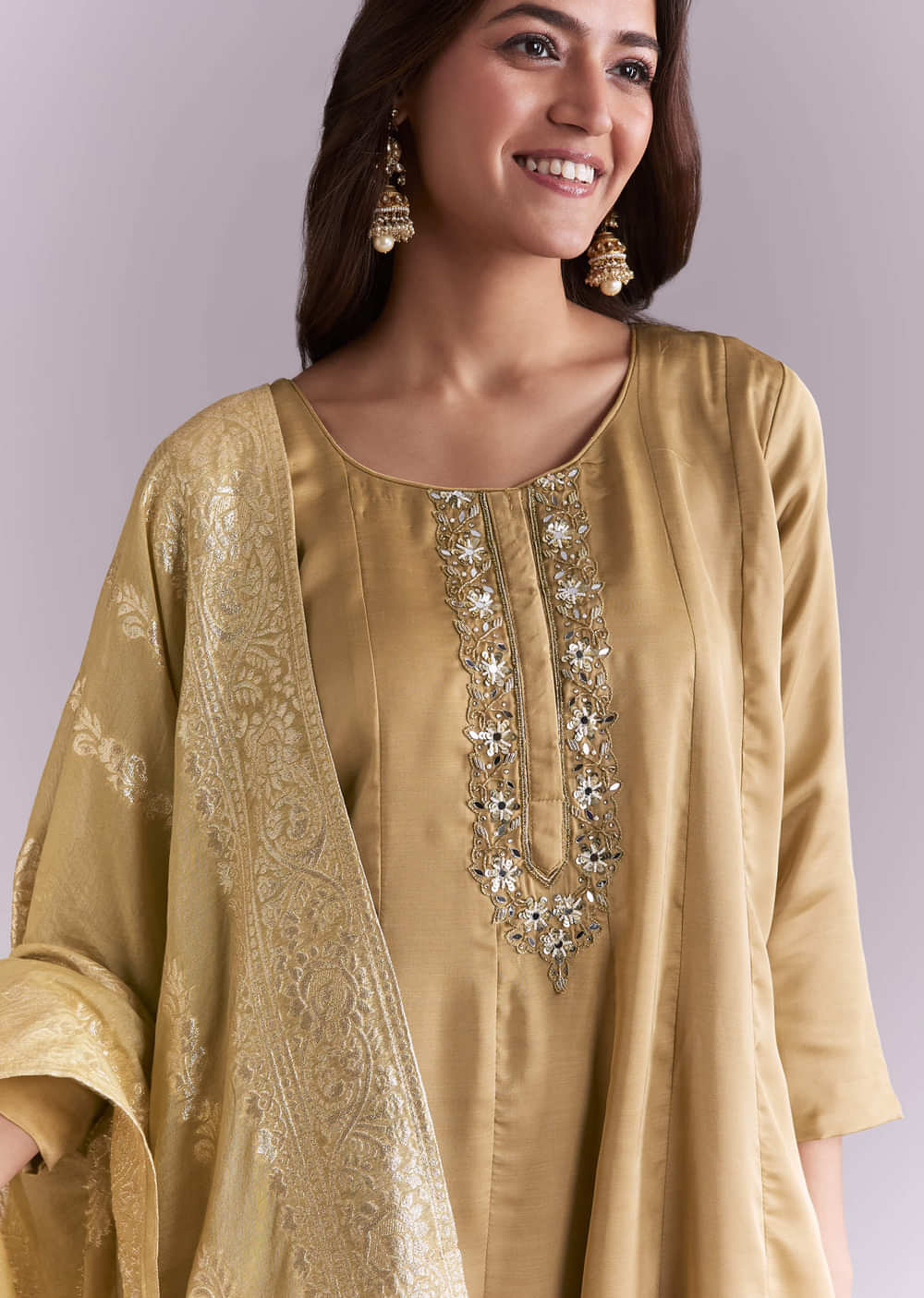 For festive mornings that move into temple visits, this gold muslin anarkali suit offers shimmer with soft ease. Mirror and moti embroidery brighten the neckline, while a jacquard dupatta completes... More Product Details