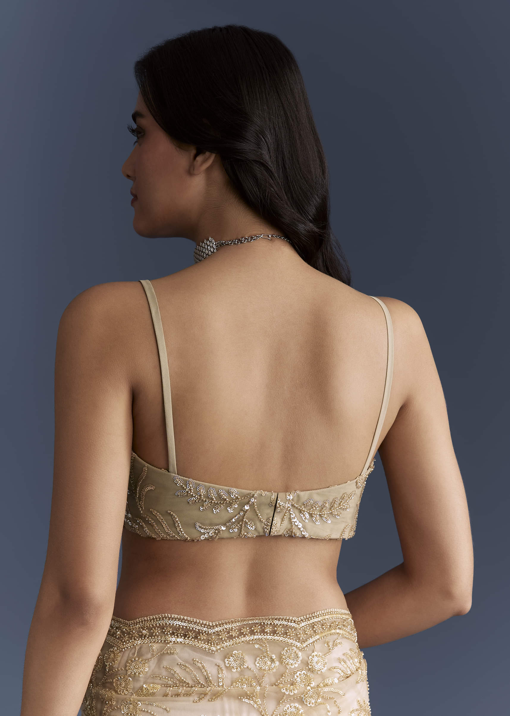 Soft-focus shimmer comes naturally to this gold net saree, catching light while staying airy through long events. Heavy floral sequin embroidery meets a scalloped edge and latkans, with a coordinated... More Product Details