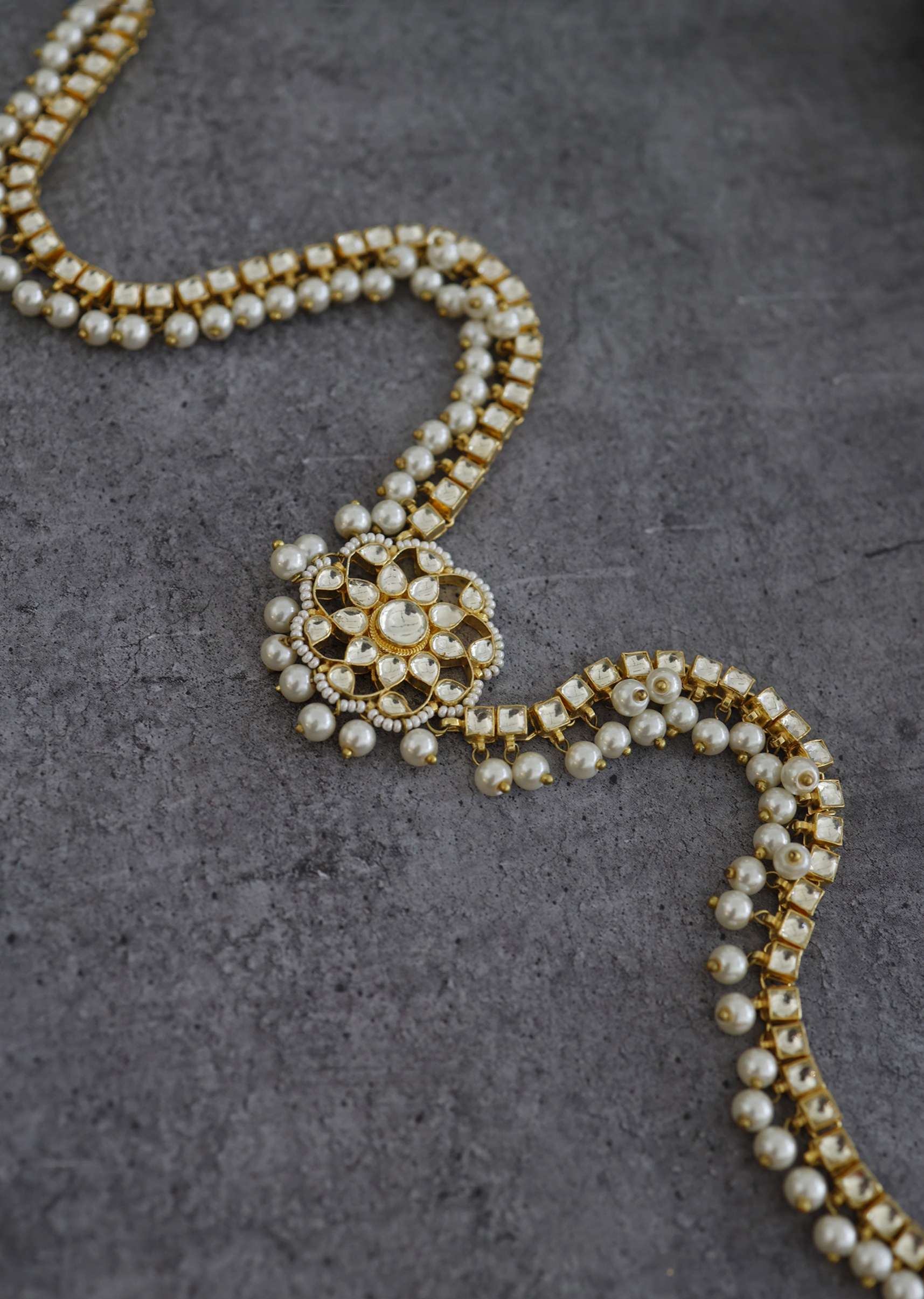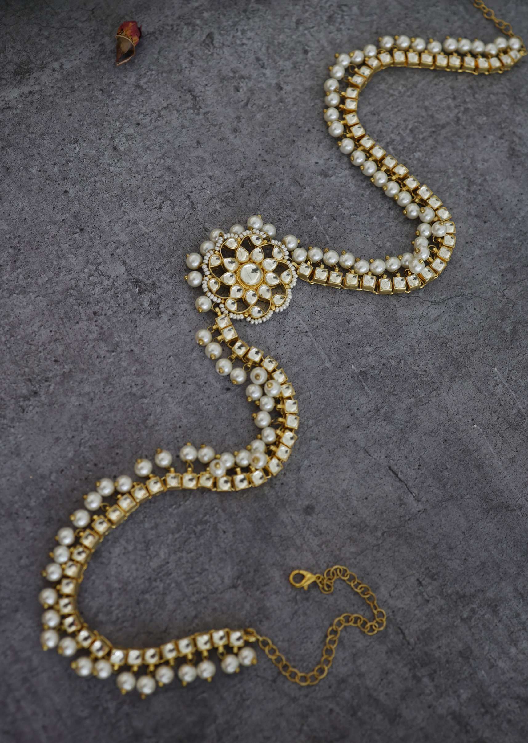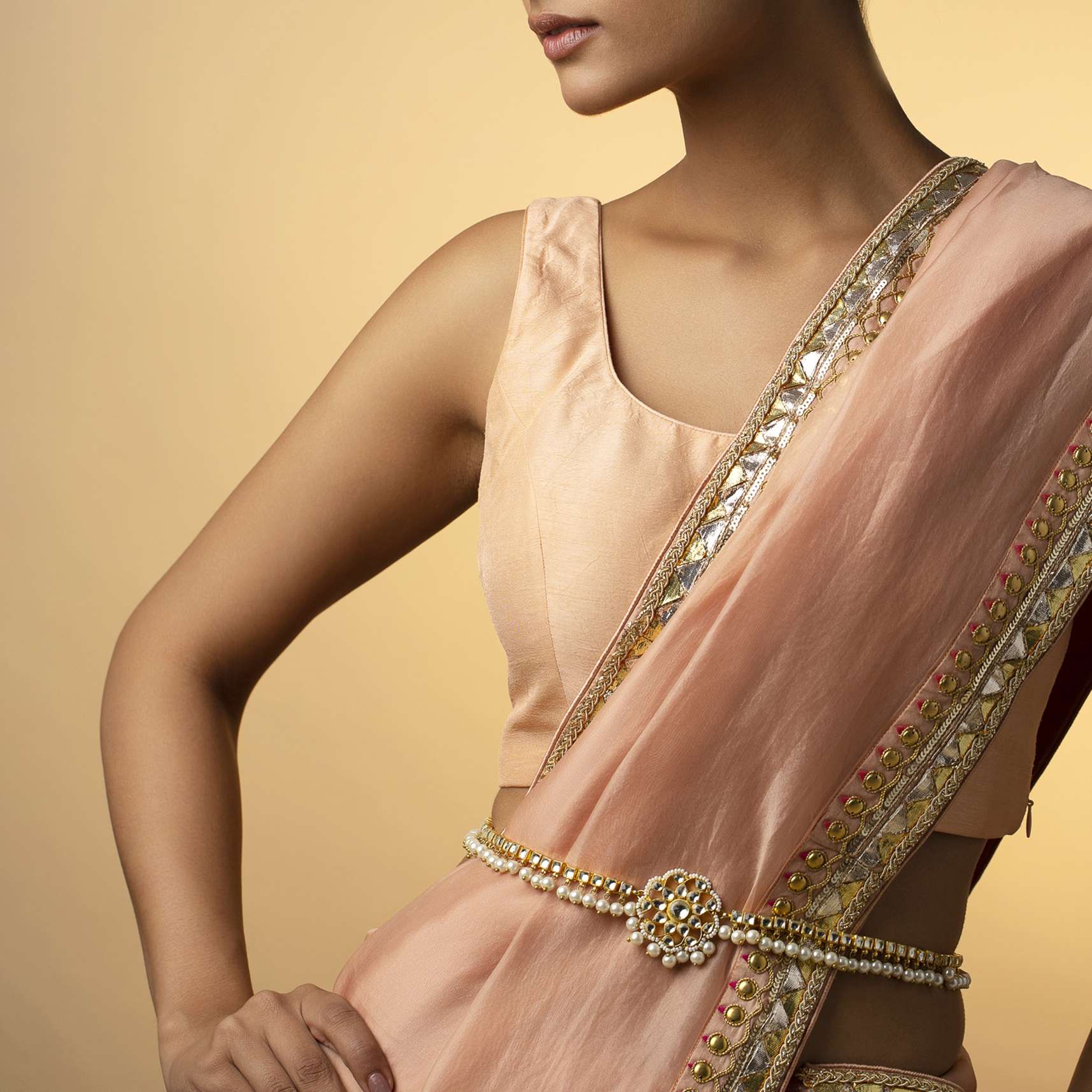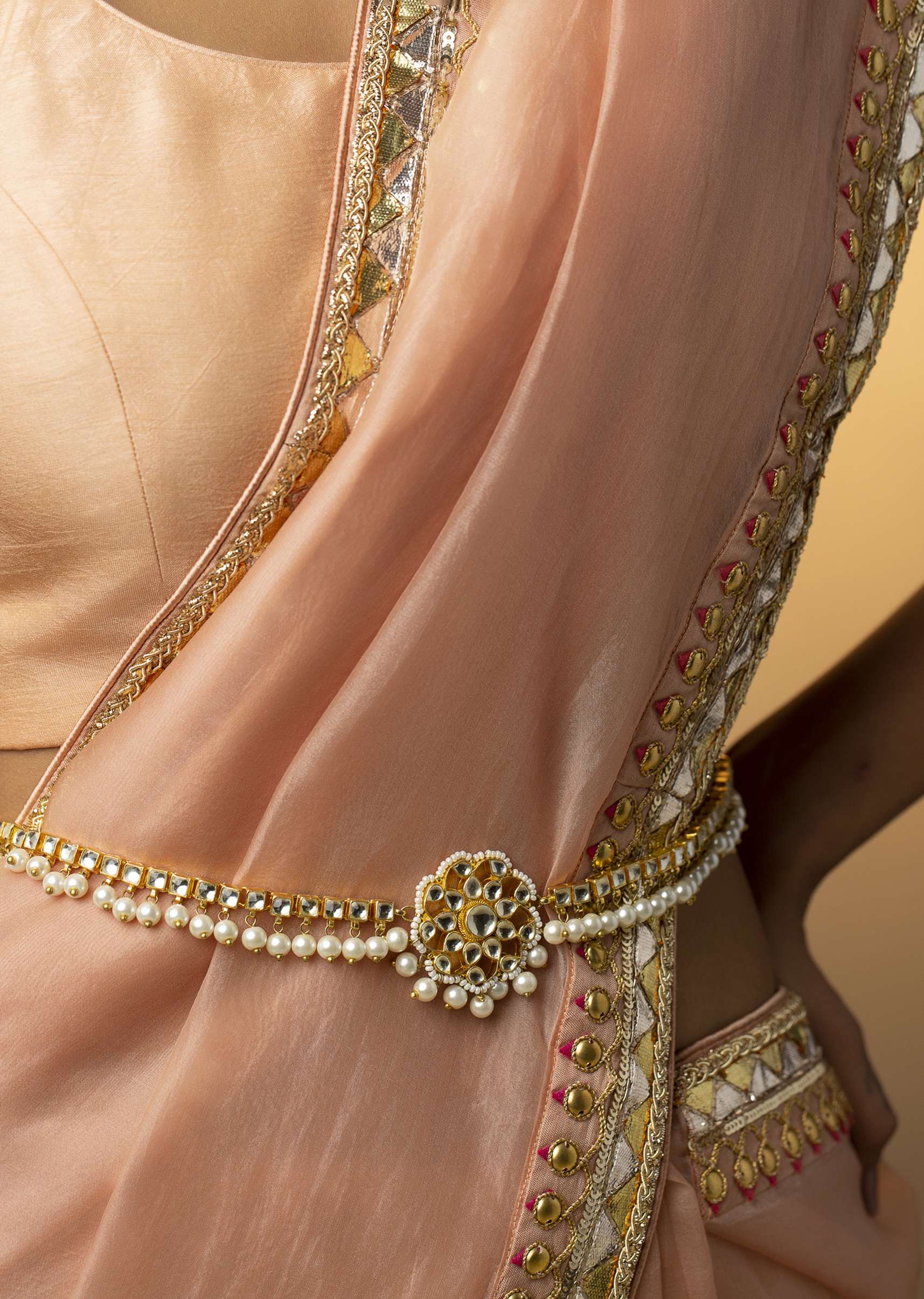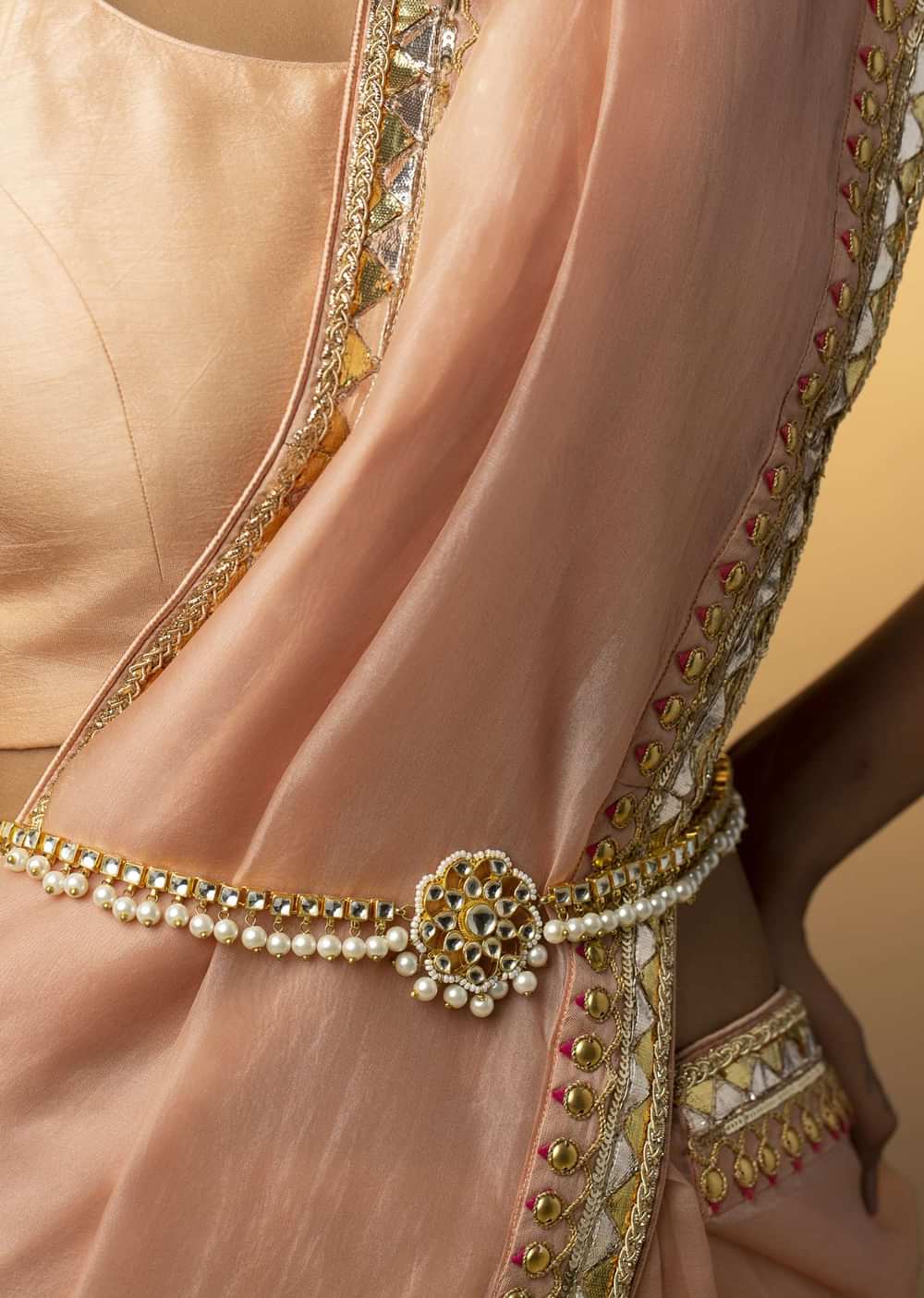 - Elevate your ensemble with the timeless allure of our kundan and high-grade shell pearls adorned waistbelt.