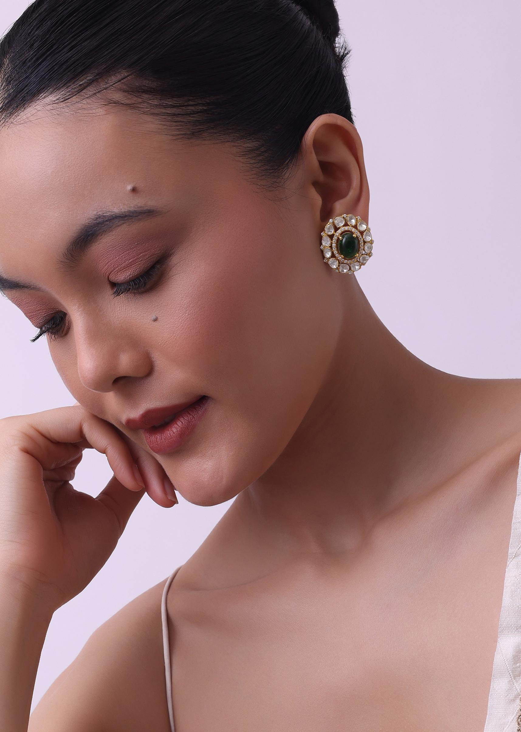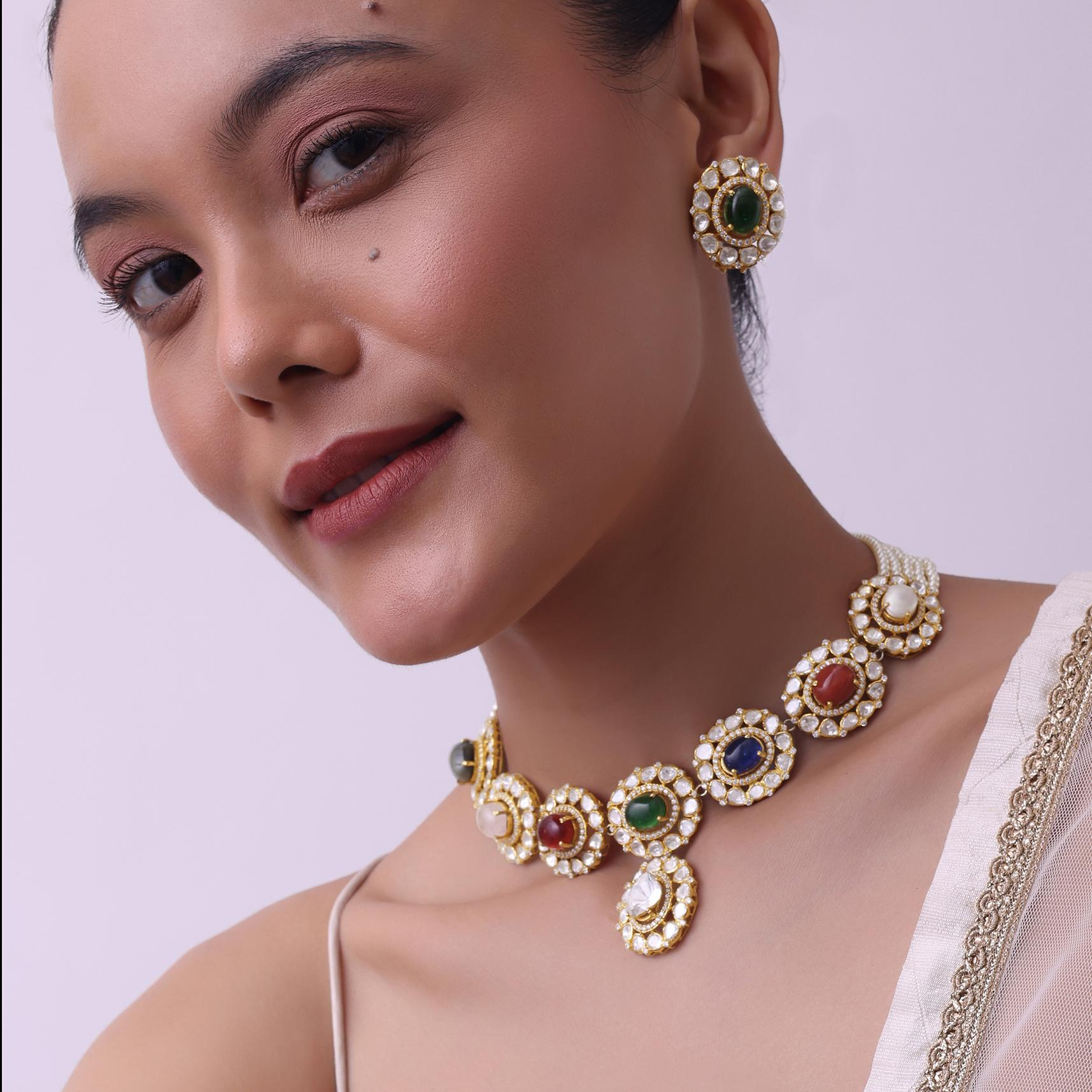- Introducing our gold-plated short necklace and earring set, crafted in 92.5 sterling silver and adorned with a stunning combination of synthetic navratna stones in moissanite polki.