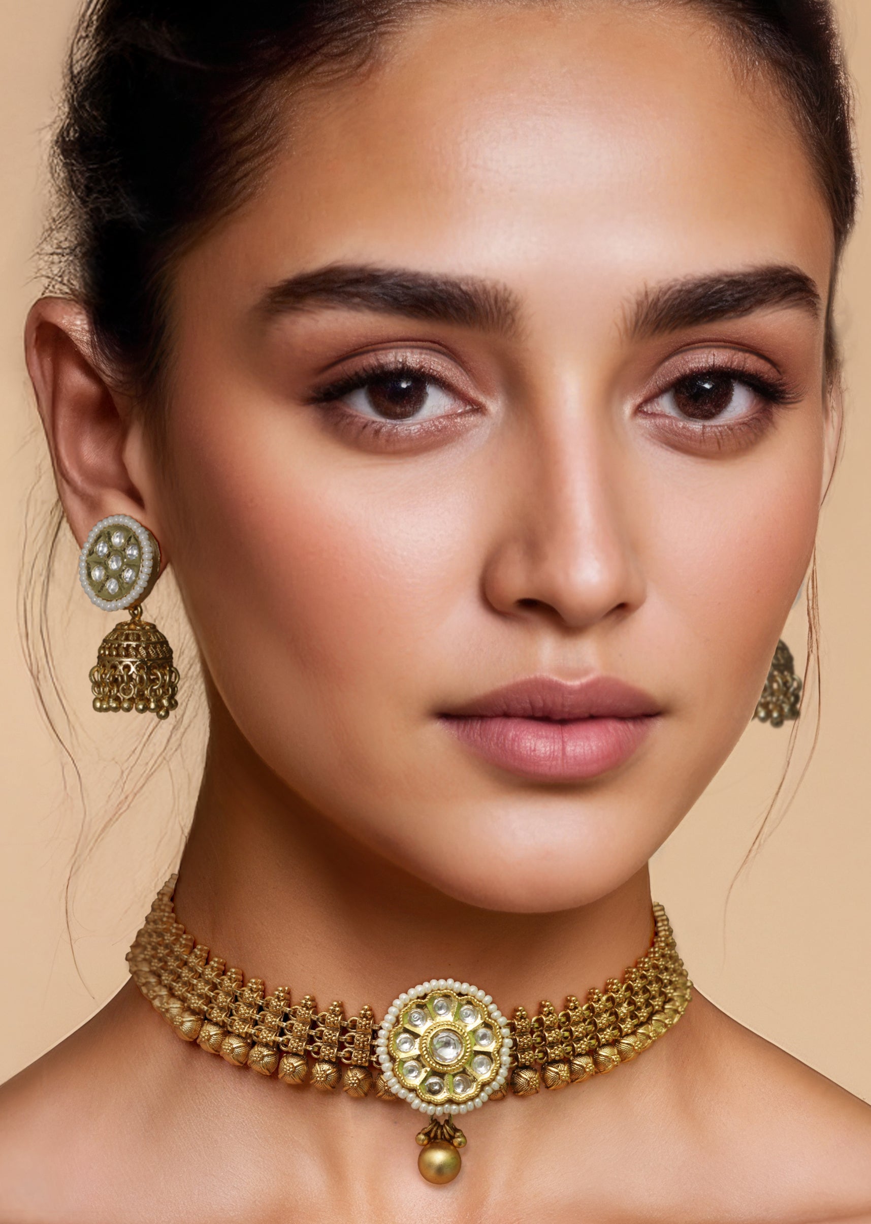 A gold Rajwadi kundan necklace and earring set featuring intricate traditional motifs and sparkling kundan stones, exuding royal elegance. Perfect for adding a majestic touch to bridal, festive, or ethnic... More Product Details