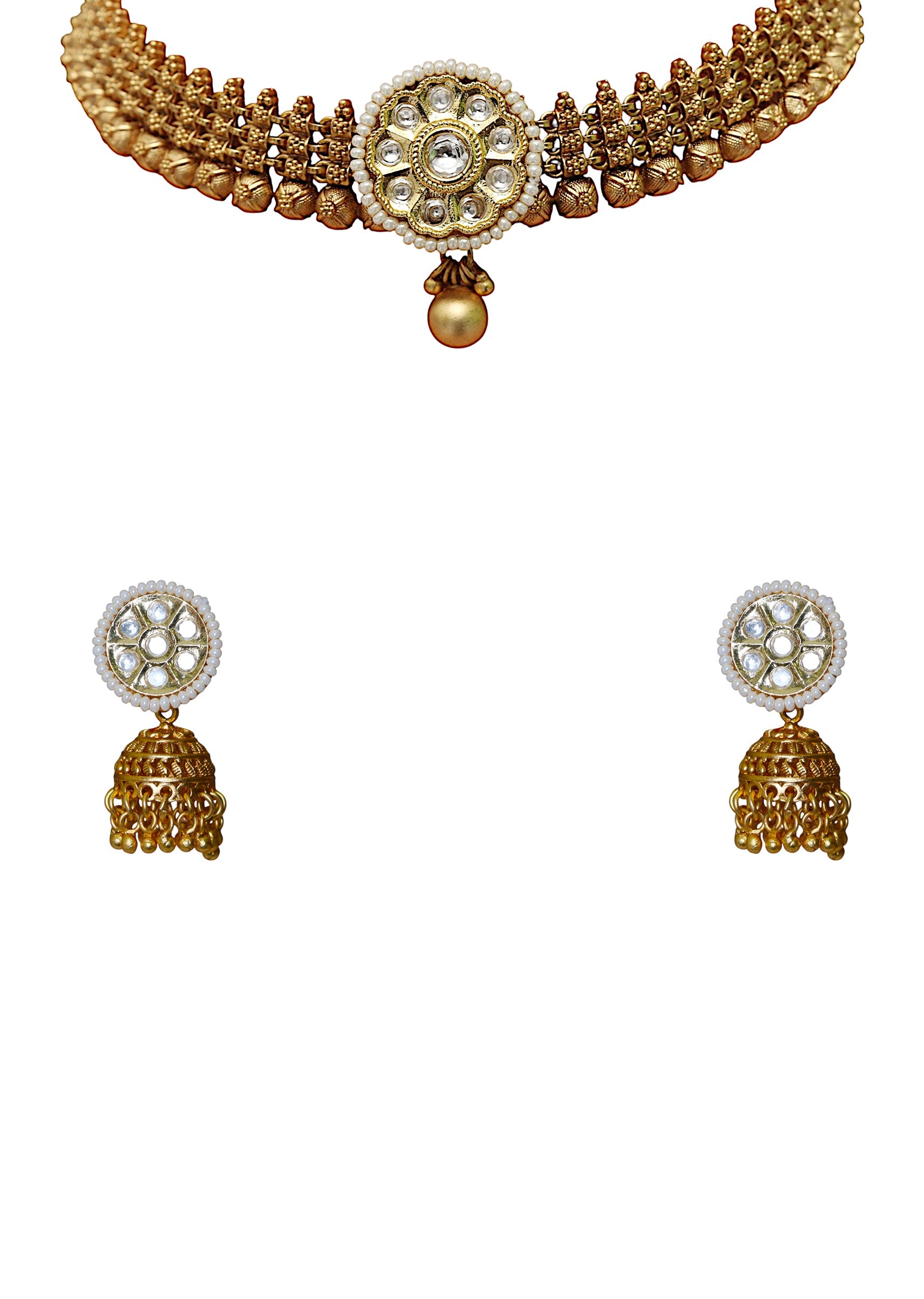 A gold Rajwadi kundan necklace and earring set featuring intricate traditional motifs and sparkling kundan stones, exuding royal elegance. Perfect for adding a majestic touch to bridal, festive, or ethnic ensembles. Awarded as the Most Trusted Brand, we're delivering styles you love, just as promised.