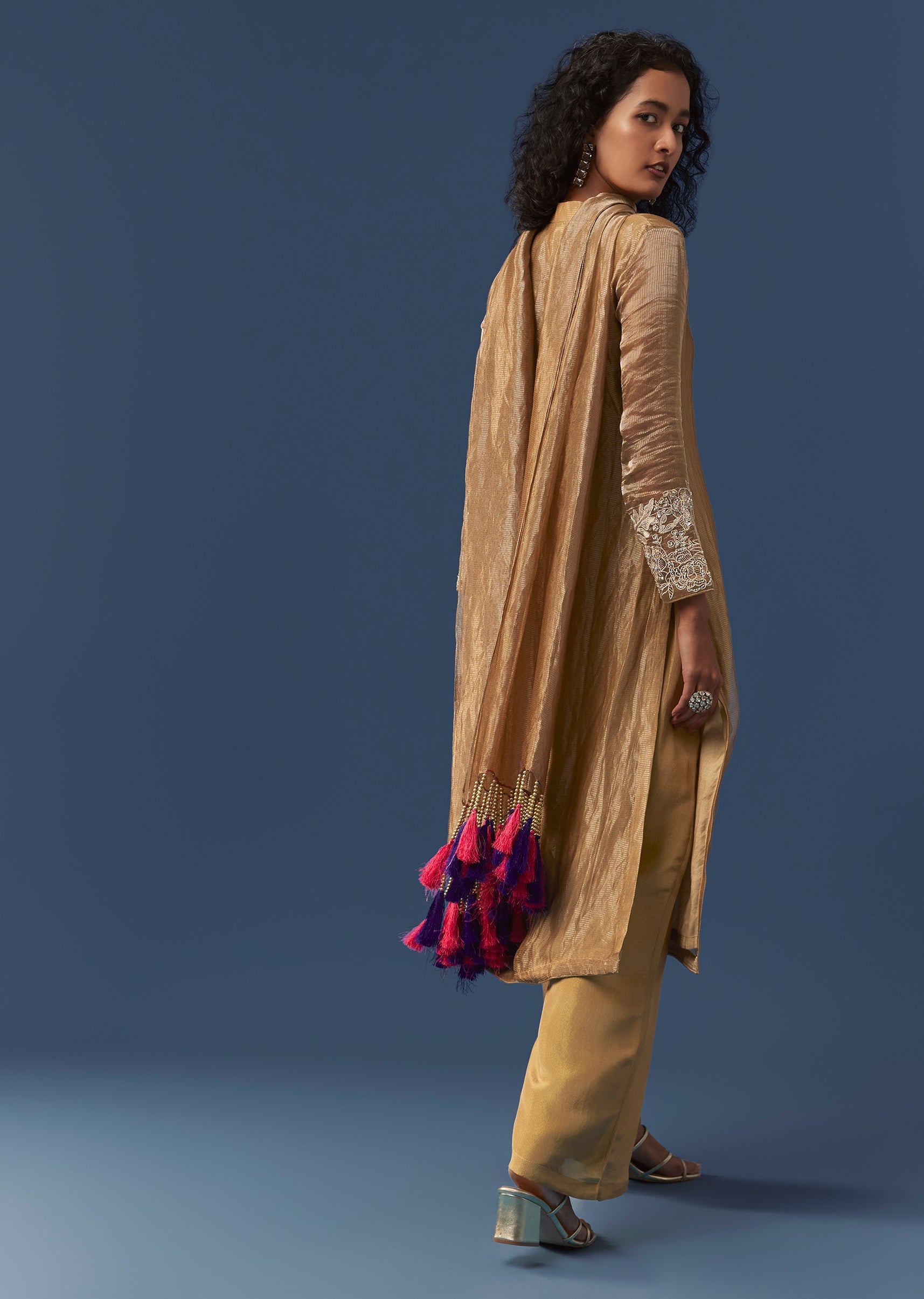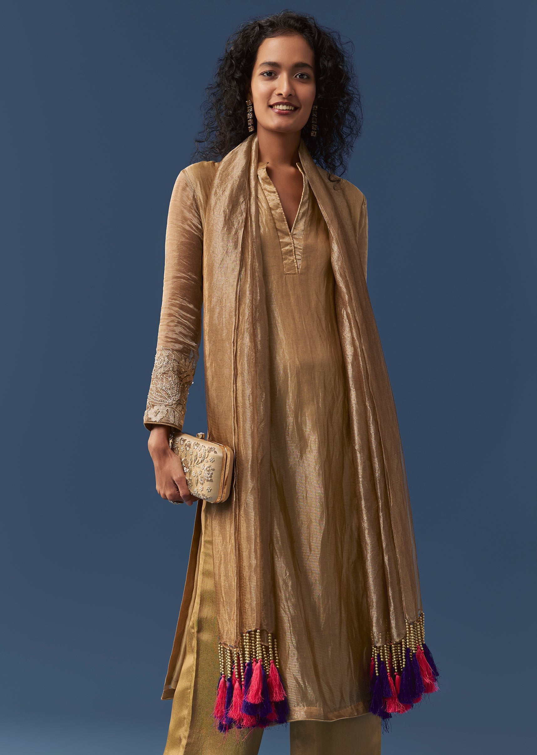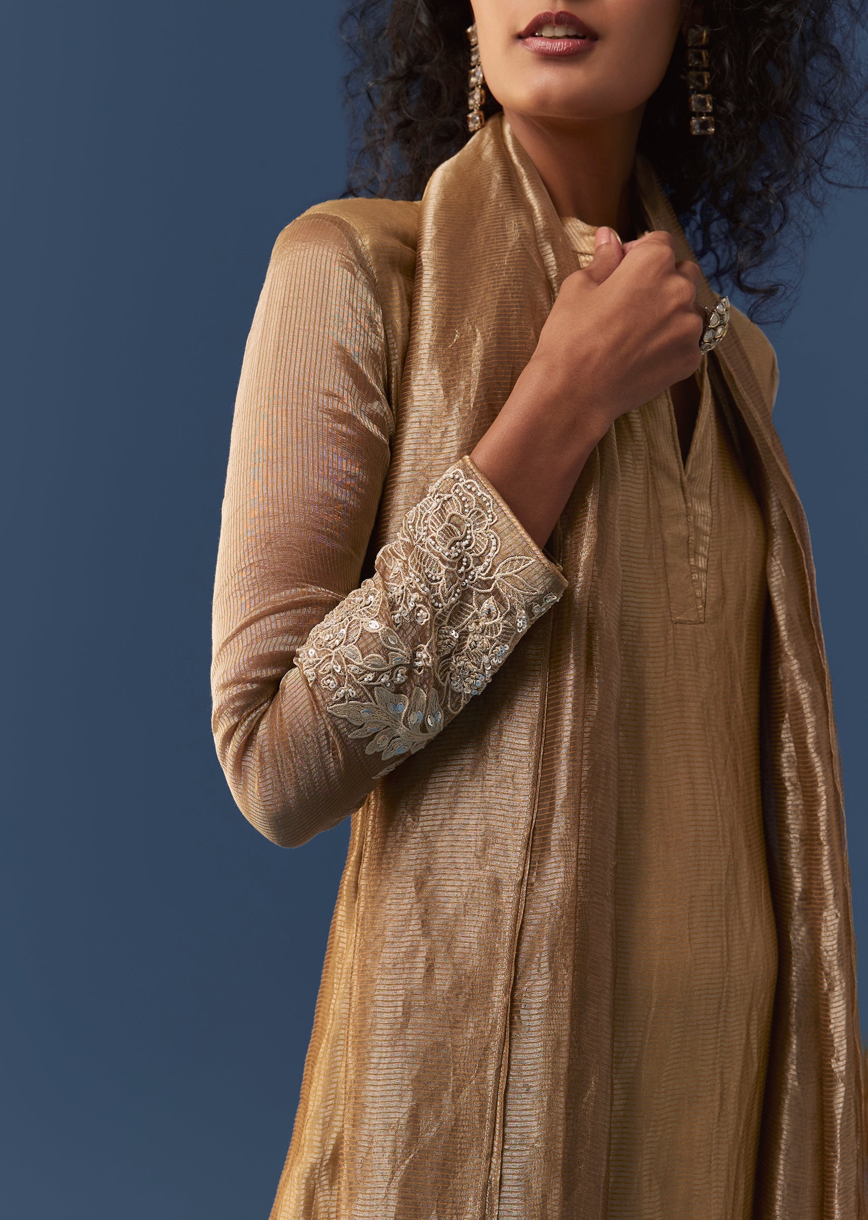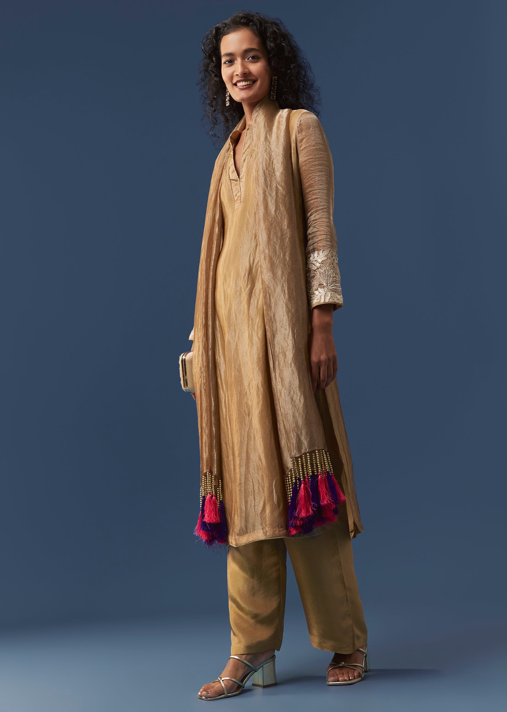Elegant and timeless, this resham and moti work tissue kurta set is designed for refined festive dressing. The kurta features intricate resham and moti embroidery on the sleeve cuffs, beautifully... More Product Details