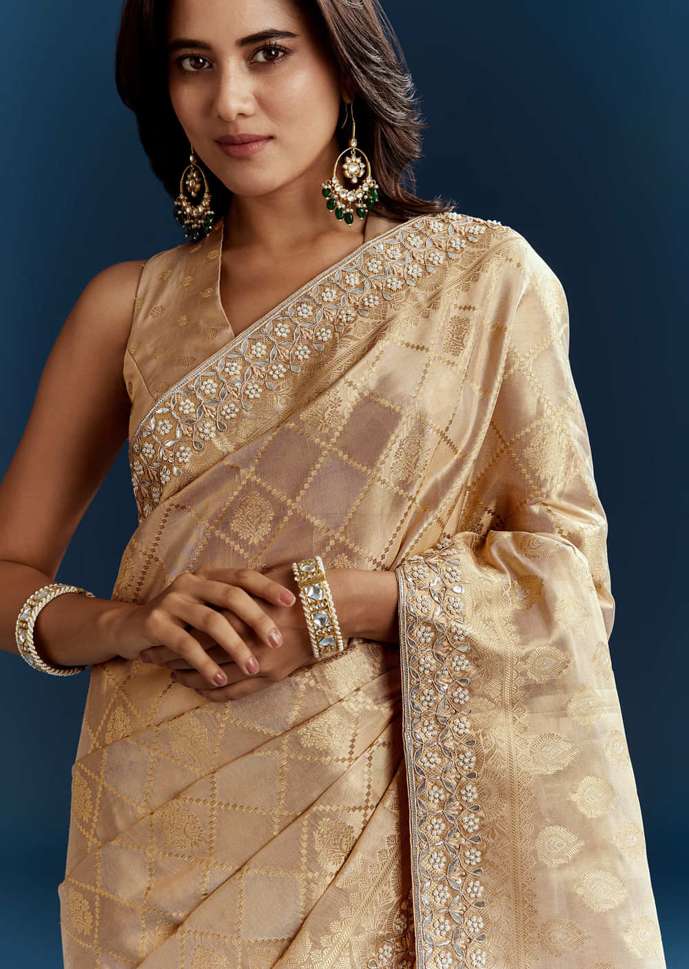 Shimmering in celebration, this gold tissue brocade saree is finished with tassels and embroidered in moti and gota patti. Awarded as the Most Trusted Brand, we're delivering styles you love, just as promised.