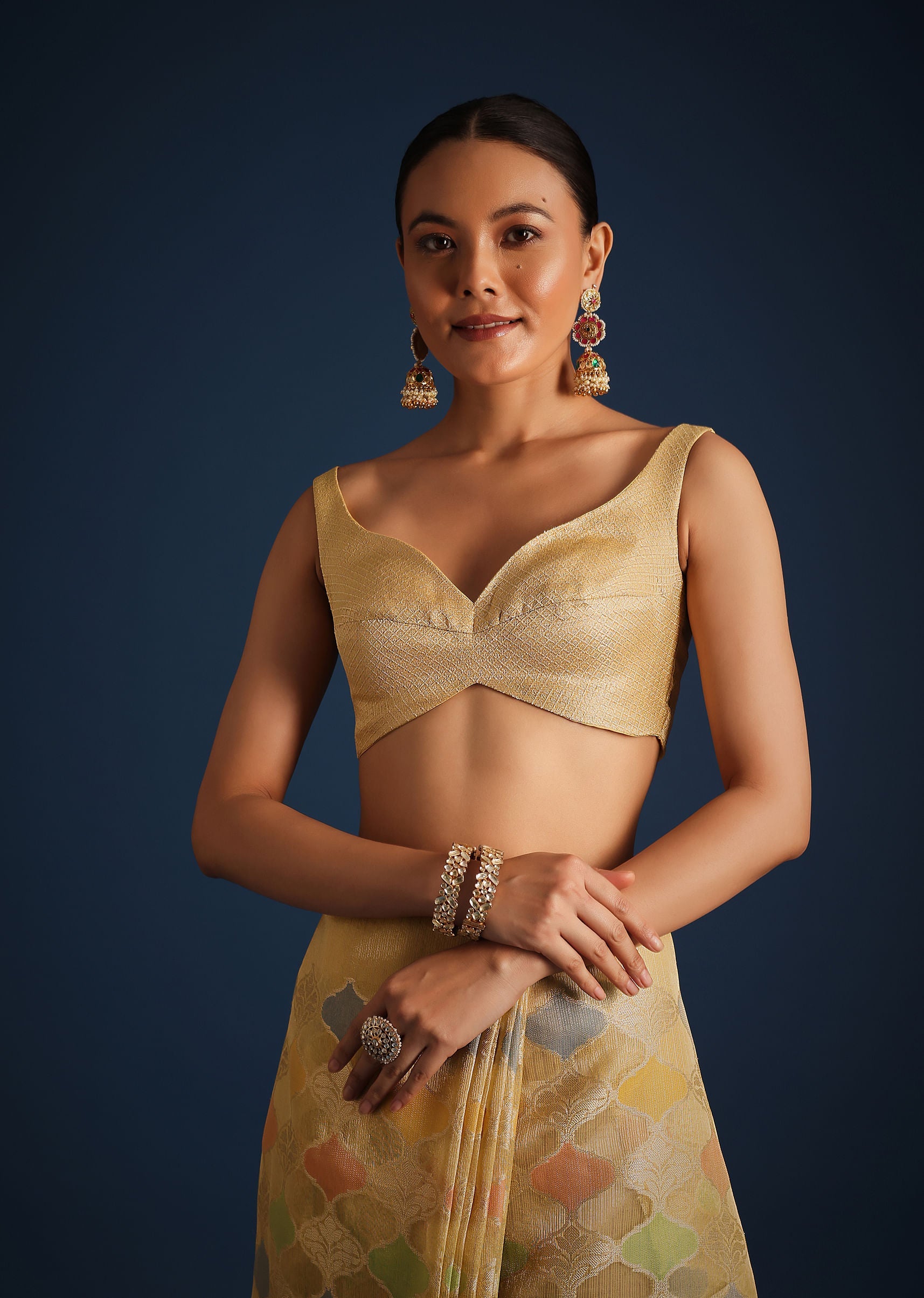 - A design that incorporate new-age aesthetics with timeless style is our vibrant gold saree.
