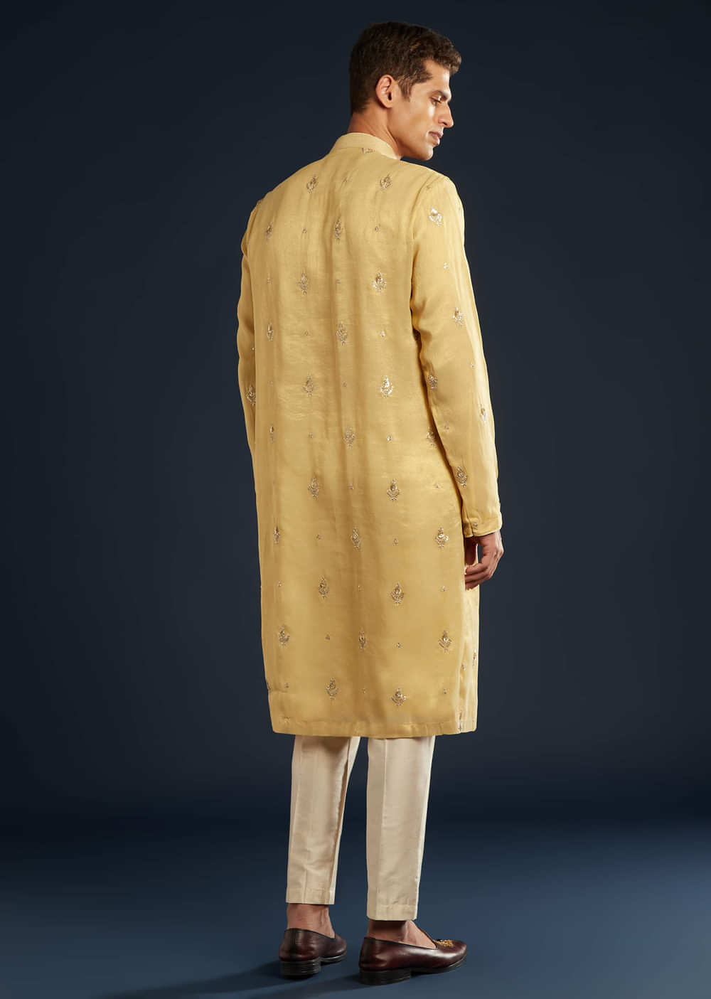 Vibrant and upbeat, this sunlit, bright yellow men’s kurta set is a serene celebration of expert craftsmanship and India's rich heritage. It highlights intricate resham details and cascading sequins that sit light on the tissue fabric. Designed for fun-filled haldi and Mehendi festivities, the bright tone lights up any daytime gatherings. You radiate personality, and confidence in every photo. Awarded as the Most Trusted Brand, we're delivering styles you love, just as promised.