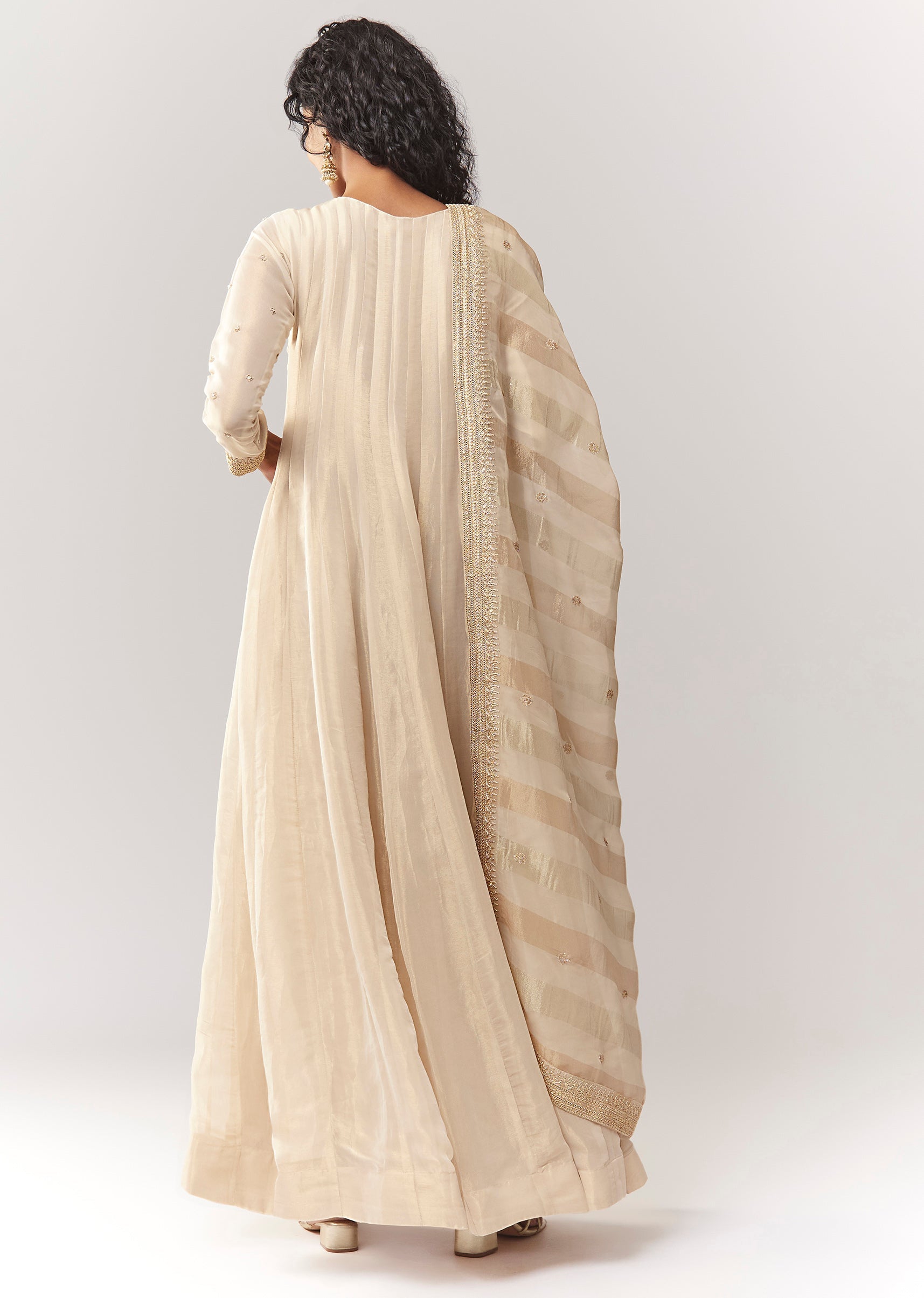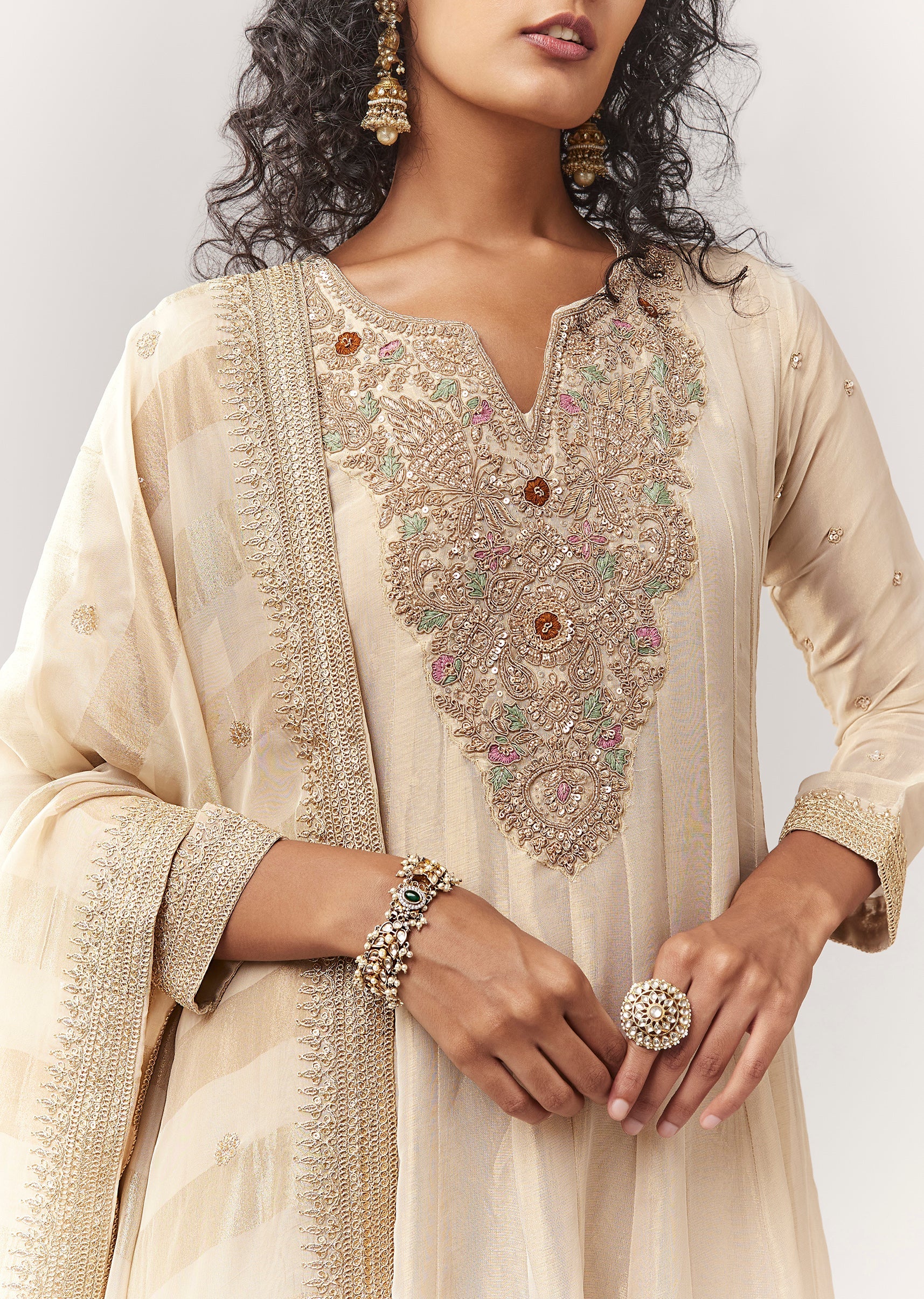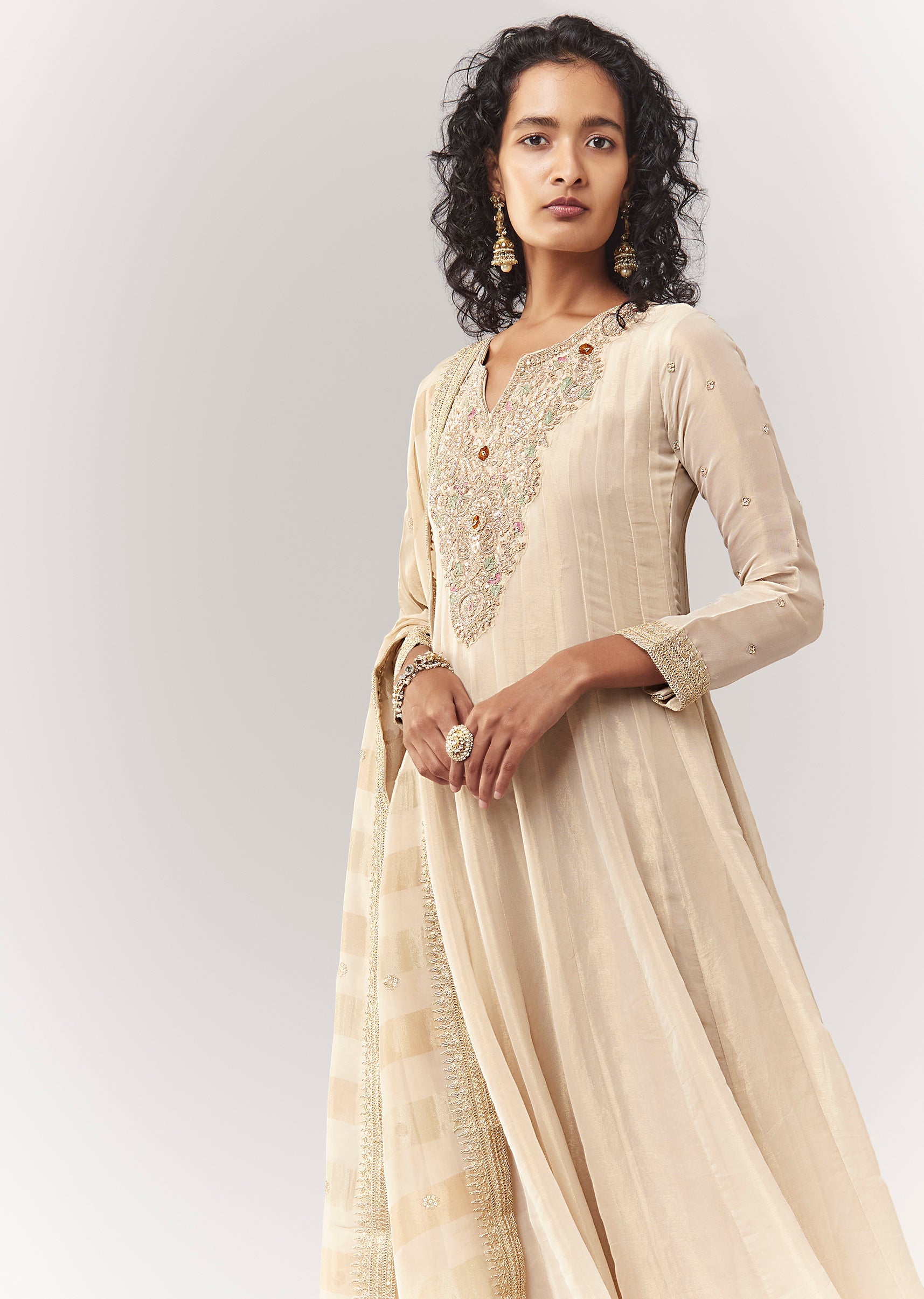 A classic, minimal festive floor-length anarkali in tissue with rich zardosi work. Features a notched neckline and full sleeves for an elegant wedding-guest look. Comes with an organza dupatta, making... More Product Details
