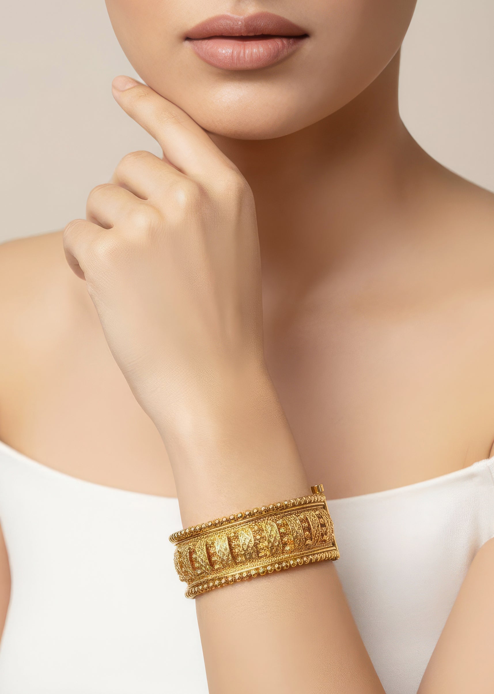 A traditional temple inspired bangle set crafted in a radiant gold finish. The design features intricate temple motifs in plain gold that reflect timeless elegance and heritage craftsmanship. Perfect for weddings and festive occasions, these bangles enhance bridal and family looks with understated traditional charm.