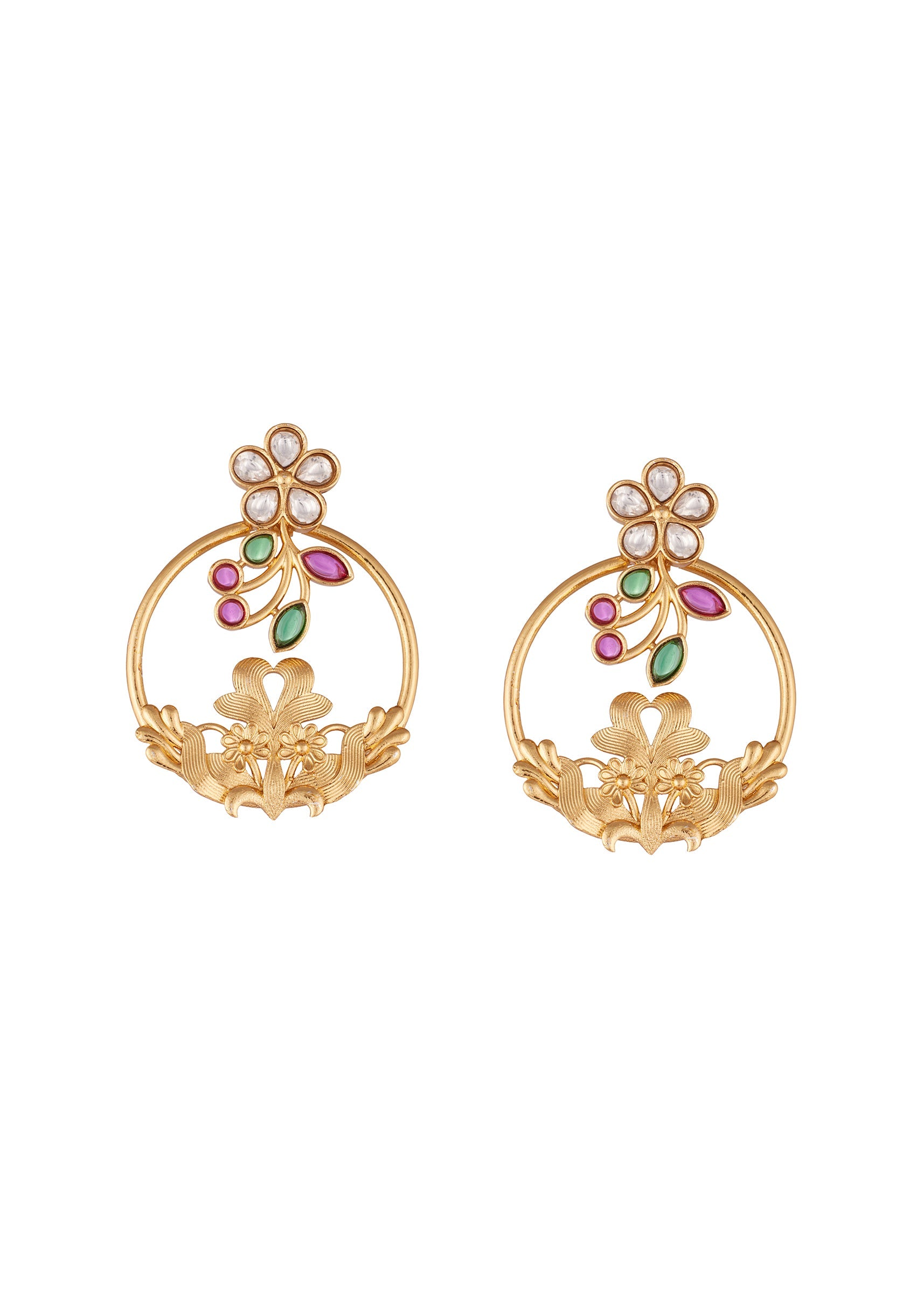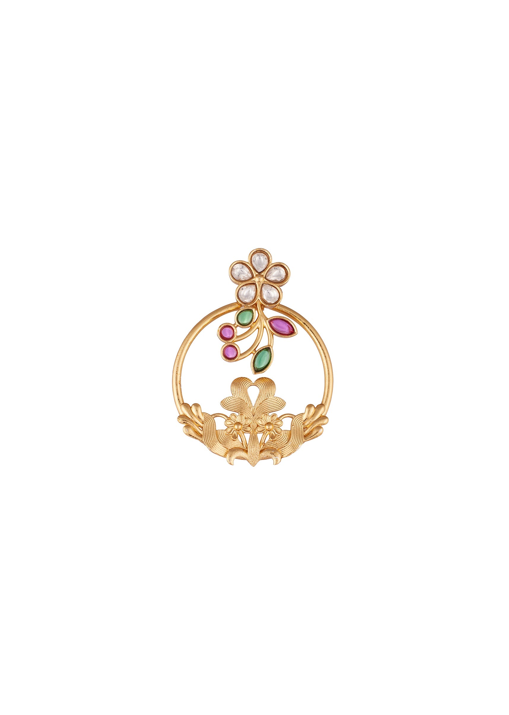A large gold toned hoop earring featuring a delicate floral vine motif set with clear white Kundan alongside pink and green stones. The design is enhanced with ornate filigree work... More Product Details