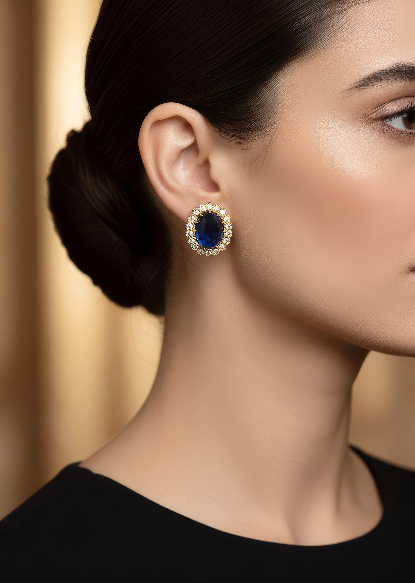 A gold toned statement earring featuring a large central oval dome cut blue stone that creates a striking focal point. The design is framed with a scalloped halo of brilliant cut white cubic zirconia stones adding refined sparkle and dimension. Handcrafted with care this bold yet elegant pair elevates festive evening and wedding ready looks with its rich colour contrast and polished finish.