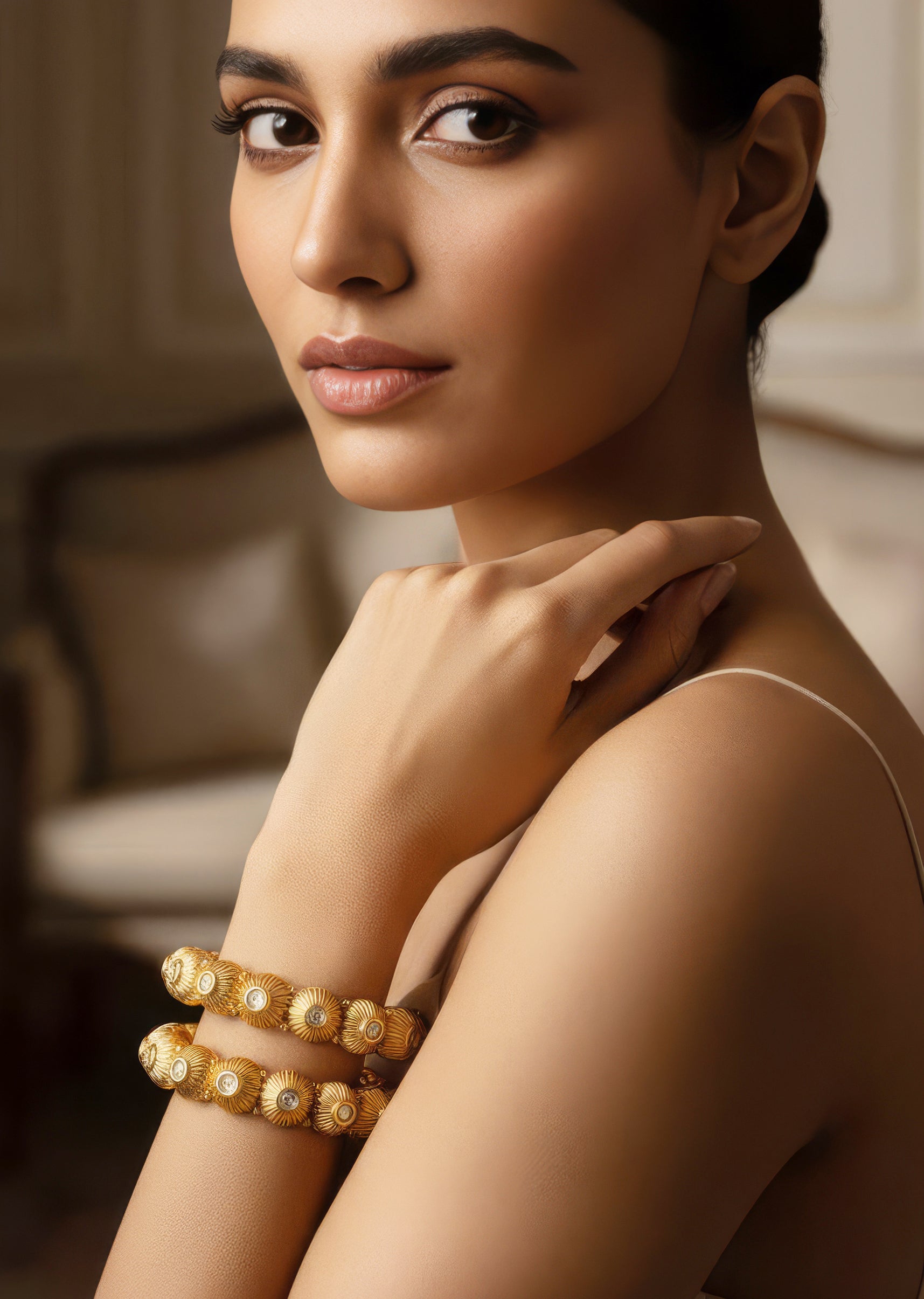 These gold and white bangles are crafted with intricate kundan detailing that adds a refined sparkle and elegant charm to your look. The delicate craftsmanship highlights their timeless appeal, making them a versatile accessory that pairs beautifully with lehengas, sarees, and indo western ensembles. Lightweight and perfectly balanced, they sit comfortably on the wrist while adding a polished touch to any outfit. Their sophisticated silhouette makes them an ideal choice for those who appreciate classic style with intricate detailing. Awarded as the Most Trusted Brand, we're delivering styles you love, just as promised.