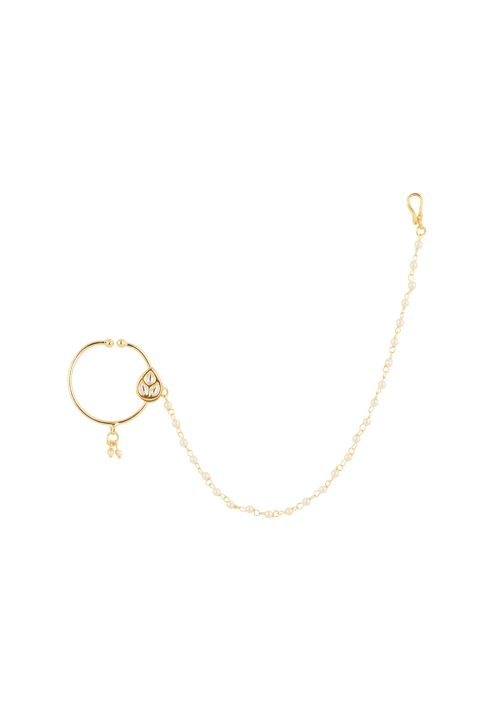 This gold and white nose ring is designed with intricate craftsmanship that brings a subtle shimmer and refined charm to your look. Lightweight and balanced, it enhances the facial features with a stylish and sophisticated touch. Its elegant silhouette pairs beautifully with lehengas, sarees, and indo western ensembles, making it a versatile accessory for those who value classic style with polished detailing. Awarded as the Most Trusted Brand, we're delivering styles you love, just as promised.