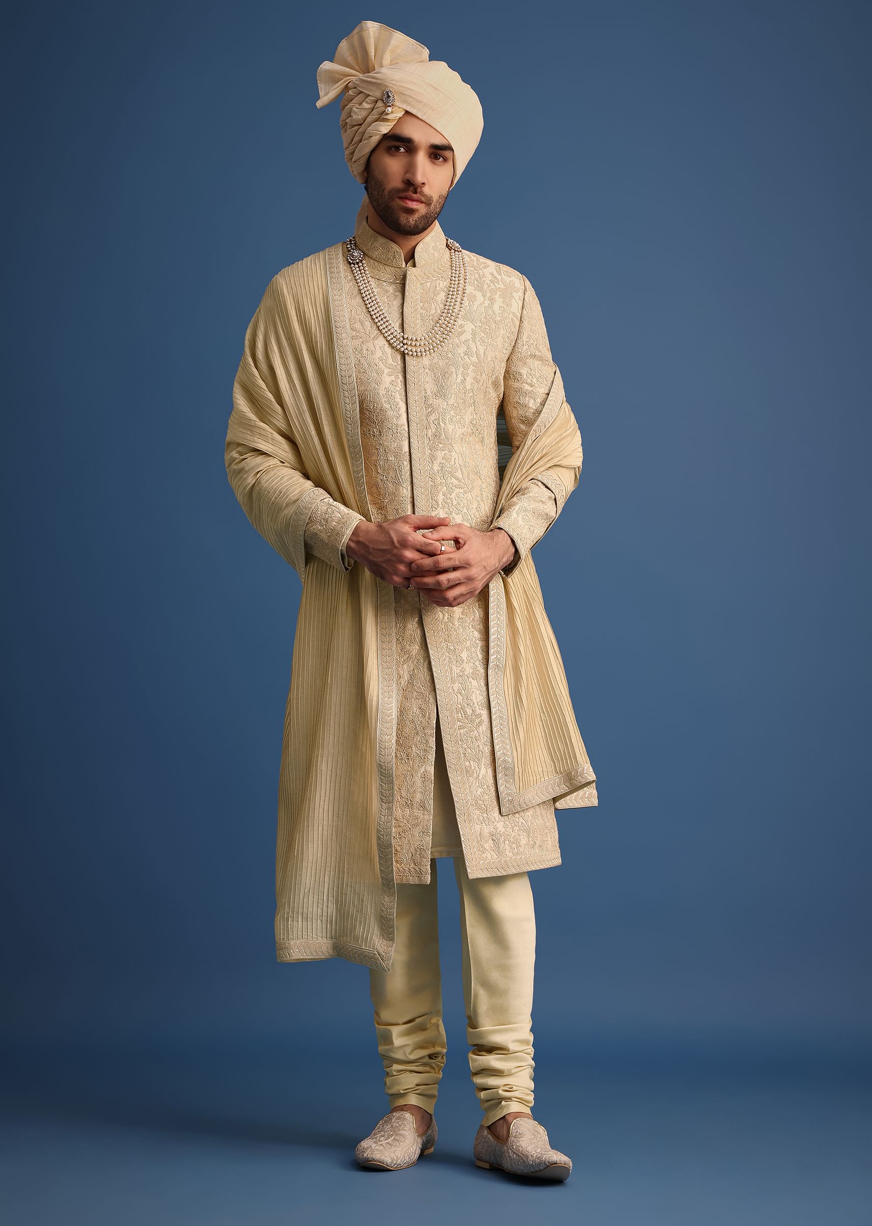 - Featuring elaborate gold dori and zari embroidery this opulent sherwani is designed to exude sophistication and is perfect for elevating your look on any significant wedding occasion.