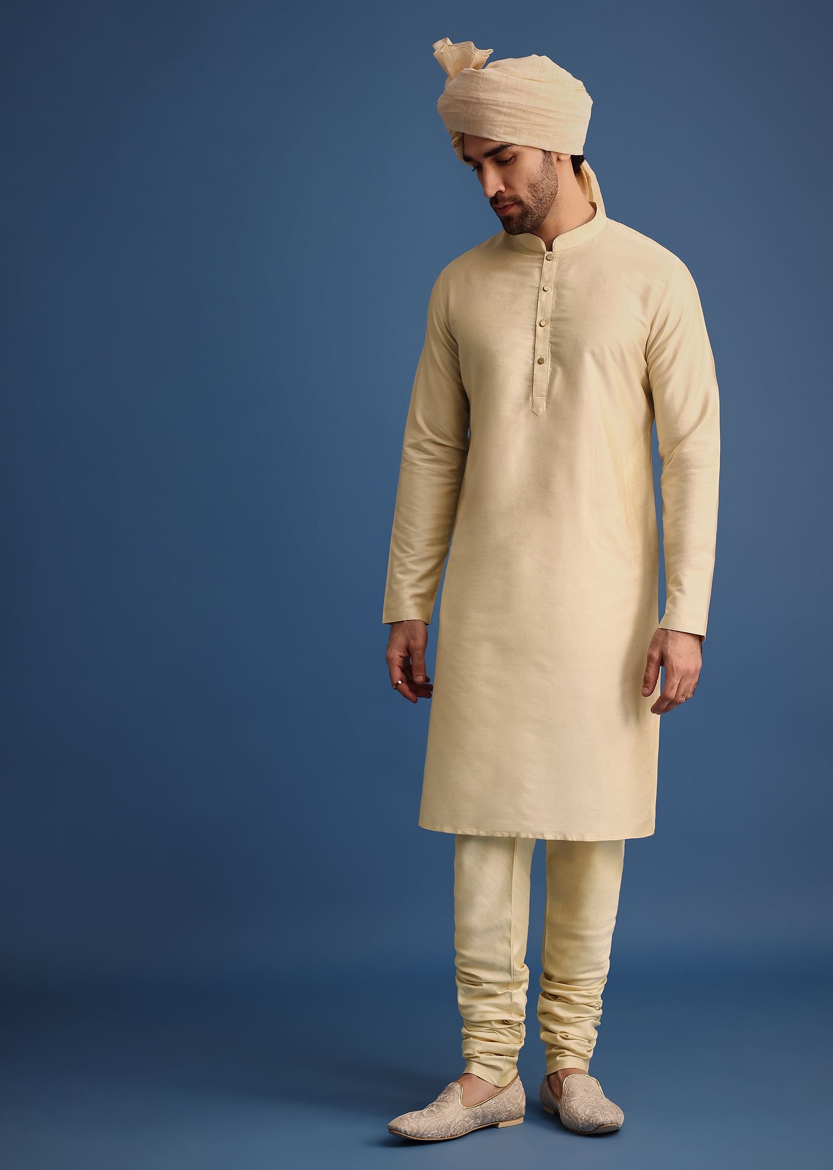 - Make a grand impression with our Gold Sherwani Set skillfully fashioned on a refined raw silk base.