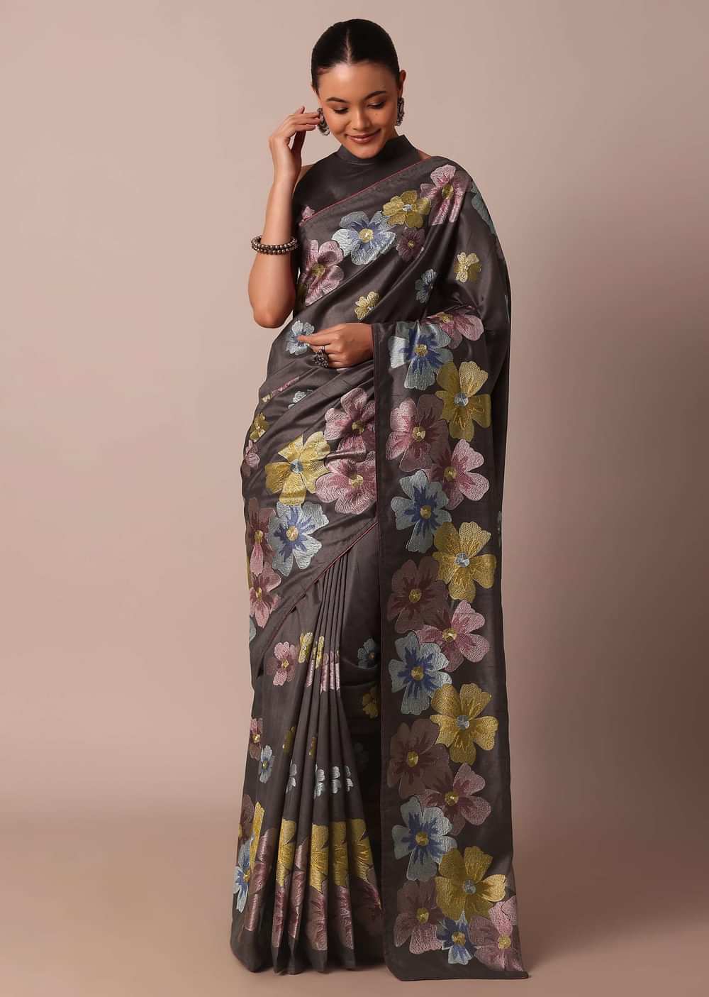 Graceful Grey Saree With Exquisite Thread Resham Work