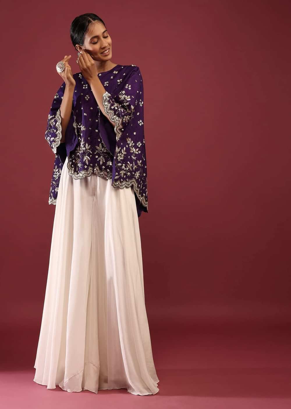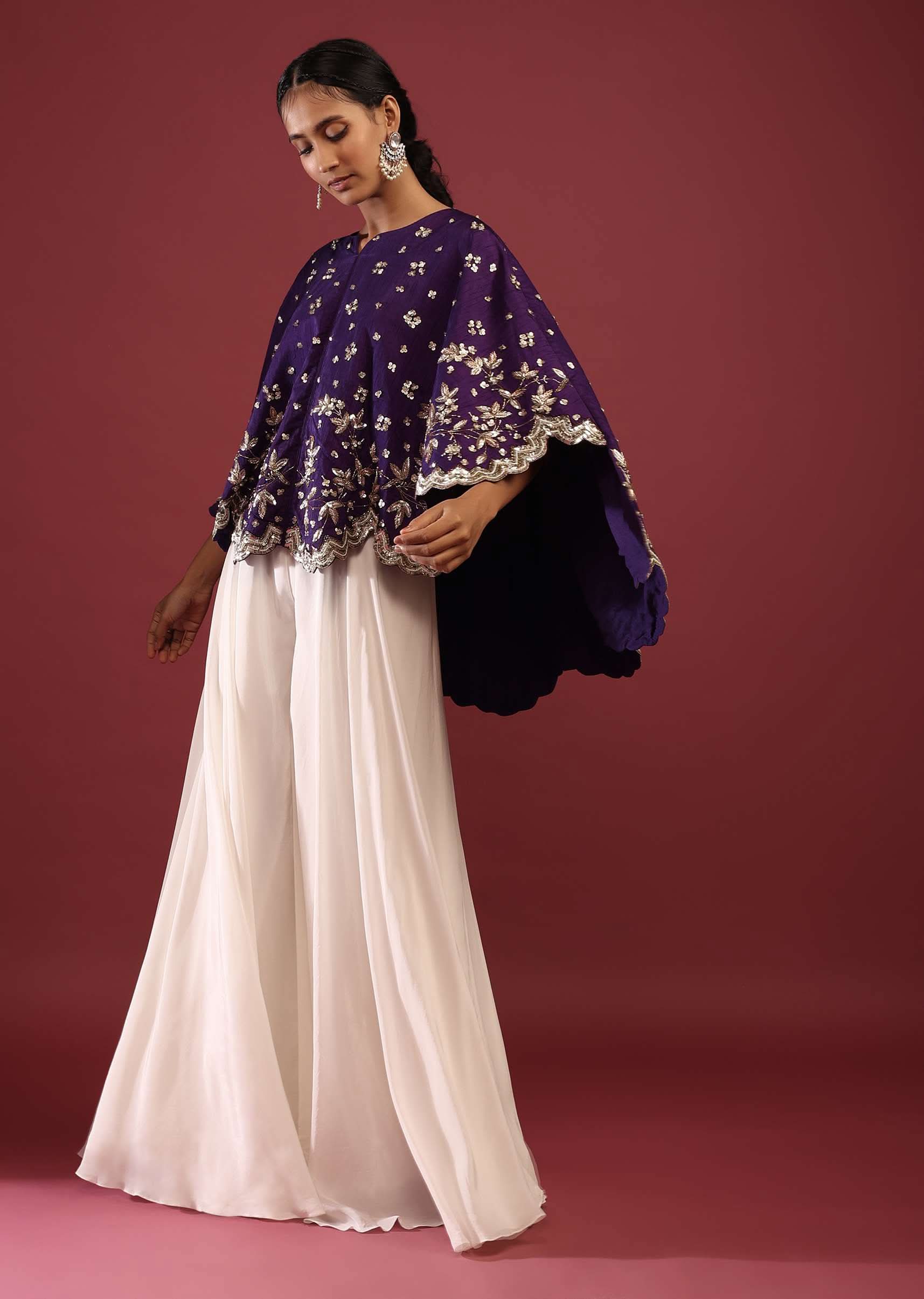 Grape Purple High Low Cape And White Palazzo Suit With Sequins And Zardosi Flowers