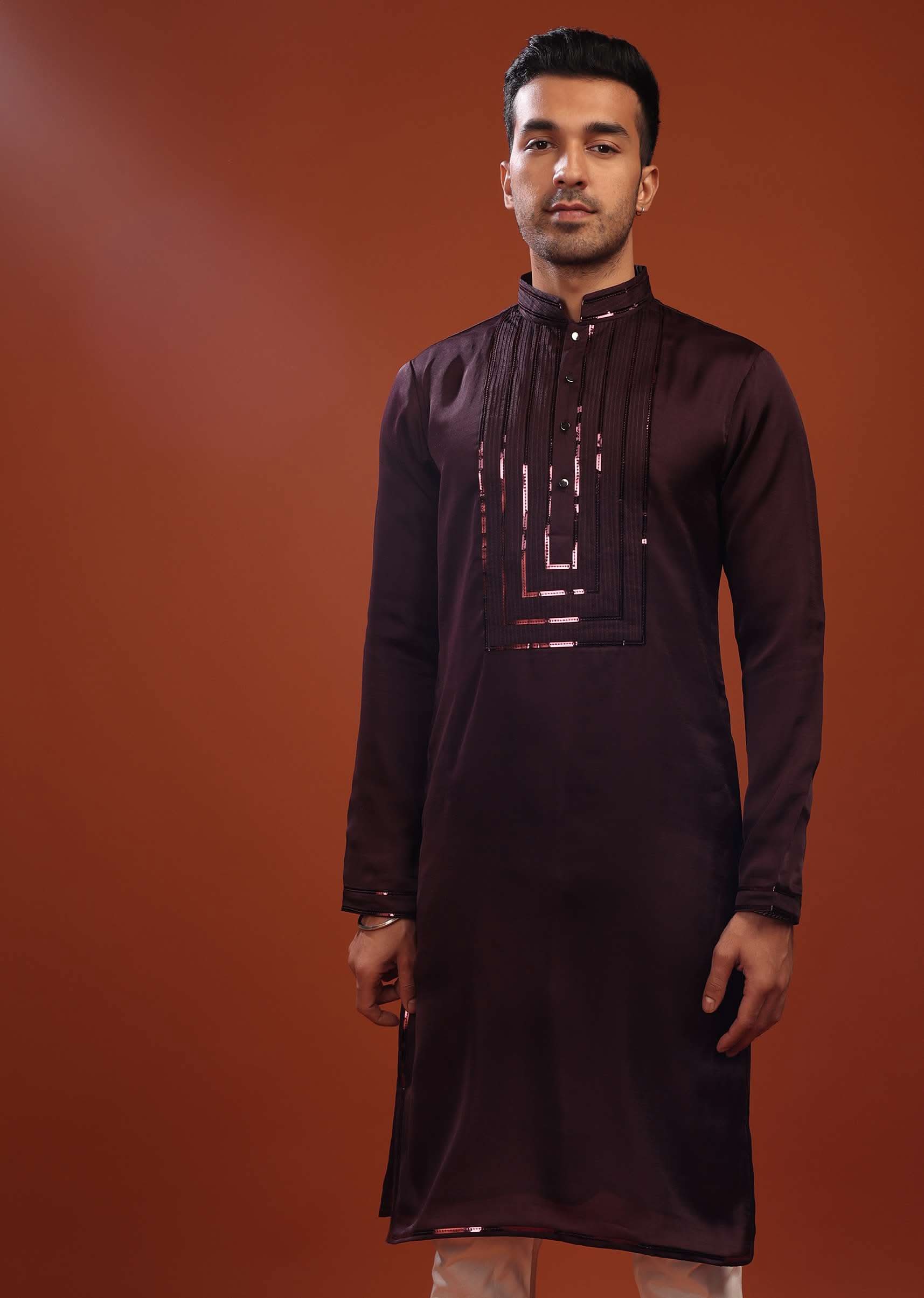 - Festive Potent Purple Wine Kurta set in handloom silk suiting fabric.