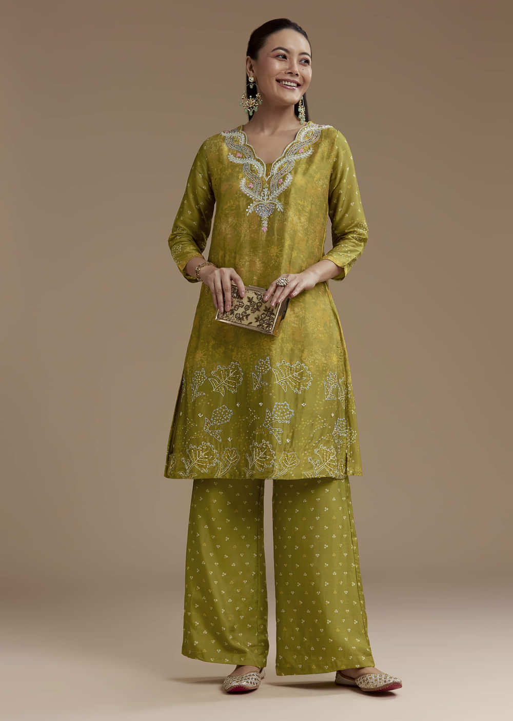 Channel effortless sophistication in this green abstract print silk kurta and palazzo set. Crafted from lustrous silk, the kurta showcases fluid abstract motifs that lend it a modern edge, while... More Product Details
