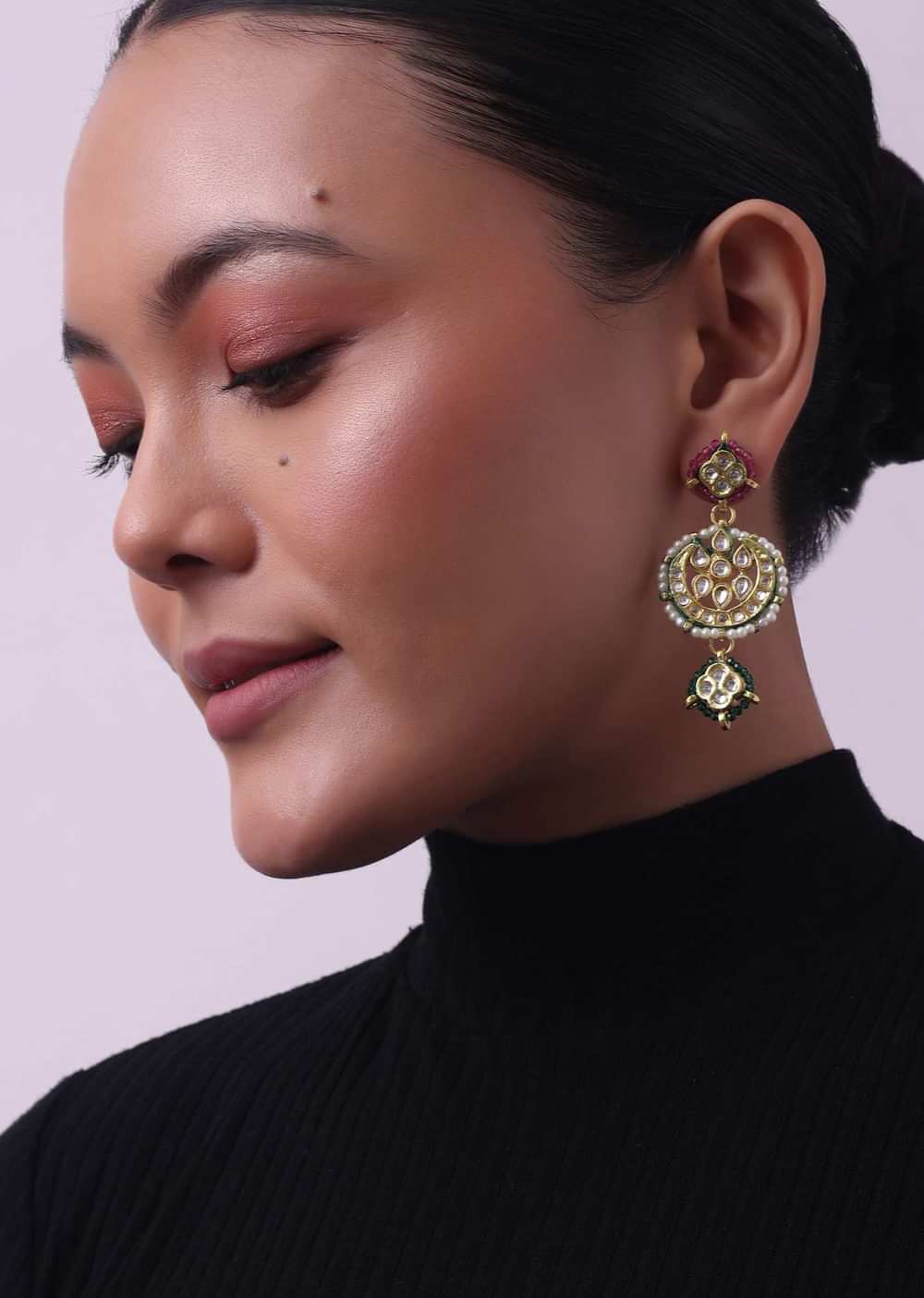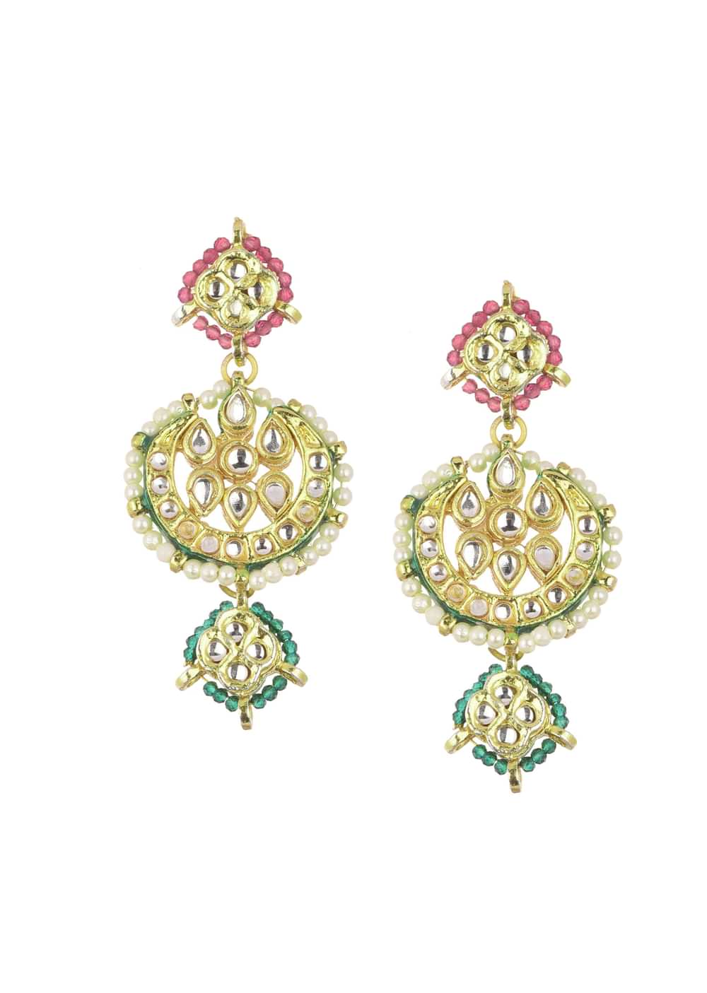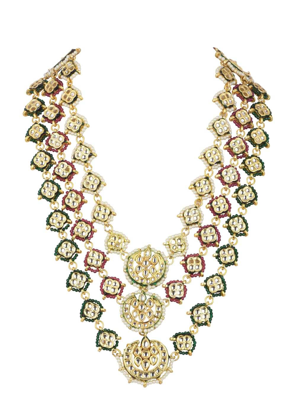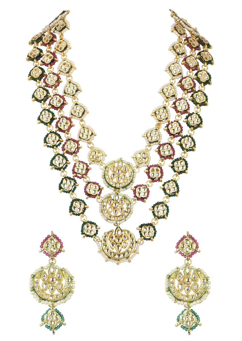 - Indulge in the beauty of our gold finish long layered kundan necklace setCrafted in mixed metal this set showcases a stunning green and red tone.