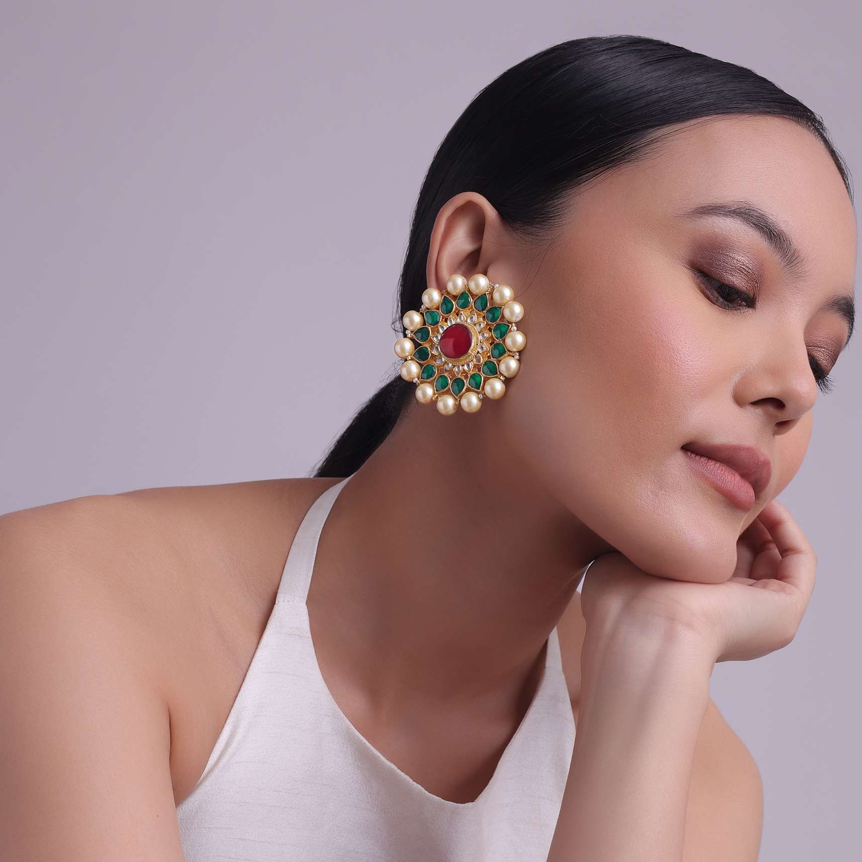 - The earrings have a beautiful big ruby stone studded in the middle, adorned in cut diamond stones, circled by emerald cut stones, and a final circle of pearls and beads.
