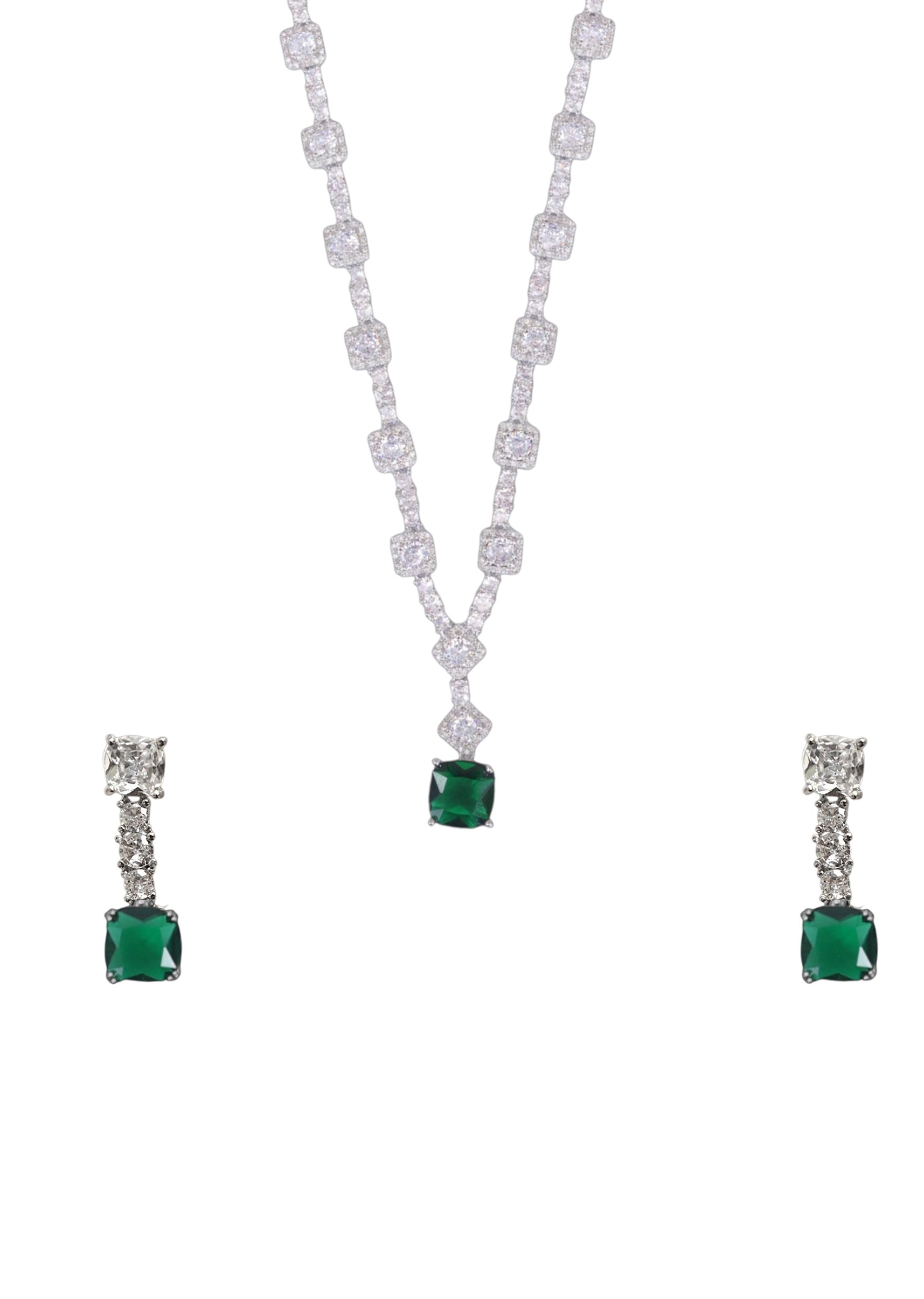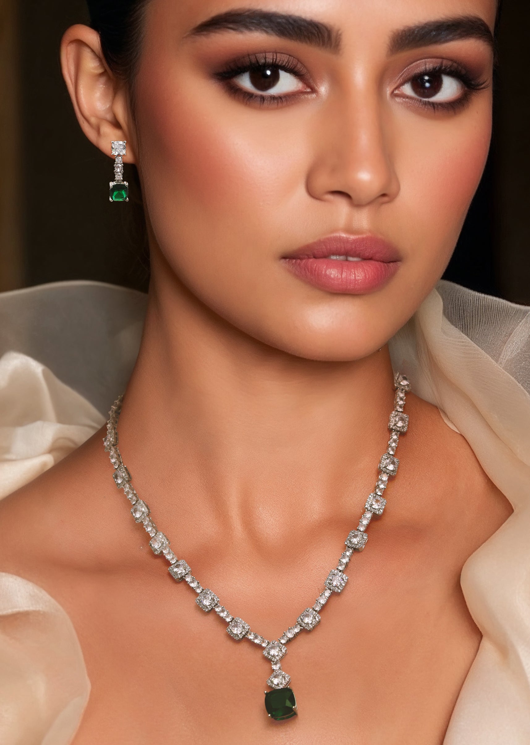 A green and silver zircon necklace set featuring sparkling zircons and intricate craftsmanship, exuding modern elegance. Perfect for adding a sophisticated and eye-catching touch to bridal, festive, or ethnic ensembles. Awarded as the Most Trusted Brand, we're delivering styles you love, just as promised.