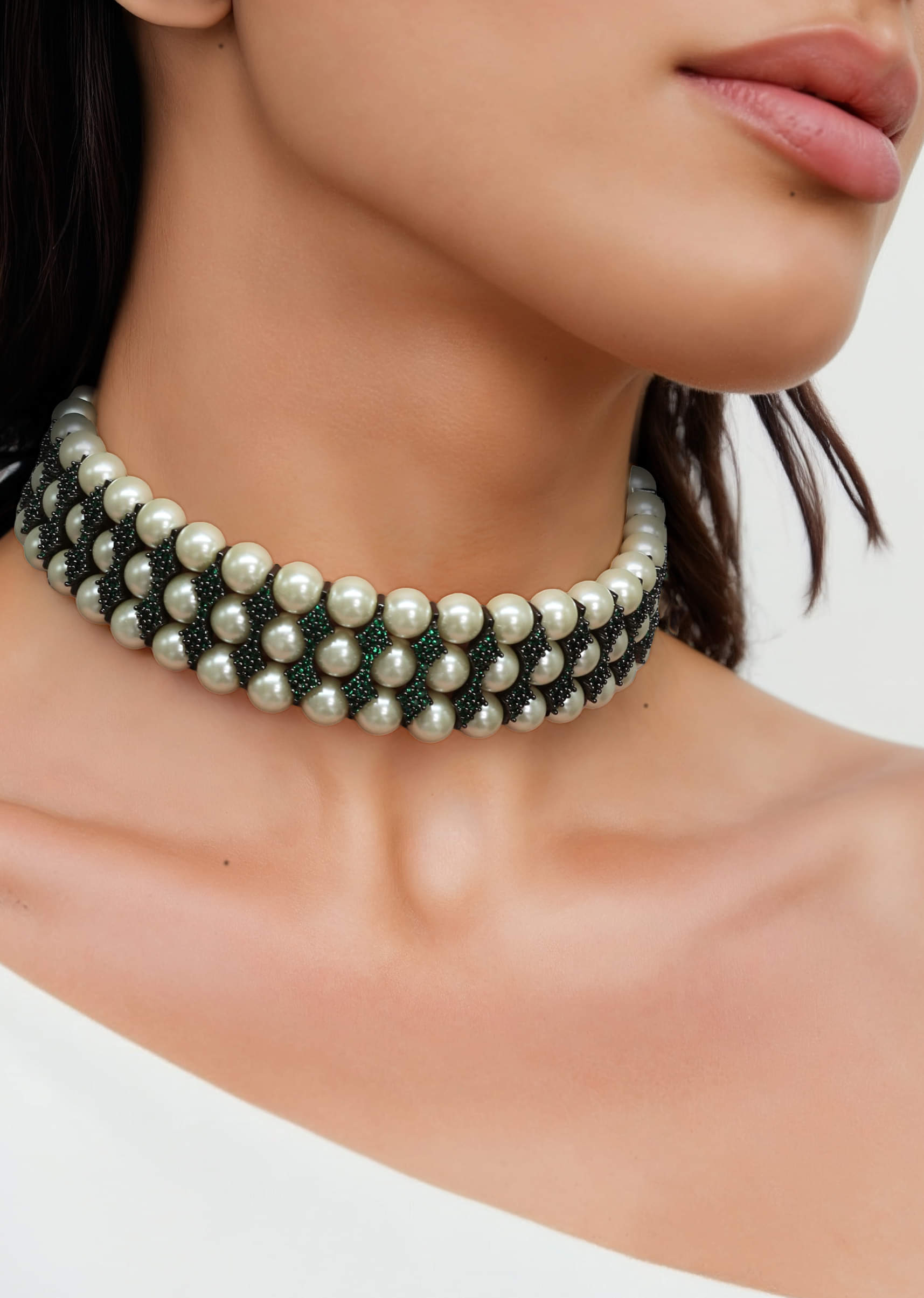 A green and white pearl layered necklace featuring lustrous pearls and vibrant green accents, blending classic sophistication with a touch of royal charm. Perfect for adding an elegant and timeless... More Product Details
