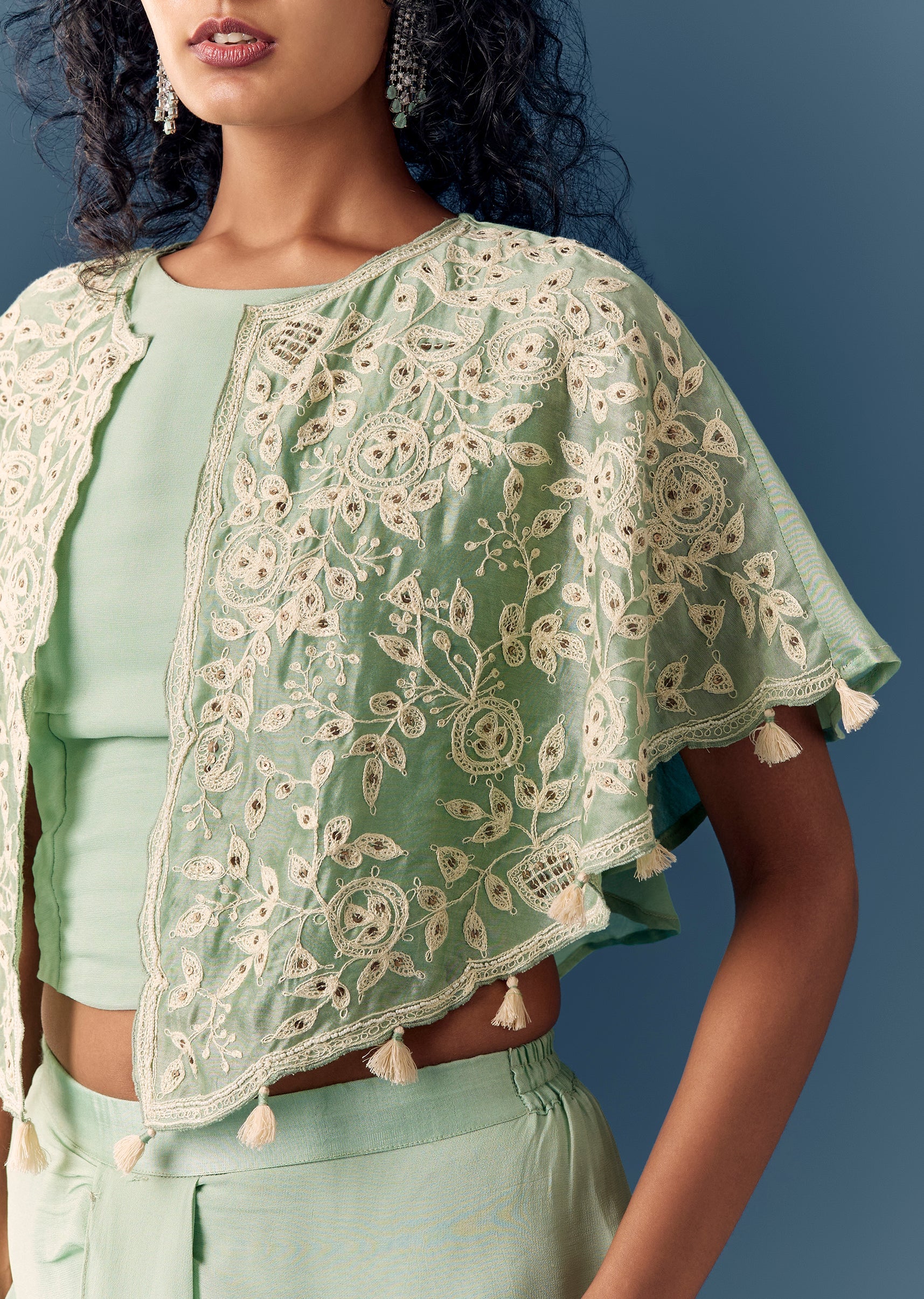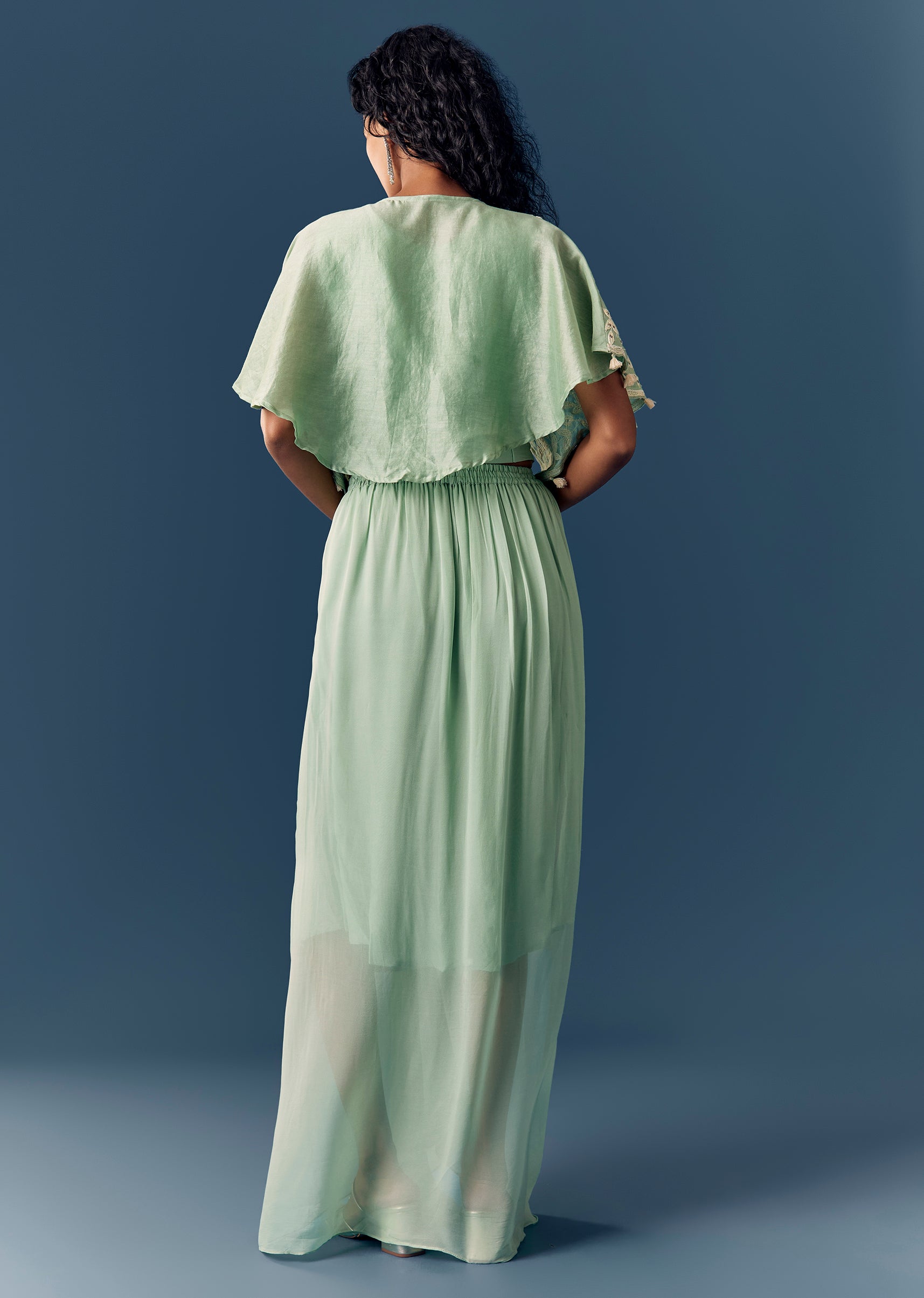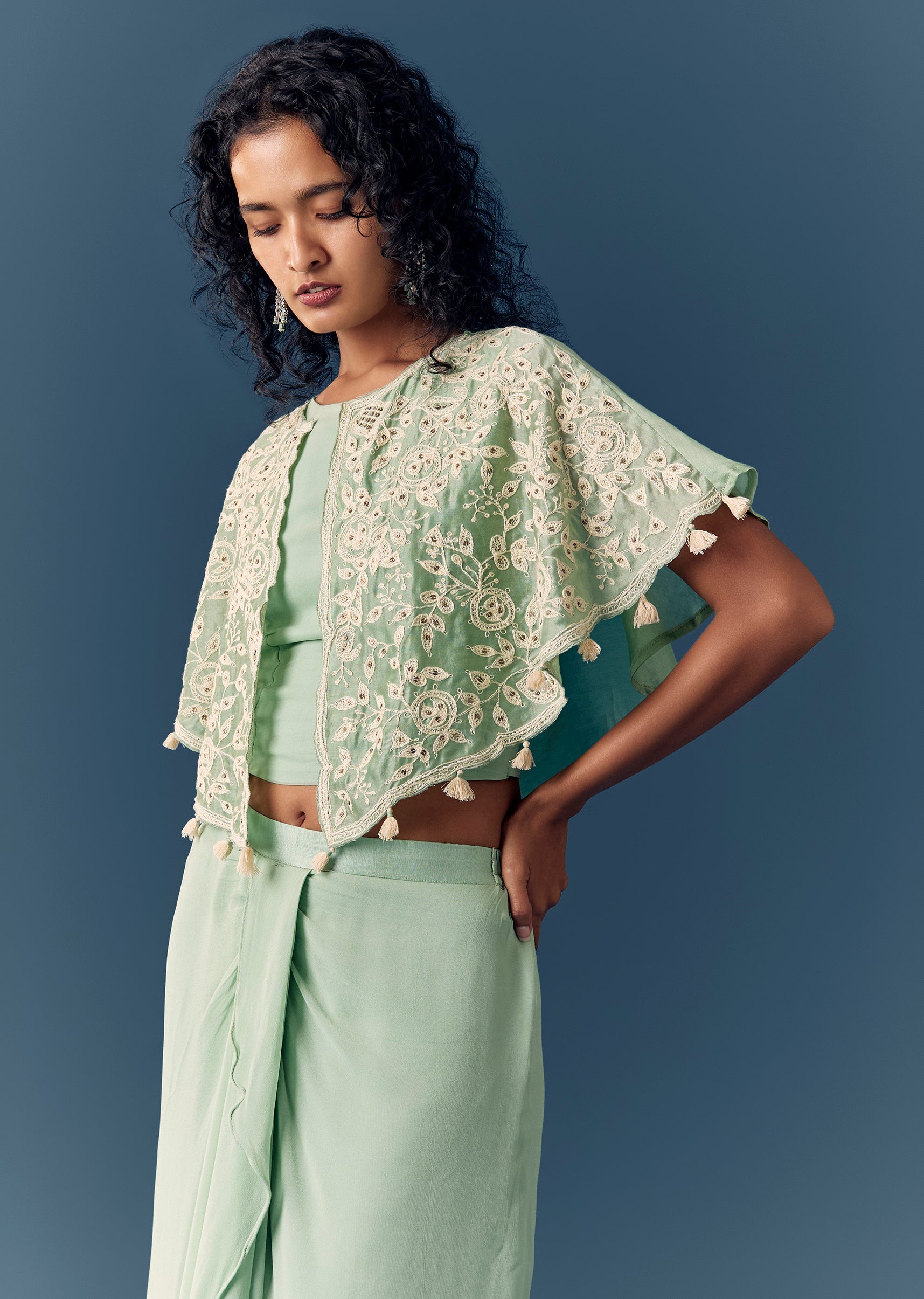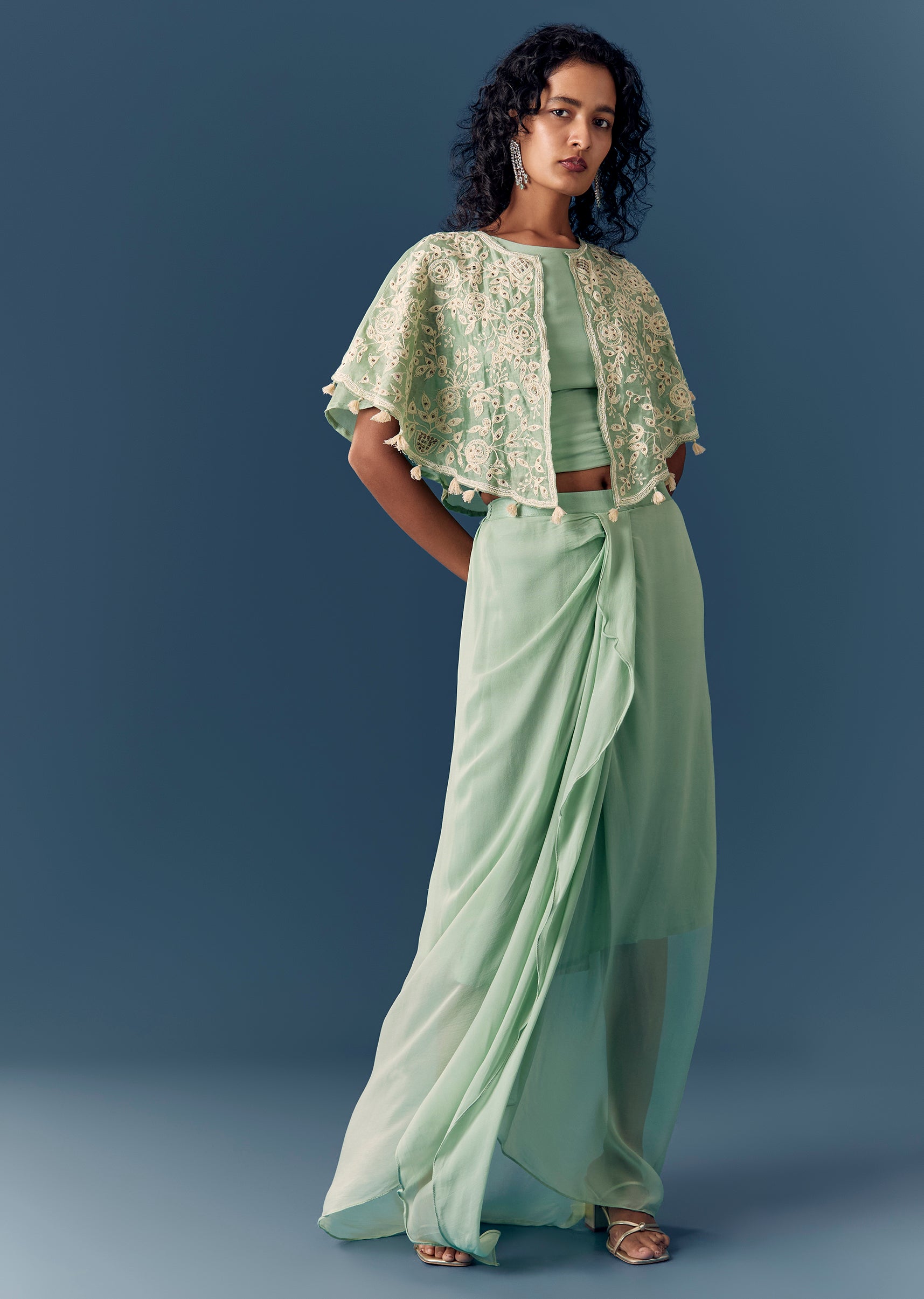 A contemporary festive set featuring a thread and sequin worked cape paired with a drape skirt and croptop. Sleeveless round-neck styling with side zip—ideal for modern festive occasions. Awarded as... More Product Details