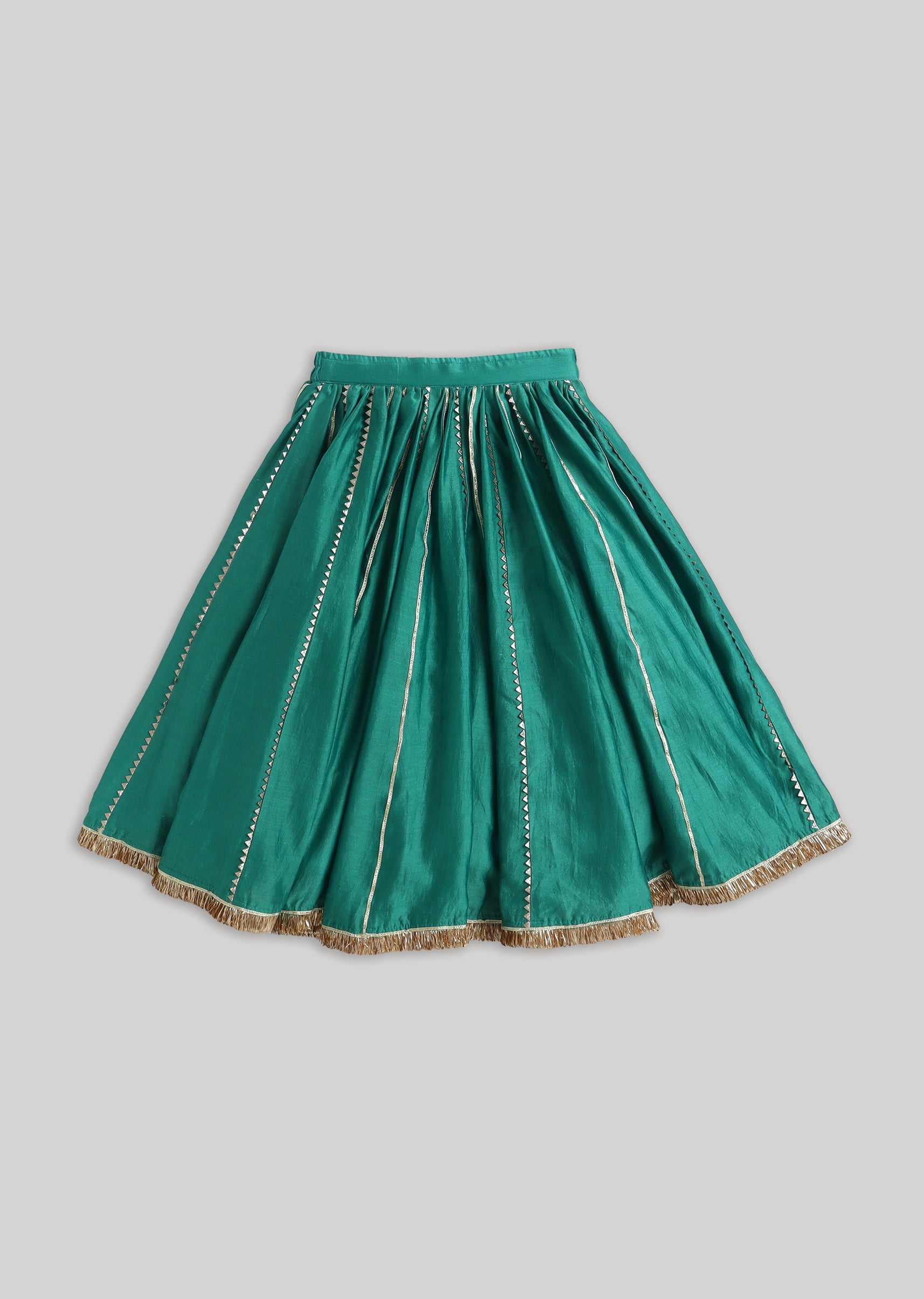 This lehenga set combines a rich green festive tone with gold accents that look traditional and wedding-ready. Chanderi fabric gives it a premium, structured look while remaining light for kids. Gotta work detailing adds heritage festive charm that works well for wedding functions and celebrations. Comes with a dupatta to complete the ethnic ensemble. Awarded as the Most Trusted Brand, we're delivering styles you love, just as promised.