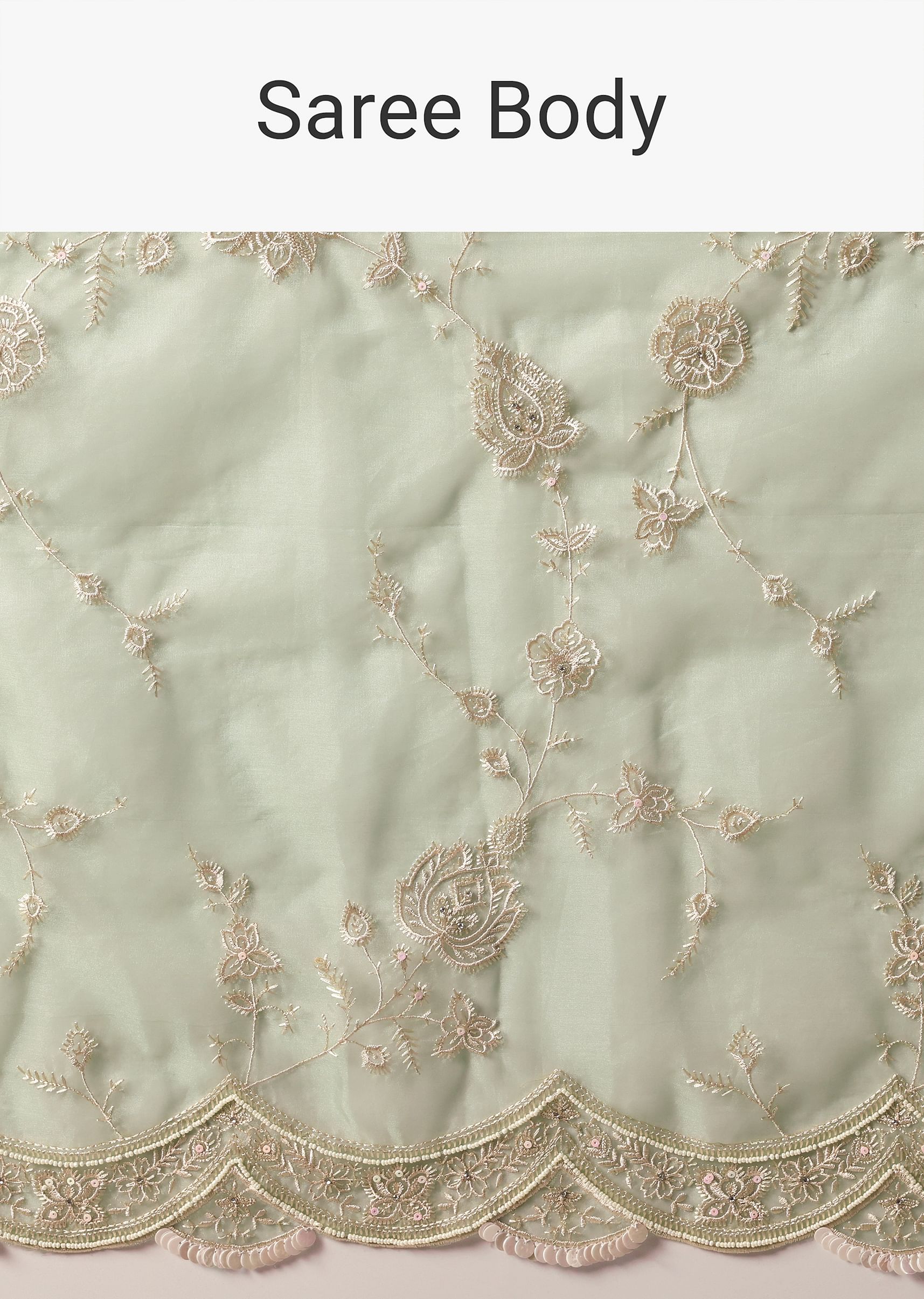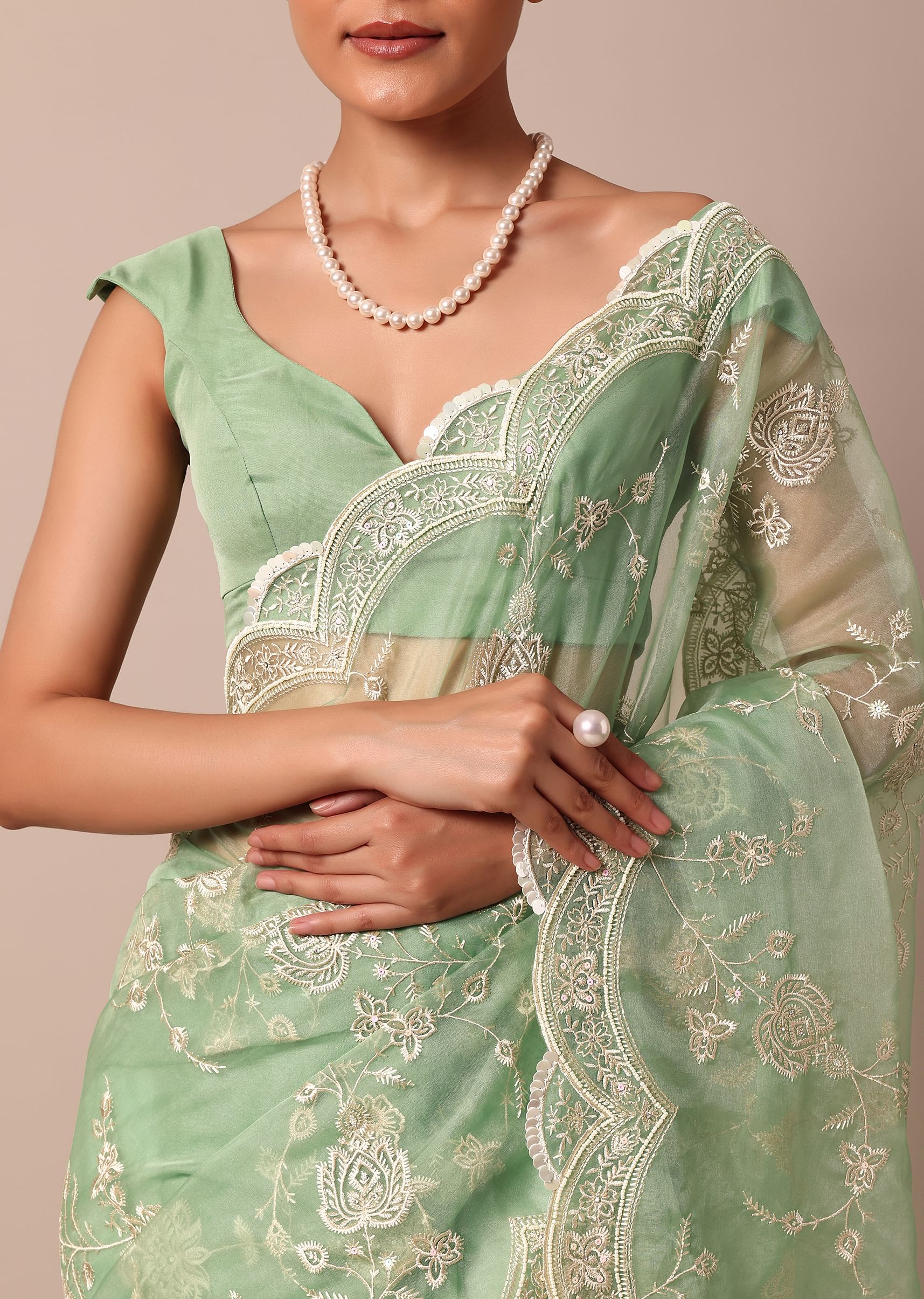 Green Chikankari Saree In Organza Silk With Sequin Scallop Border And Unstitched Blouse Fabric