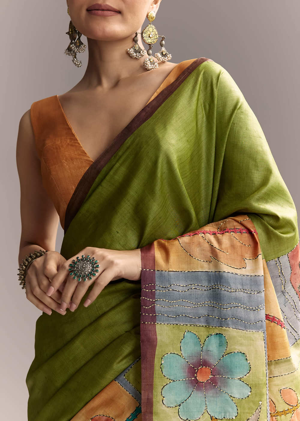 Green Cotton Saree With Hand Painted Floral Motifs And Contrast Border