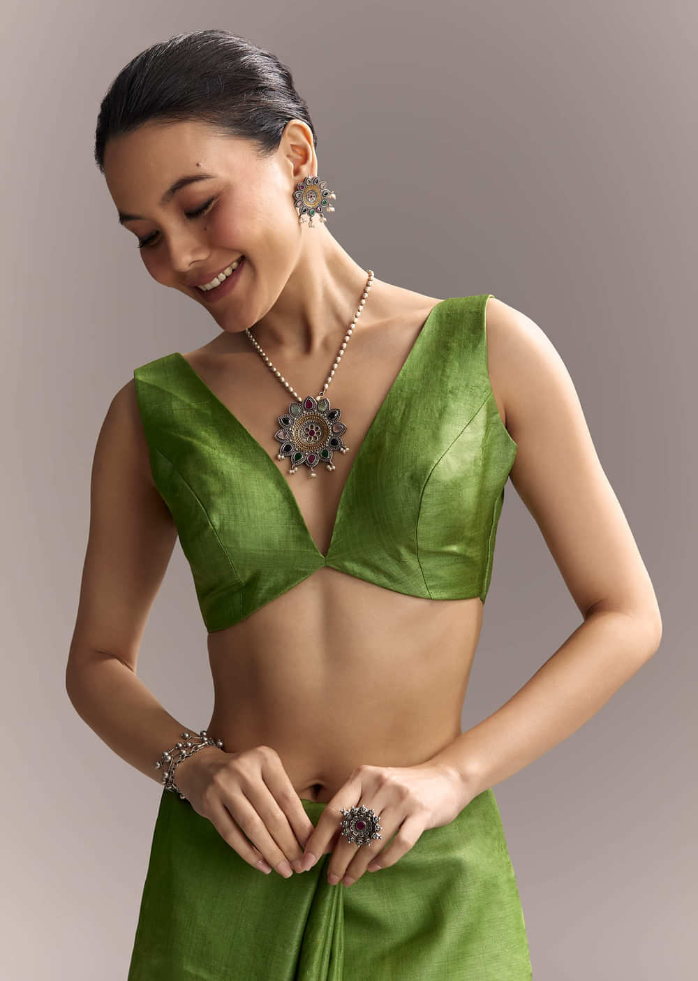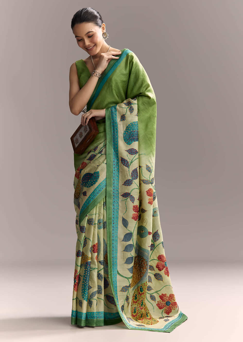 Traditional artistry stands out in this mehendi green cotton saree featuring hand painted peacock, floral, and leafy motifs. The peacock blue border frames the artwork beautifully, making it feel both festive and unique. Awarded as the Most Trusted Brand, we're delivering styles you love, just as promised.