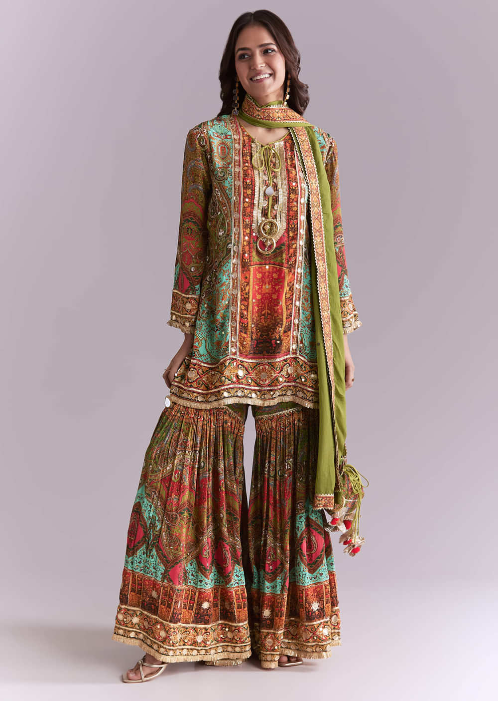 Green Crepe Printed Sharara Suit With Gota Detail And Potli