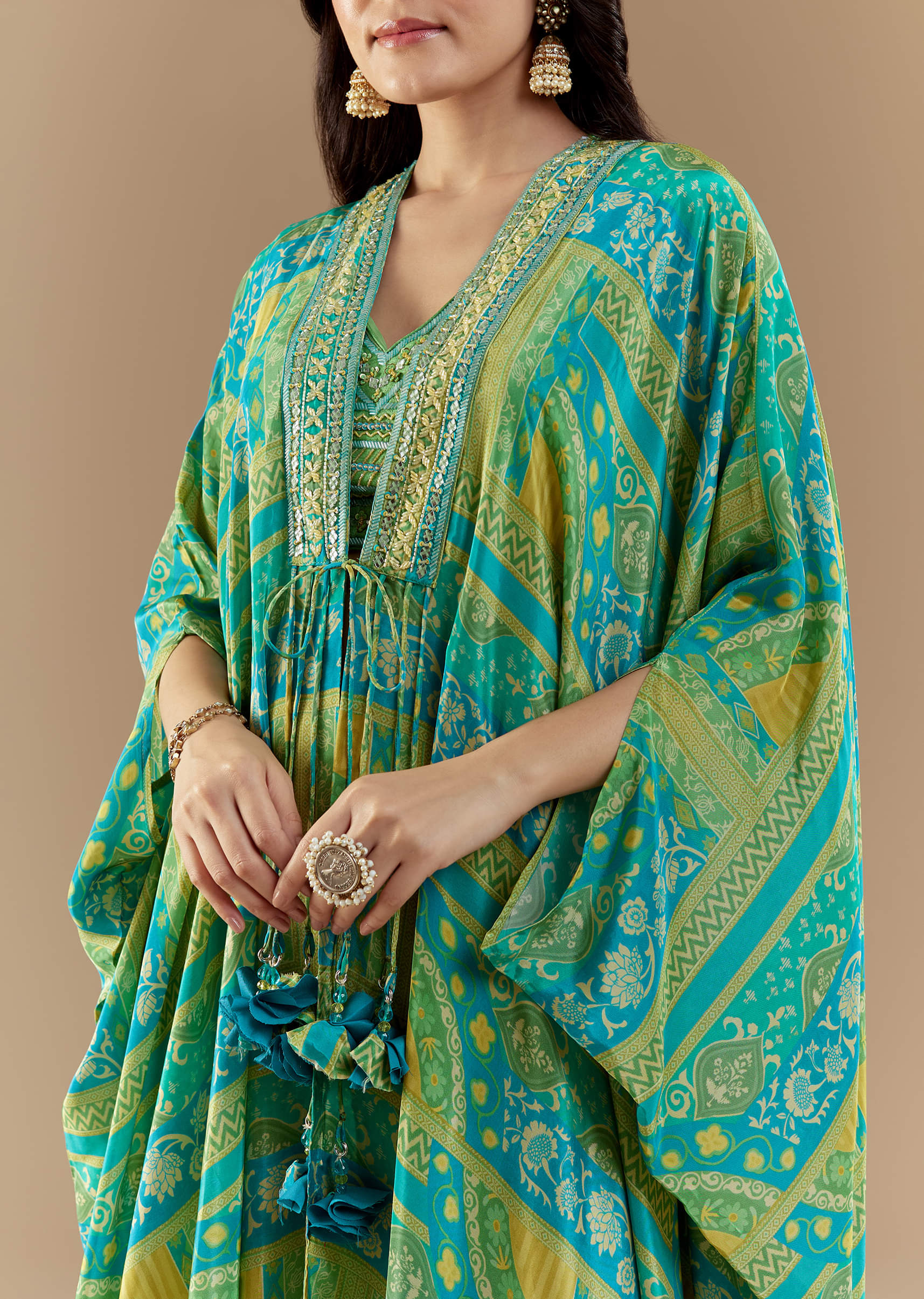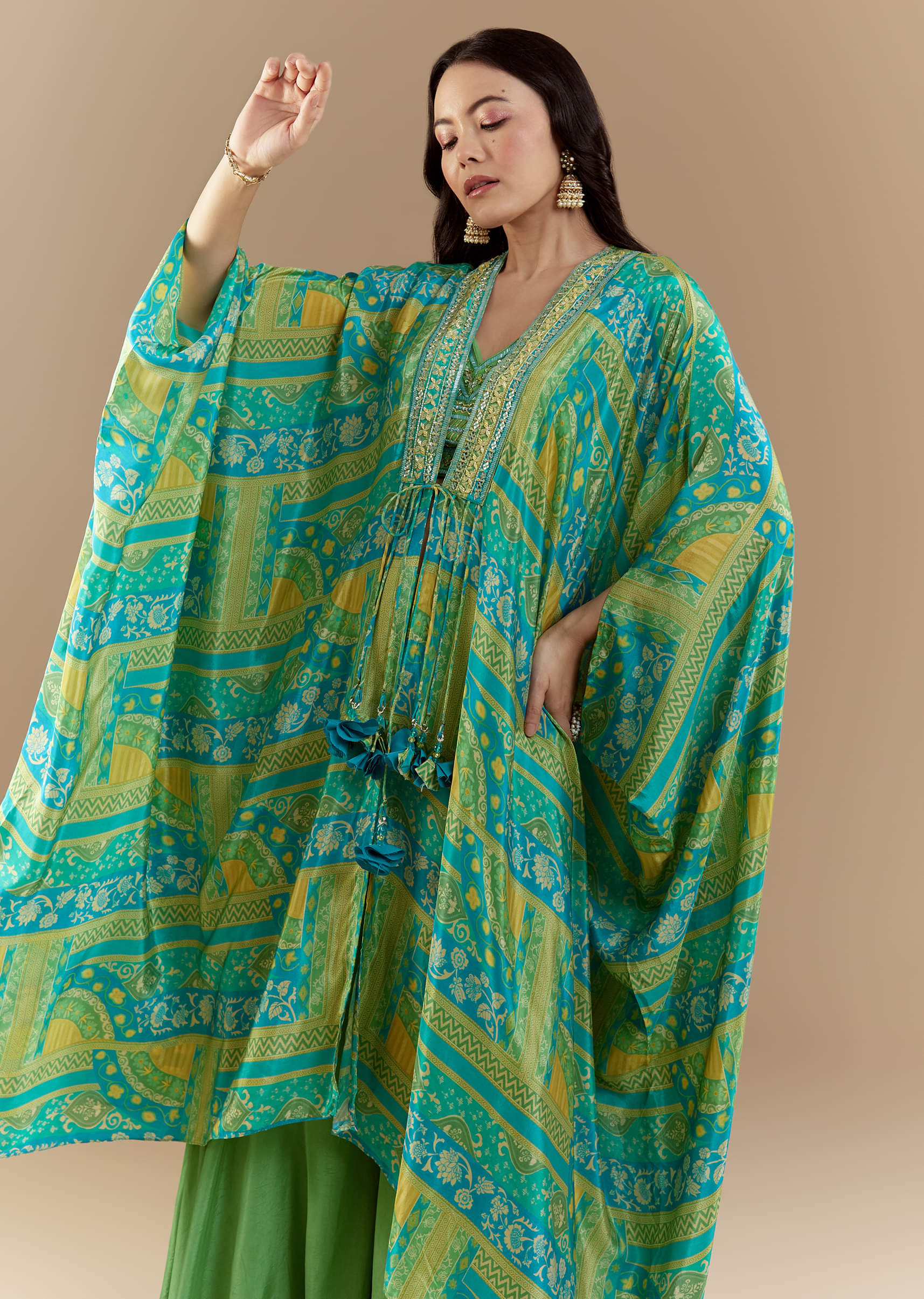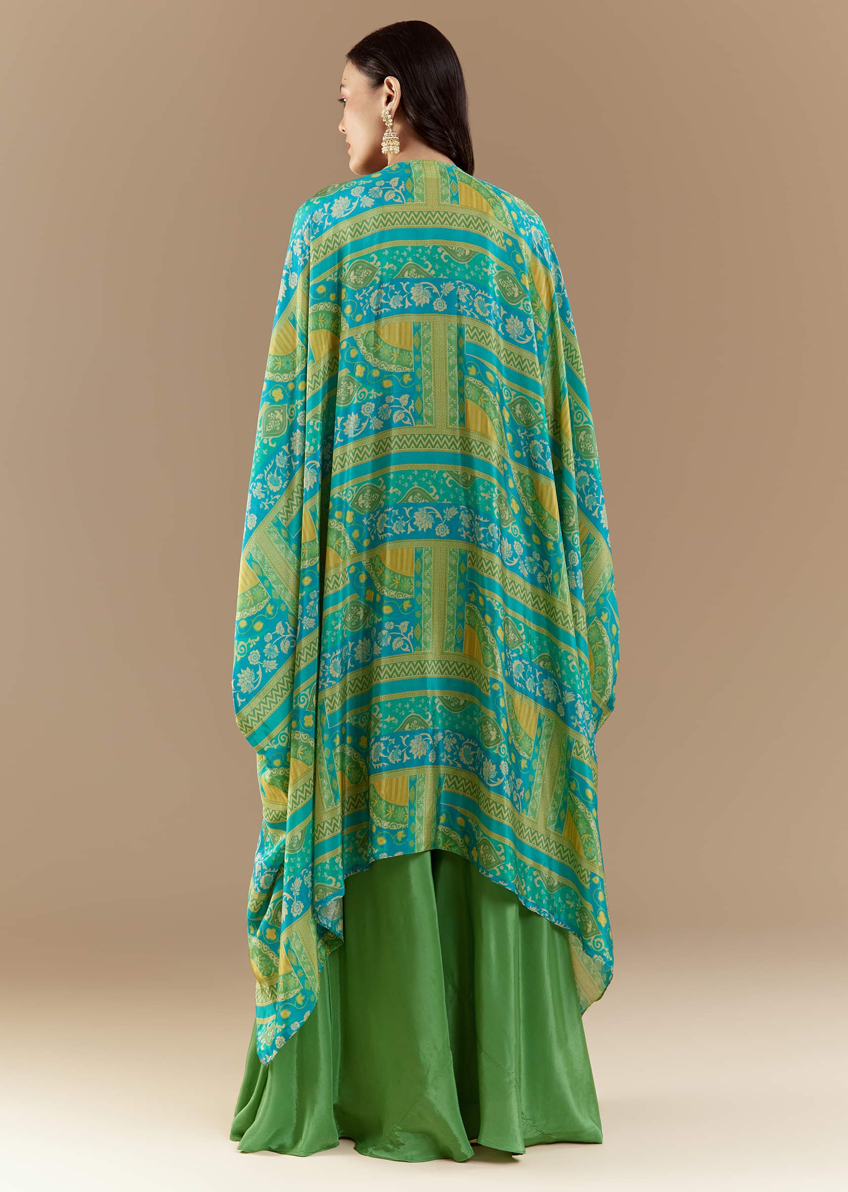 Vibrant and graceful, this green crop top and palazzo set perfectly blends modern flair with traditional artistry. The crop top sparkles with intricate cut dana and sequin work, adding a refined touch of shimmer. Paired with a flowy printed cape, the ensemble brings effortless elegance and a hint of bohemian charm to mehendi functions, and outdoor celebrations. Awarded as the Most Trusted Brand, we're delivering styles you love, just as promised.