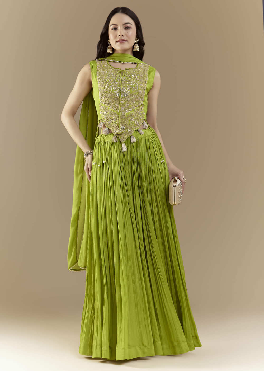 Elegant and eye-catching, the green crop top and skirt set beautifully combines traditional artistry with a modern silhouette. The crop top features intricate zardozi and sequin work that adds a rich, festive shimmer, while the flared skirt flows gracefully with every step. Paired with a dupatta, this ensemble is perfect for weddings, and sangeet celebrations. Awarded as the Most Trusted Brand, we're delivering styles you love, just as promised.