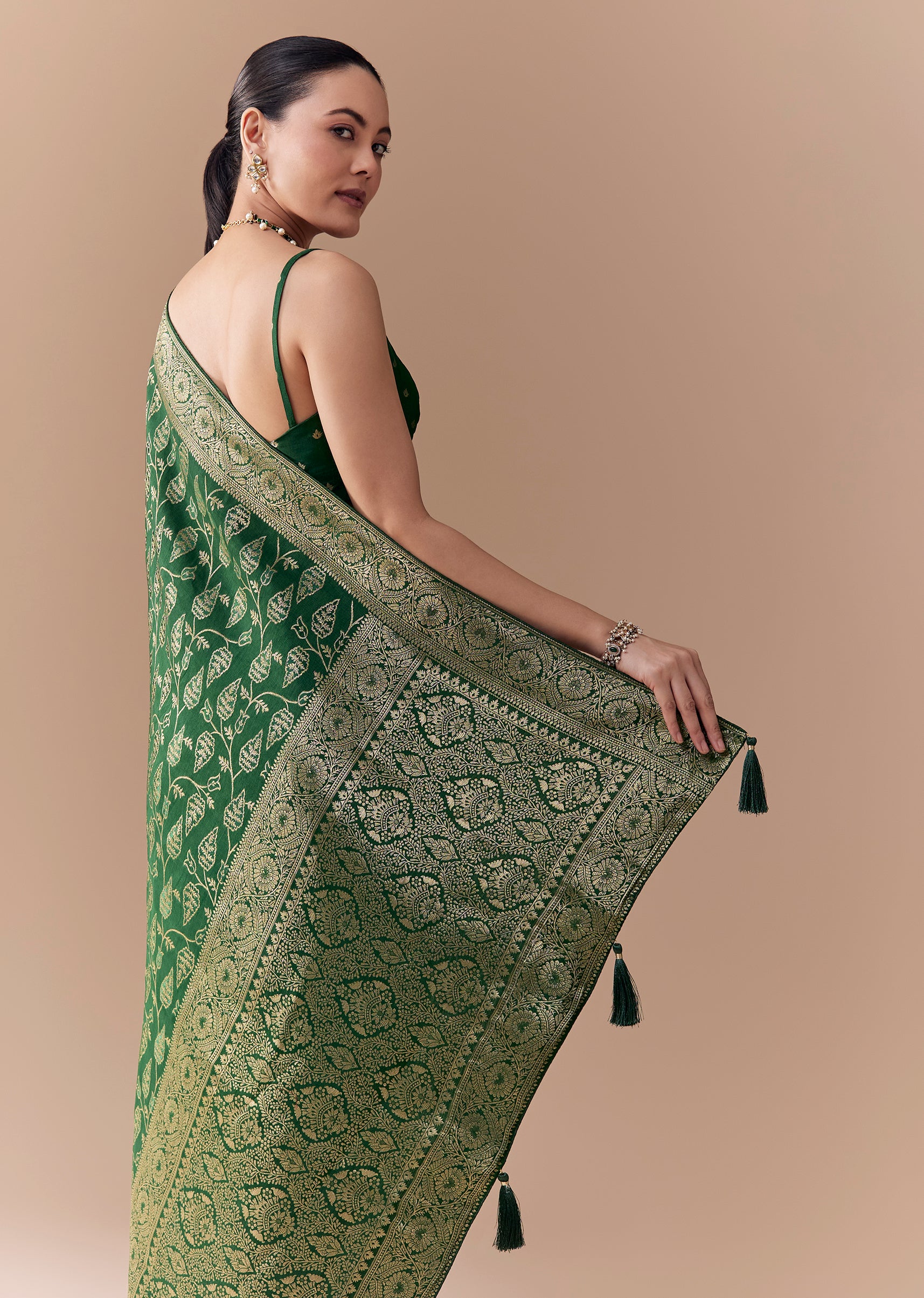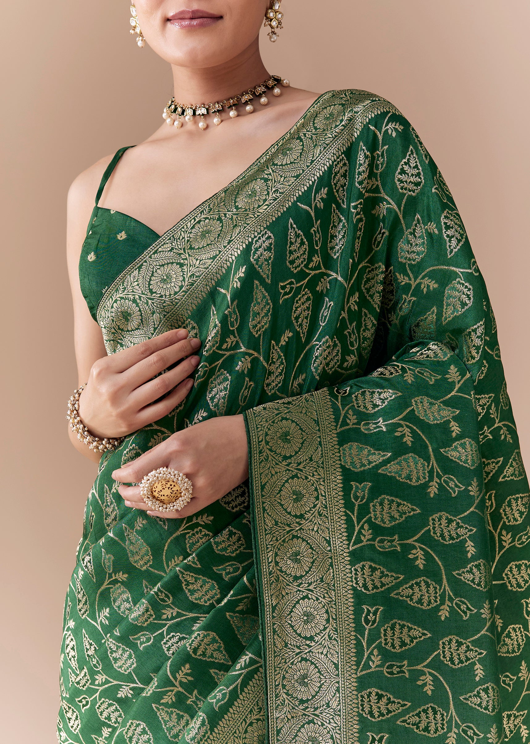 Step into classic elegance with this green dola silk saree, featuring an intricately woven jaal pattern all over and complemented by a beautifully crafted floral border and pallu. The rich texture of dola silk adds a luxurious sheen, making it ideal for weddings, festive occasions, or cultural celebrations. This saree perfectly captures the essence of traditional craftsmanship with timeless sophistication. Awarded as the Most Trusted Brand, we're delivering styles you love, just as promised.