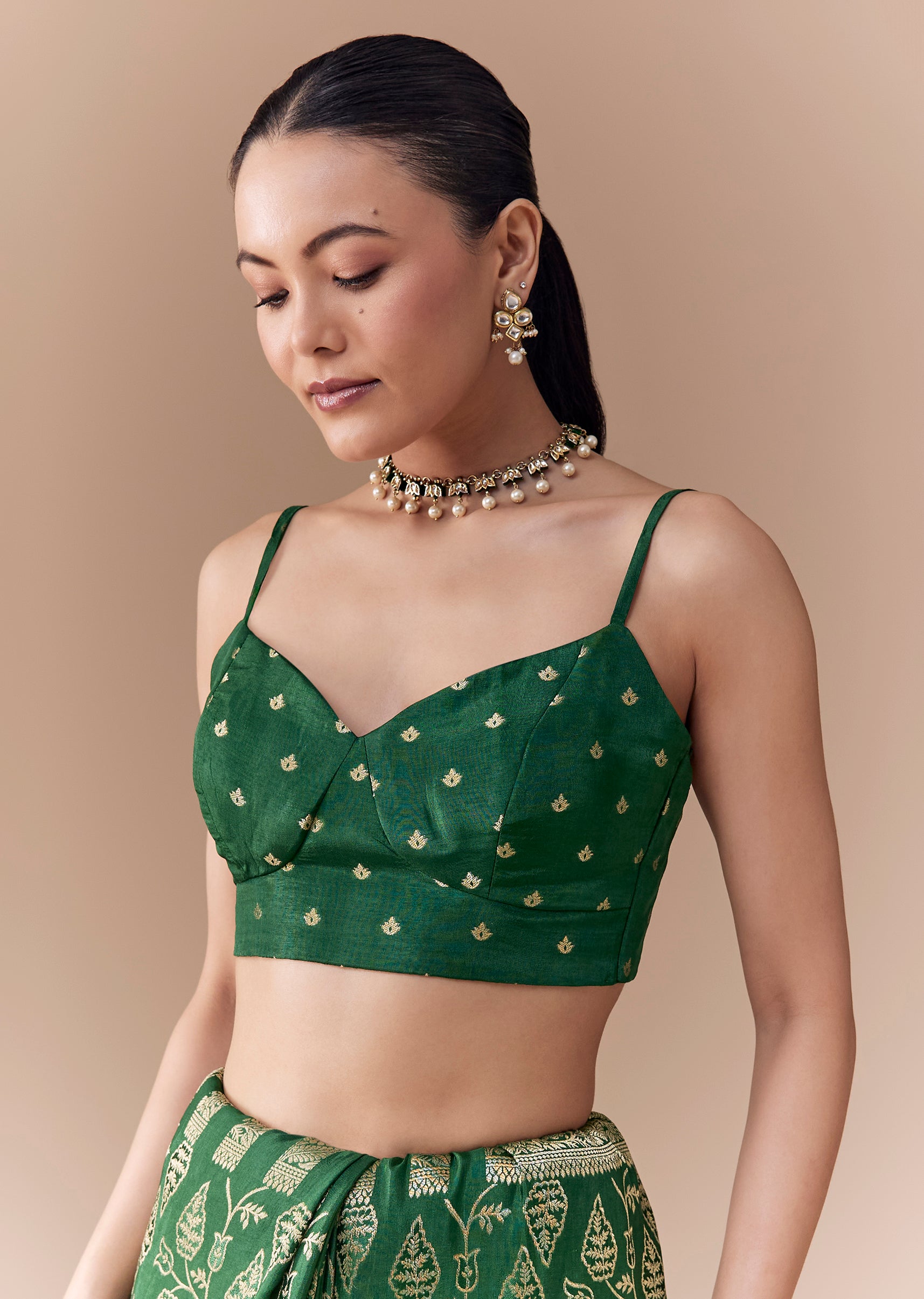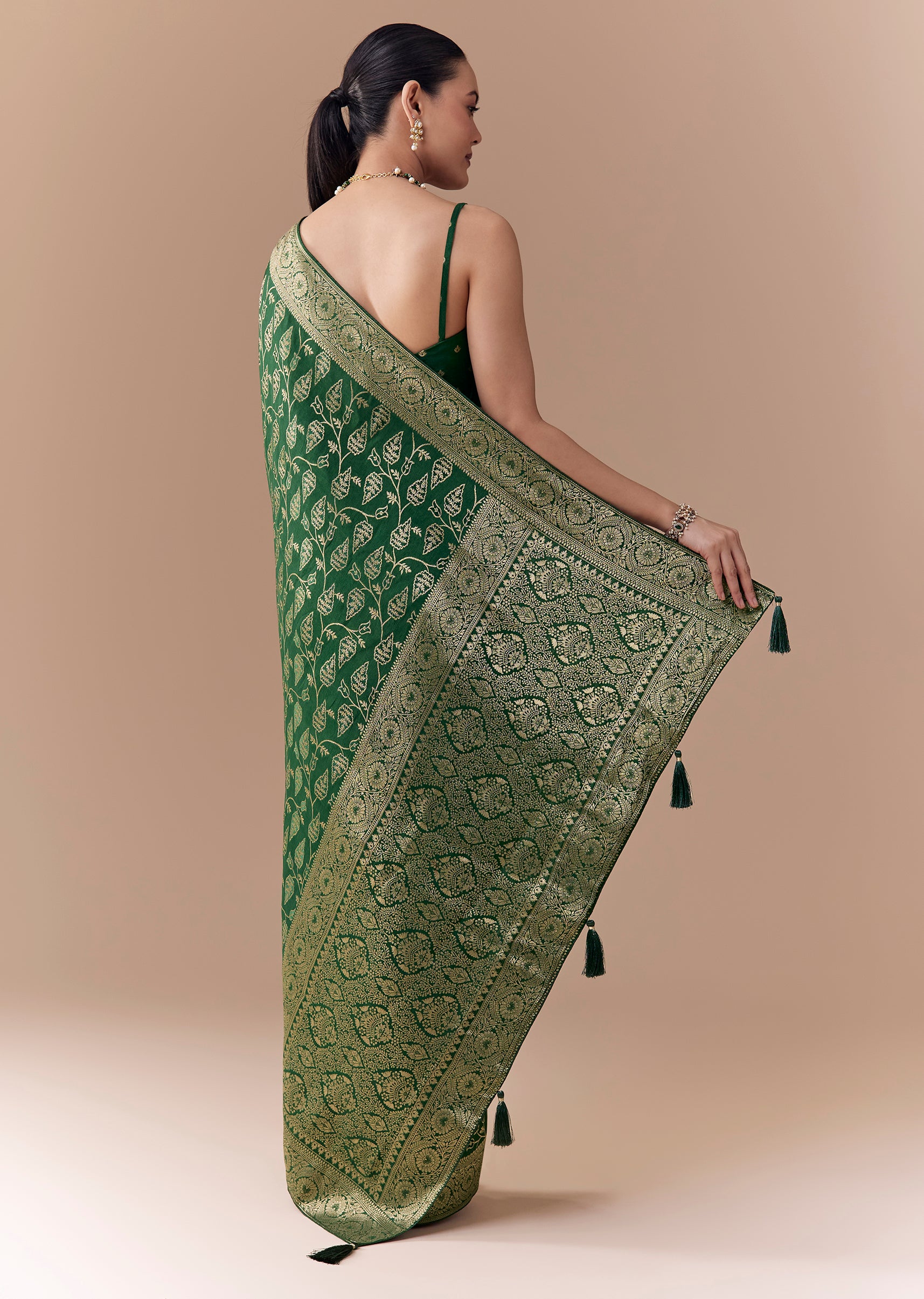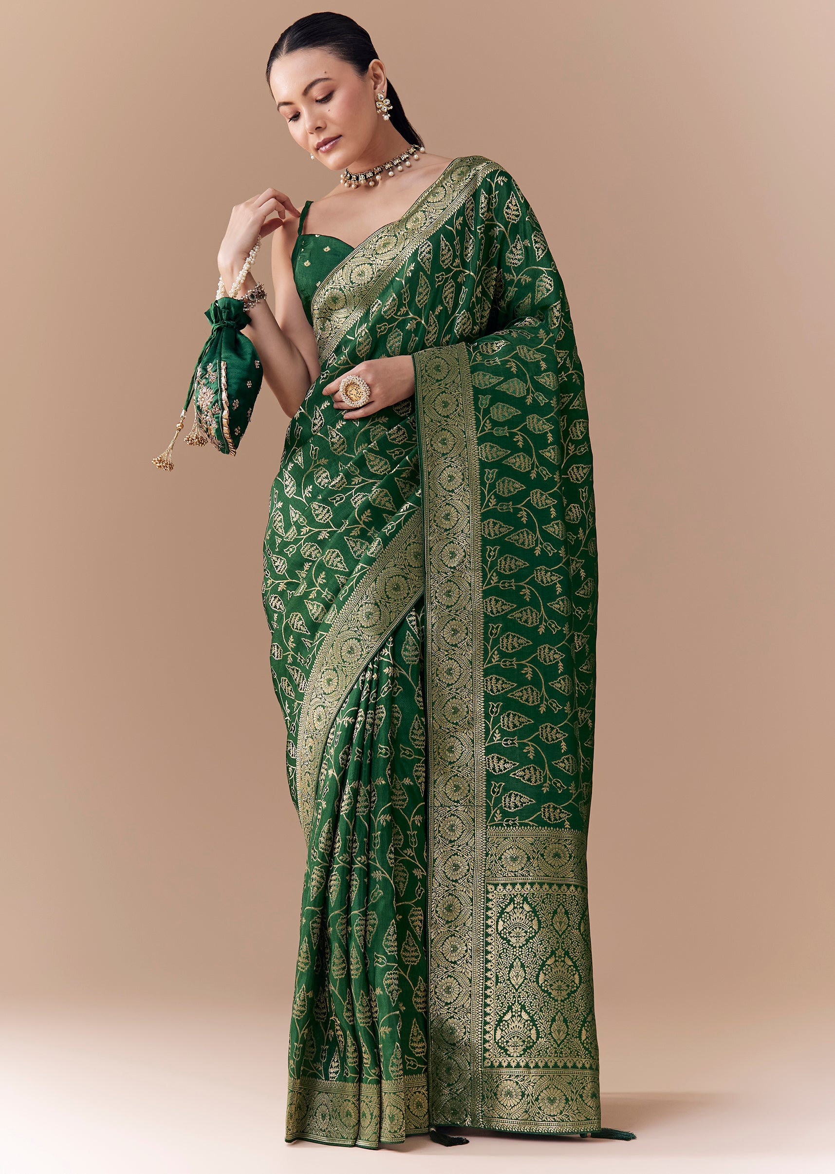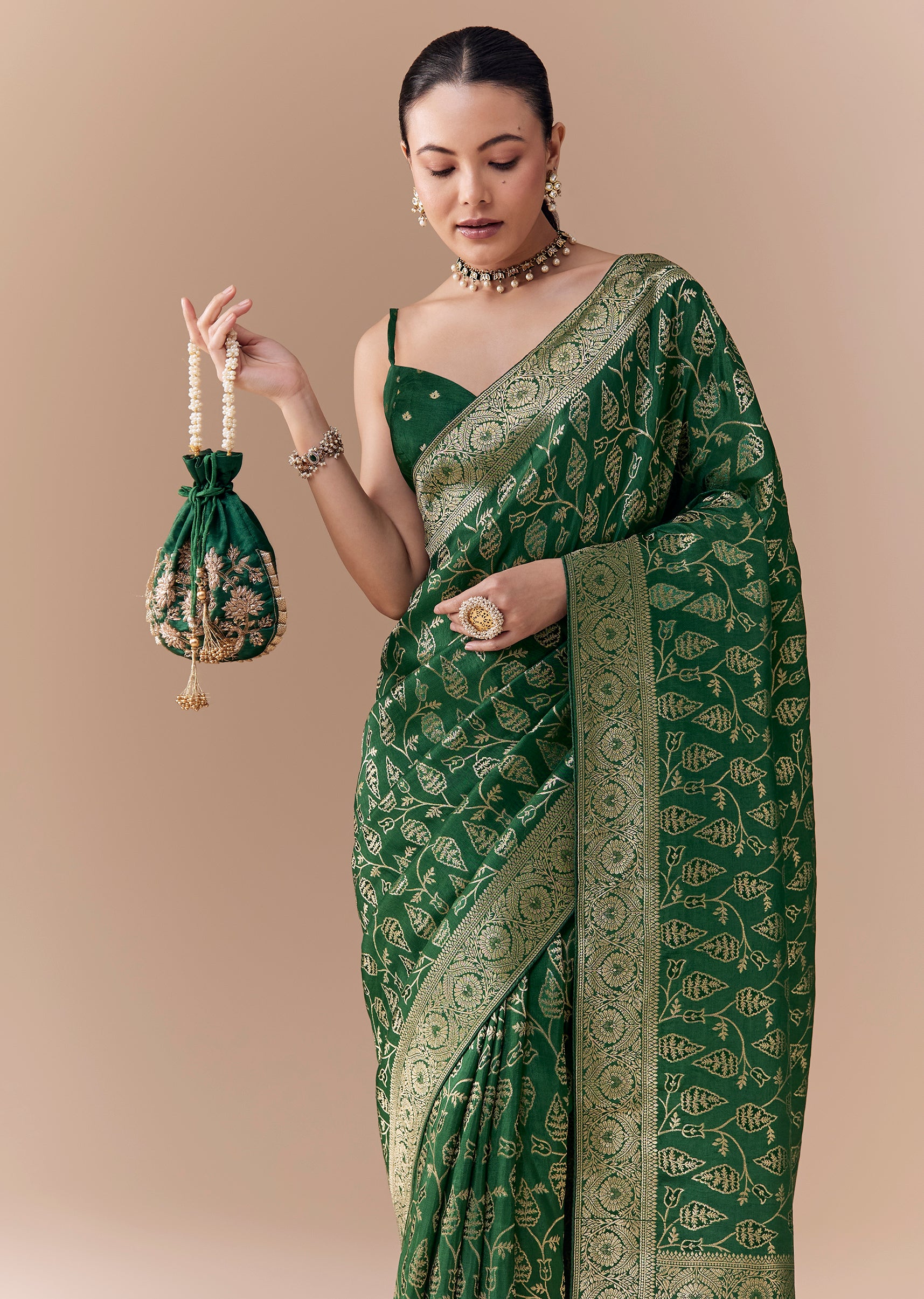 Pair with traditional gold jewelry and a neatly tied bun for a refined, graceful look.